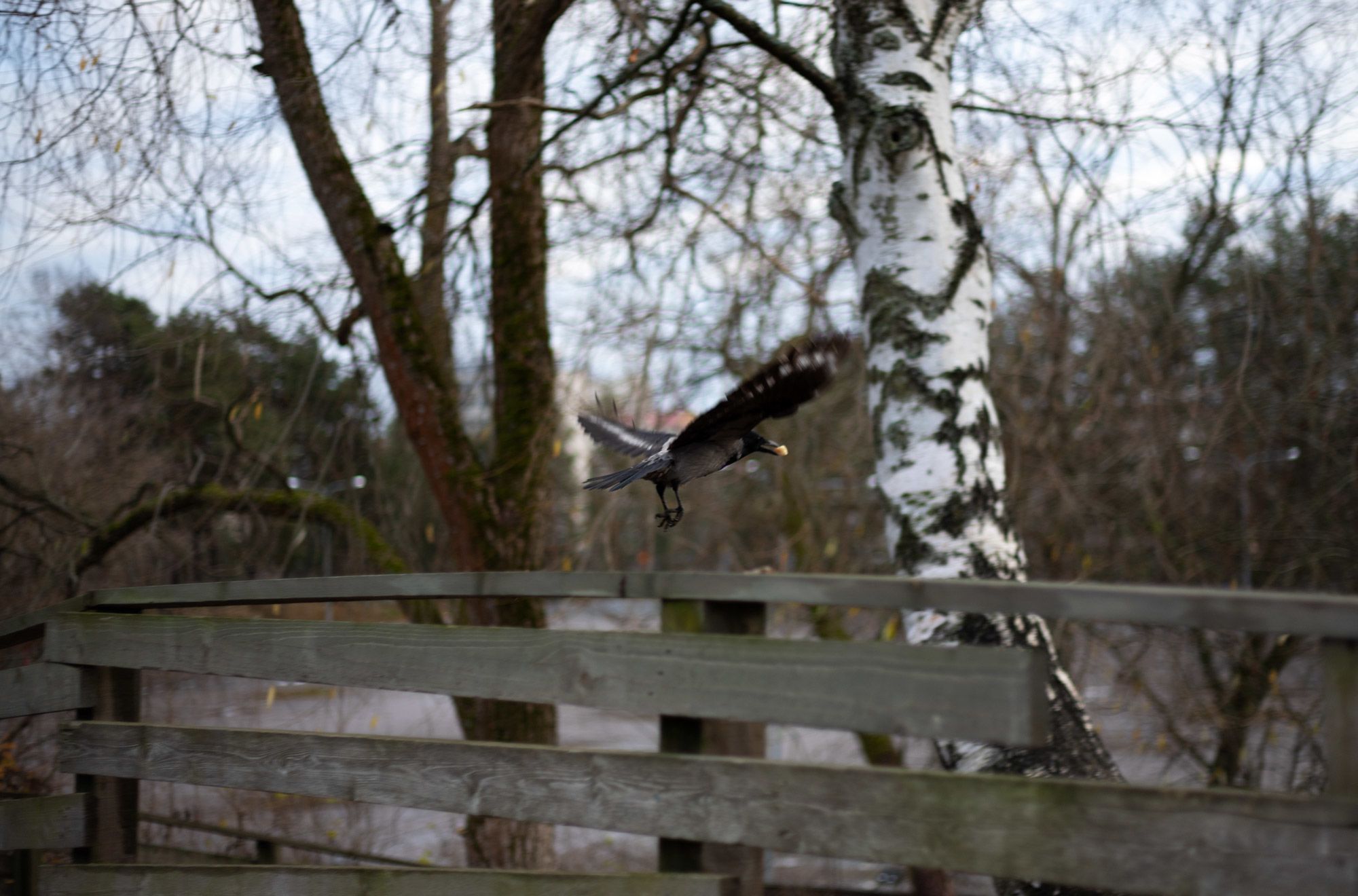 Kun vuohia johdatellaan leipäpalasilla takaisin aitaukseen, paikalle lehahtaa kaksi varista.