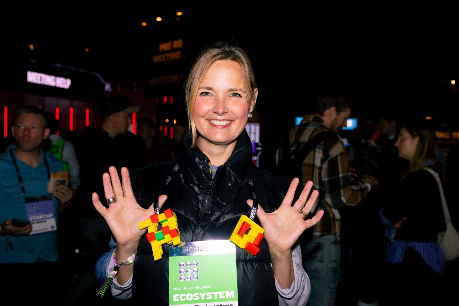 Tapahtumalavojen lisäksi tilaa täyttävät kymmenet markkinakojut ja ständit. Karkkia, jäähilejuomaa ja pelejä. Slush on kuin suuren mittakaavan leikkikenttä aikuisille. Samaa mieltä on lelualalla yli 20 vuotta toiminut Helena Perheentupa, joka on tullut edustamaan biohajoavia lelupalikoita kehittelevää kasvuyritystään.