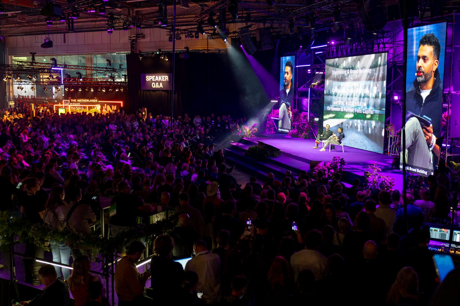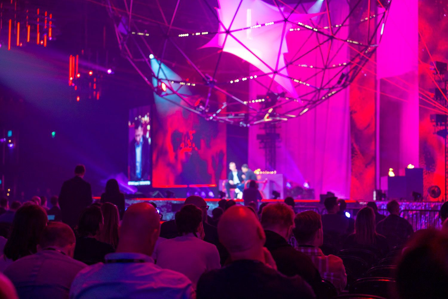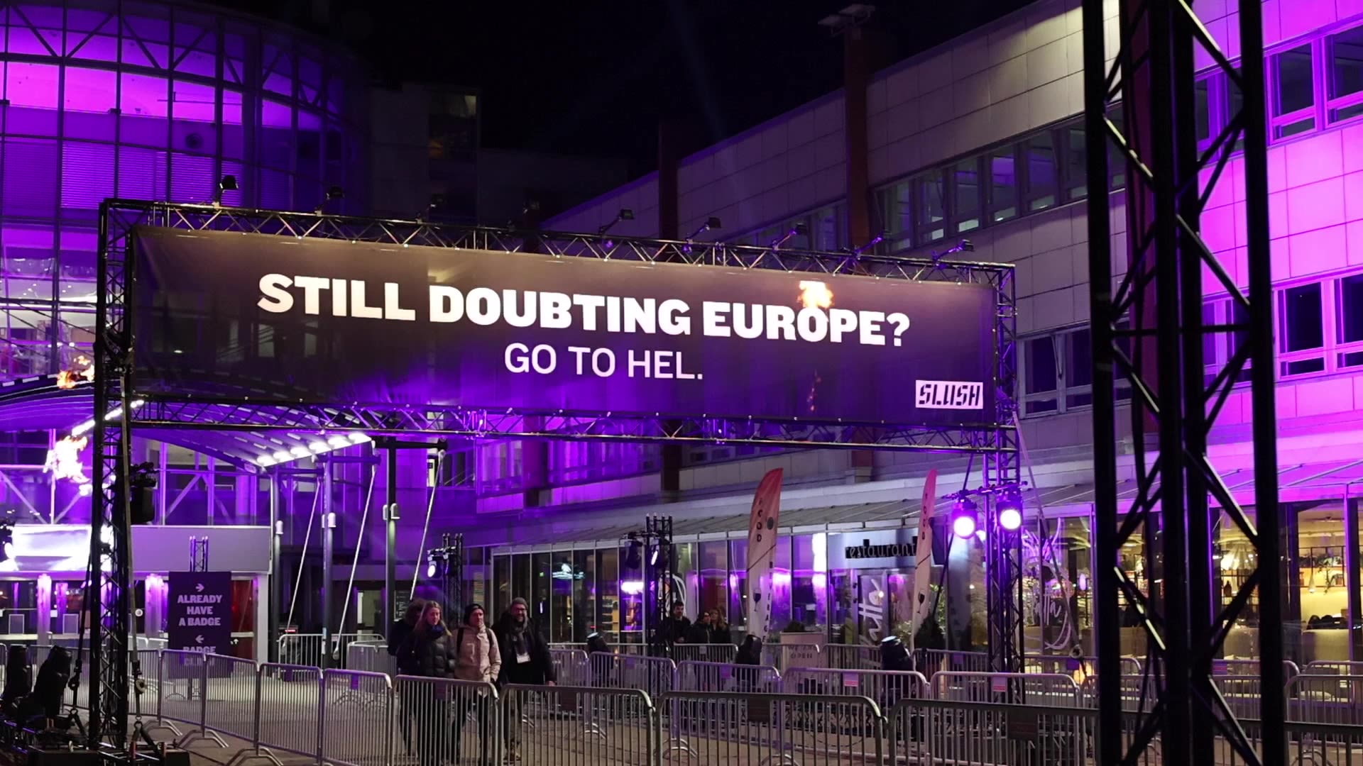 Ledivaloja, jatkuvaa puheensorinaa ja neljä eri lavaa, joissa kaikilla tapahtuu jatkuvasti jotain. Myös päälavaa ympäröivät jo ulkona osallistujia tervehtineet tulenlieskat. Tämä on Slush.