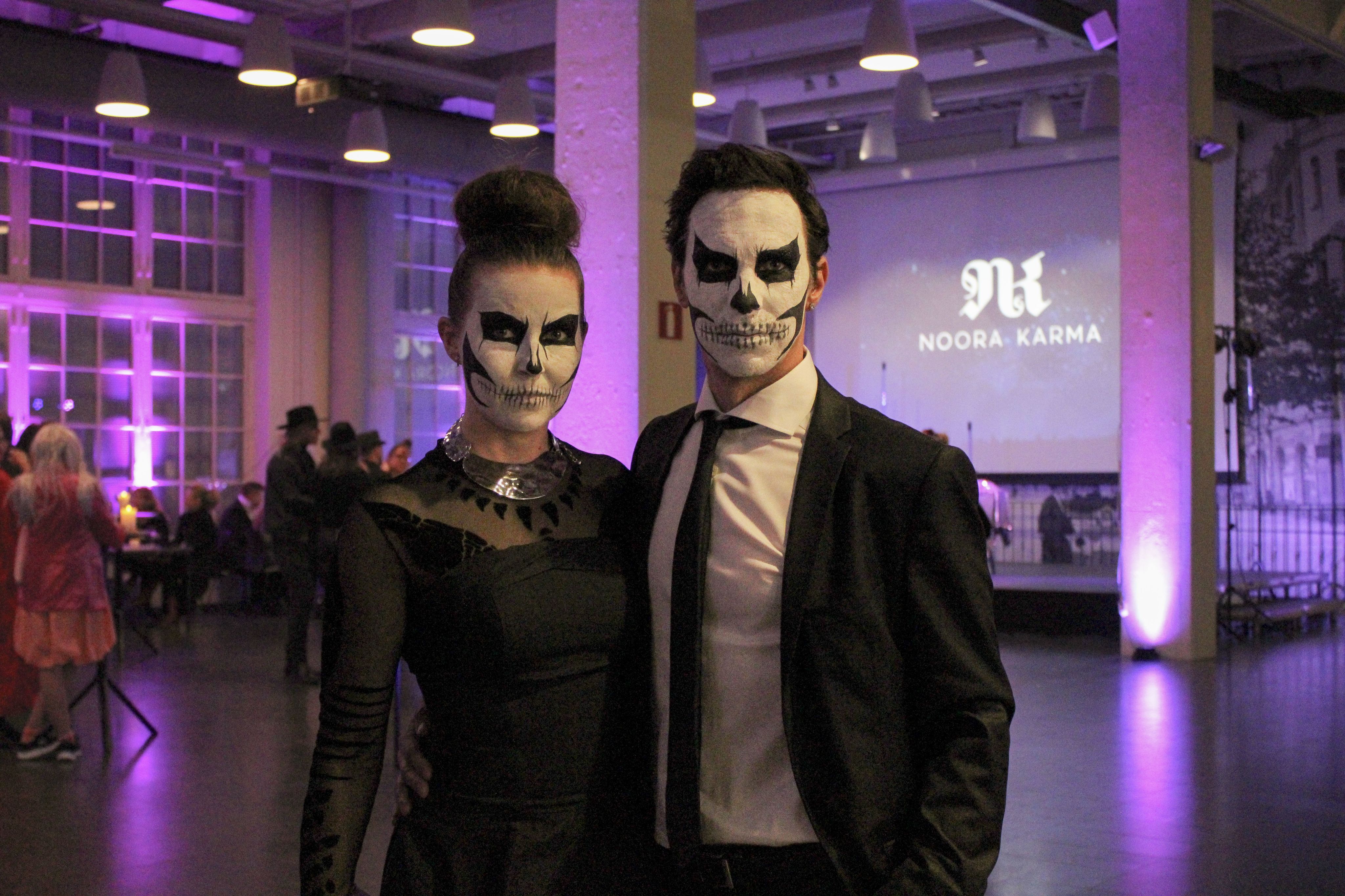 Laura Ahonen ja Jarno Peltokangas ovat saapuneet naamiaisiin pääkallomaisin kasvomeikein ja kokomustin asuin.