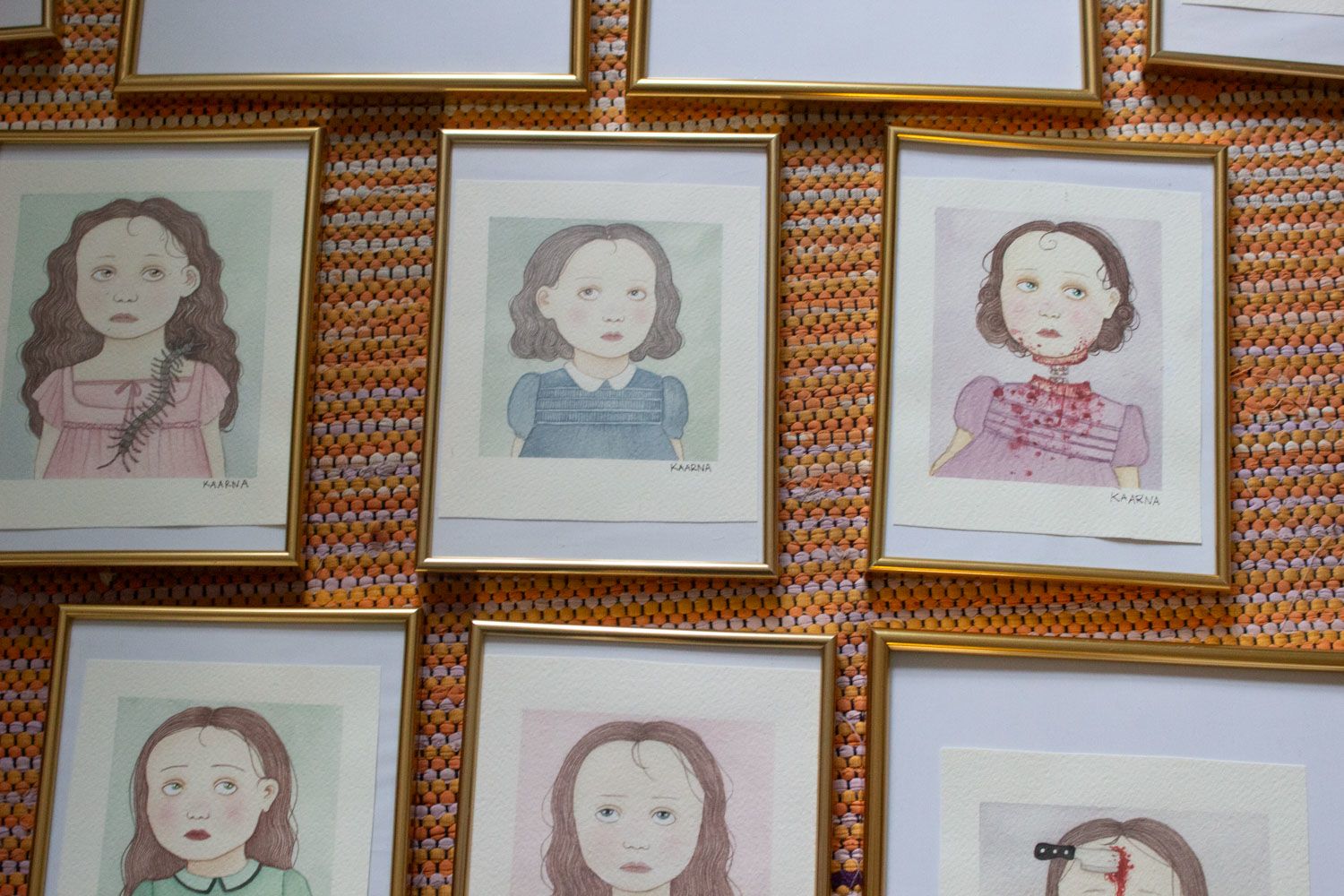 Kaarna istuu pöytänsä ääressä katse liimaantuneena pöydällä lepäävään paperiarkkiin. Kädet liikkuvat pienin ja tarkoin liikkein. Hän maalaa uusinta teostaan. Pieni tyttö, verinen nenä ja mustelmaiset kasvot. Hän kaivaa isosta Ikean kassista liudan eri kokoisia teoksia. Ensivilkaisulla ne näyttävät samanlaisilta, mutta jokaisella niistä on oma tarinansa. Kaikkiin pakattu saman henkilön kokemukset. Ne ovat omakuvia. Kaarna on jokainen maalausten pienistä tytöistä.