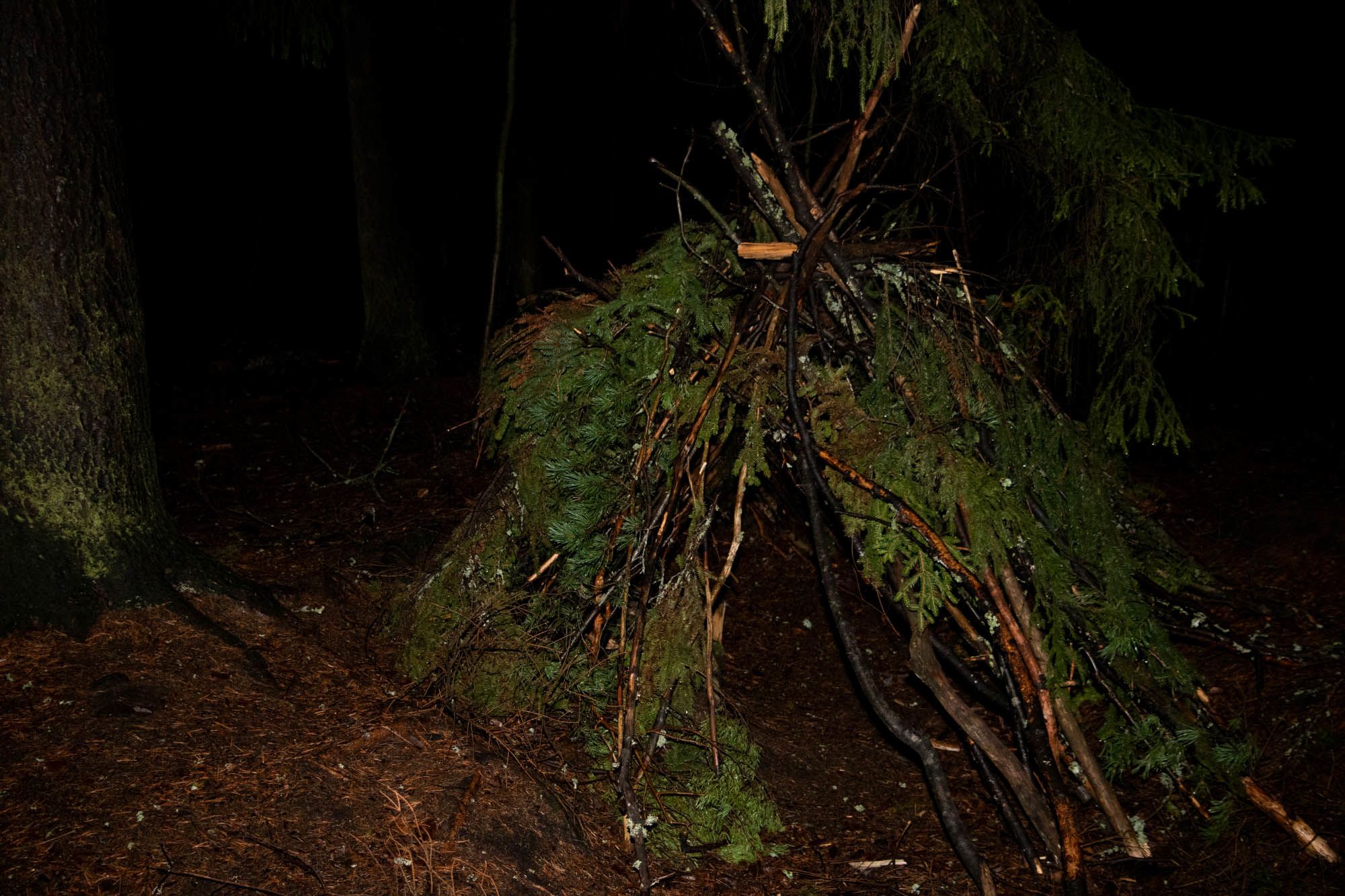 Metsän keskellä on kaksi graffitein maalattua rakennelmaa.