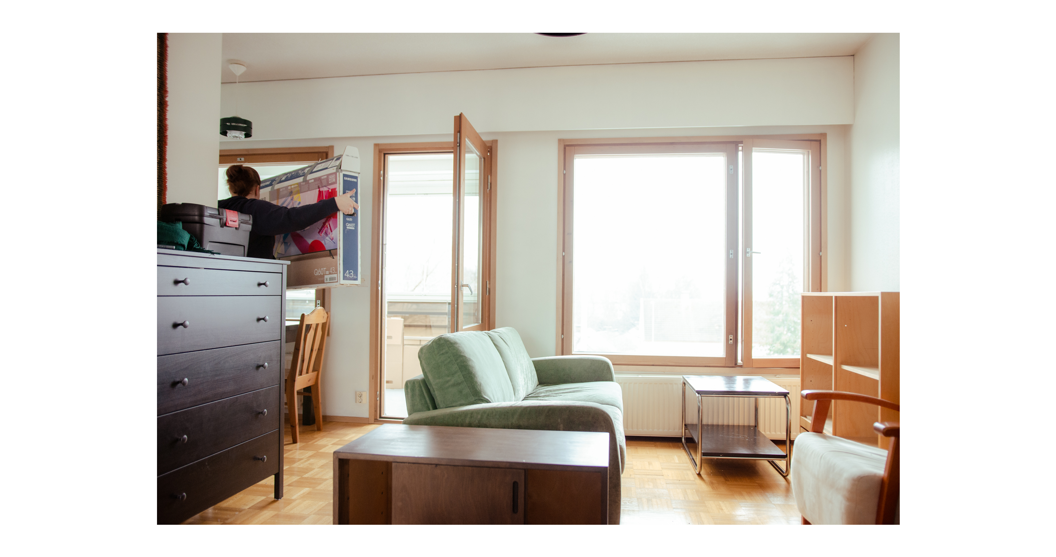 Omaisuus on pakattu laatikoihin, ja enää vain suurimmat huonekalut odottavat isän ja pakettiauton saapumista. Muutaman tunnin päästä kuvan ottamisesta asunto on tyhjillään ja Kiia matkalla kohti Lappeenrantaa.