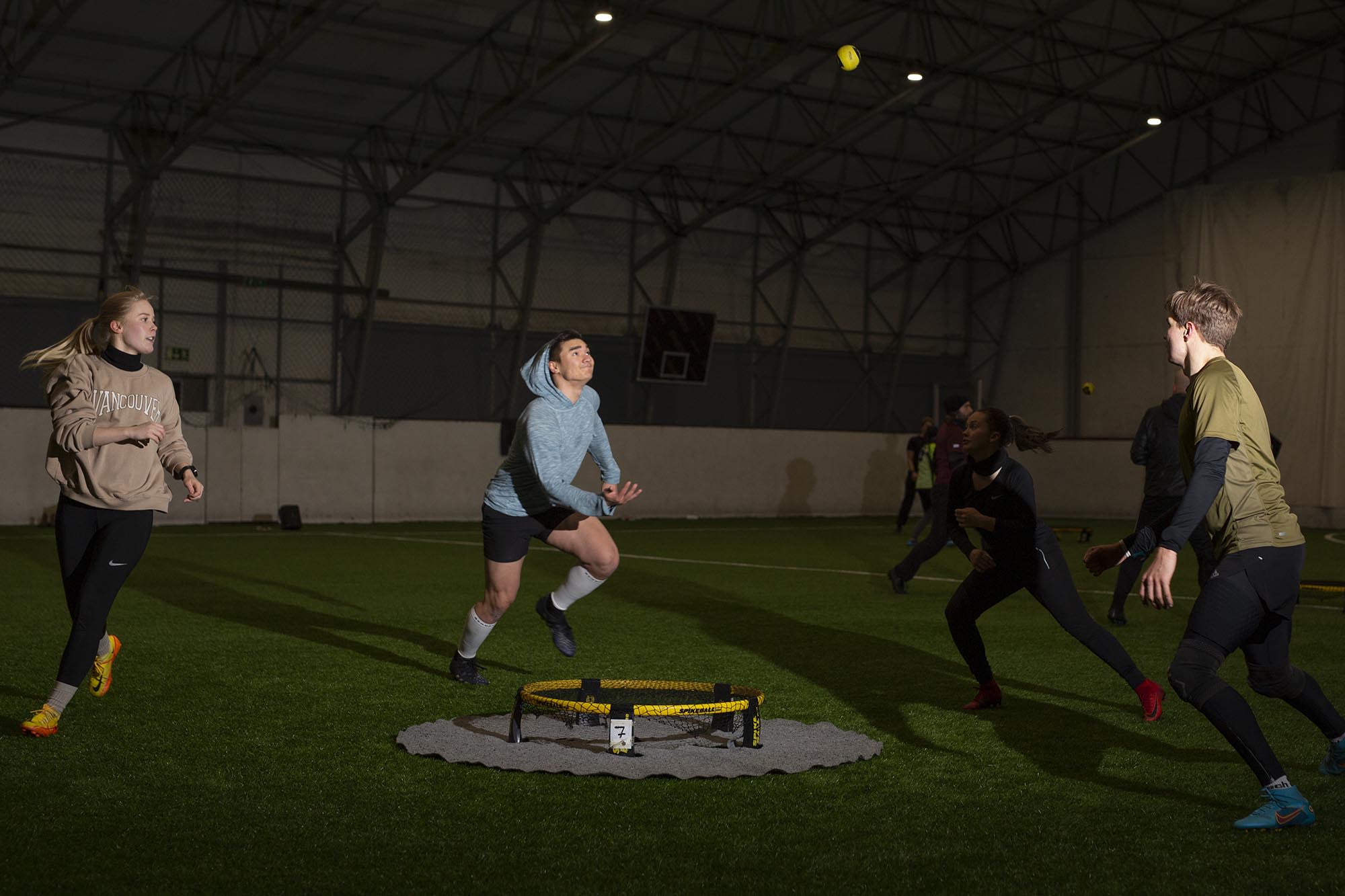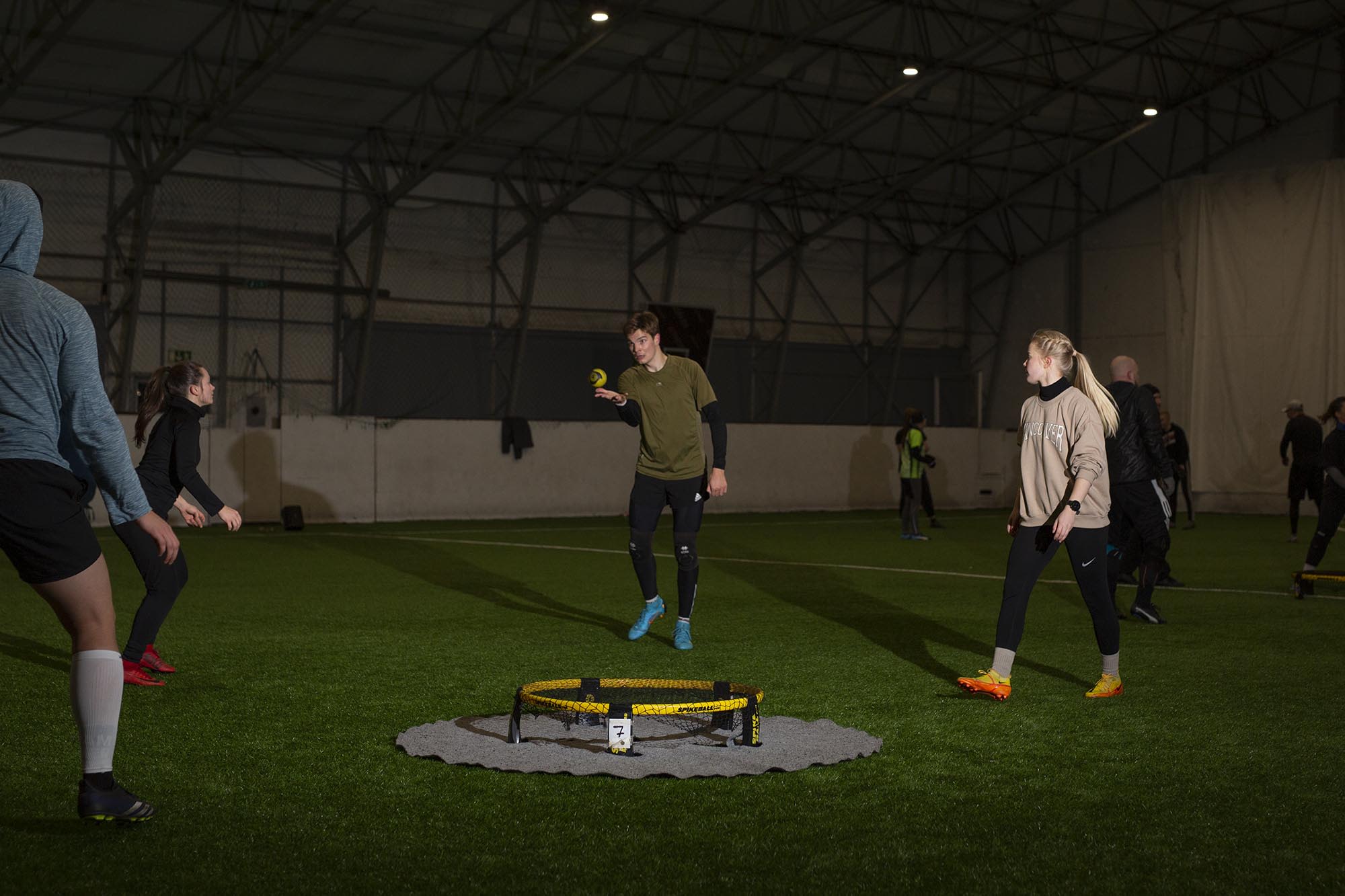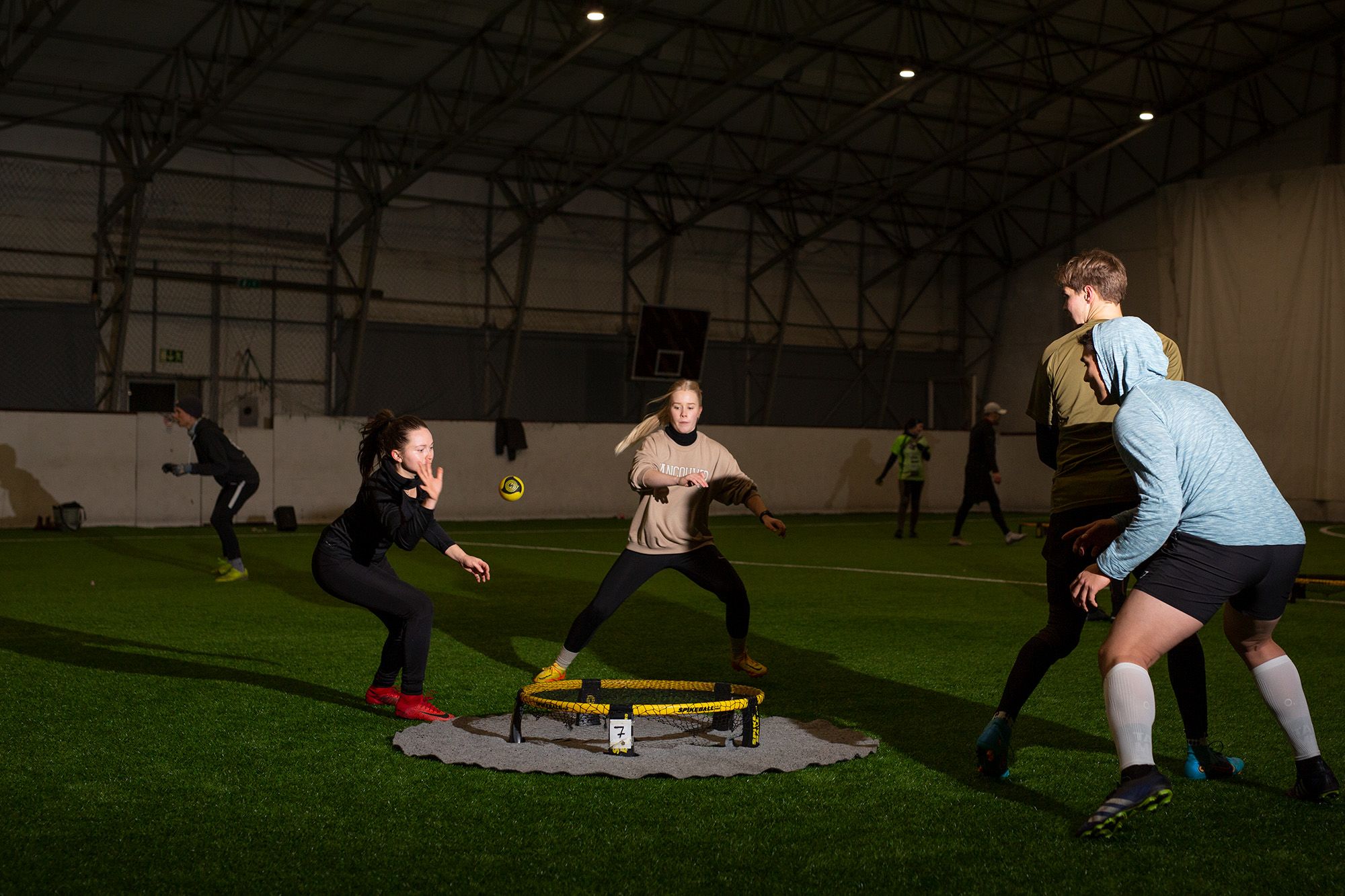 Roundnetin pelaajat paiskivat palloa Kissat-hallin urheilukeskuksessa Tampereella sunnuntaina 2. lokakuuta. Roundnetissä kaksi kahden hengen joukkuetta pelaa toisiaan vastaan. Tavoitteena on lyödä pallo verkon kautta vastustajien tavoittamattomiin.