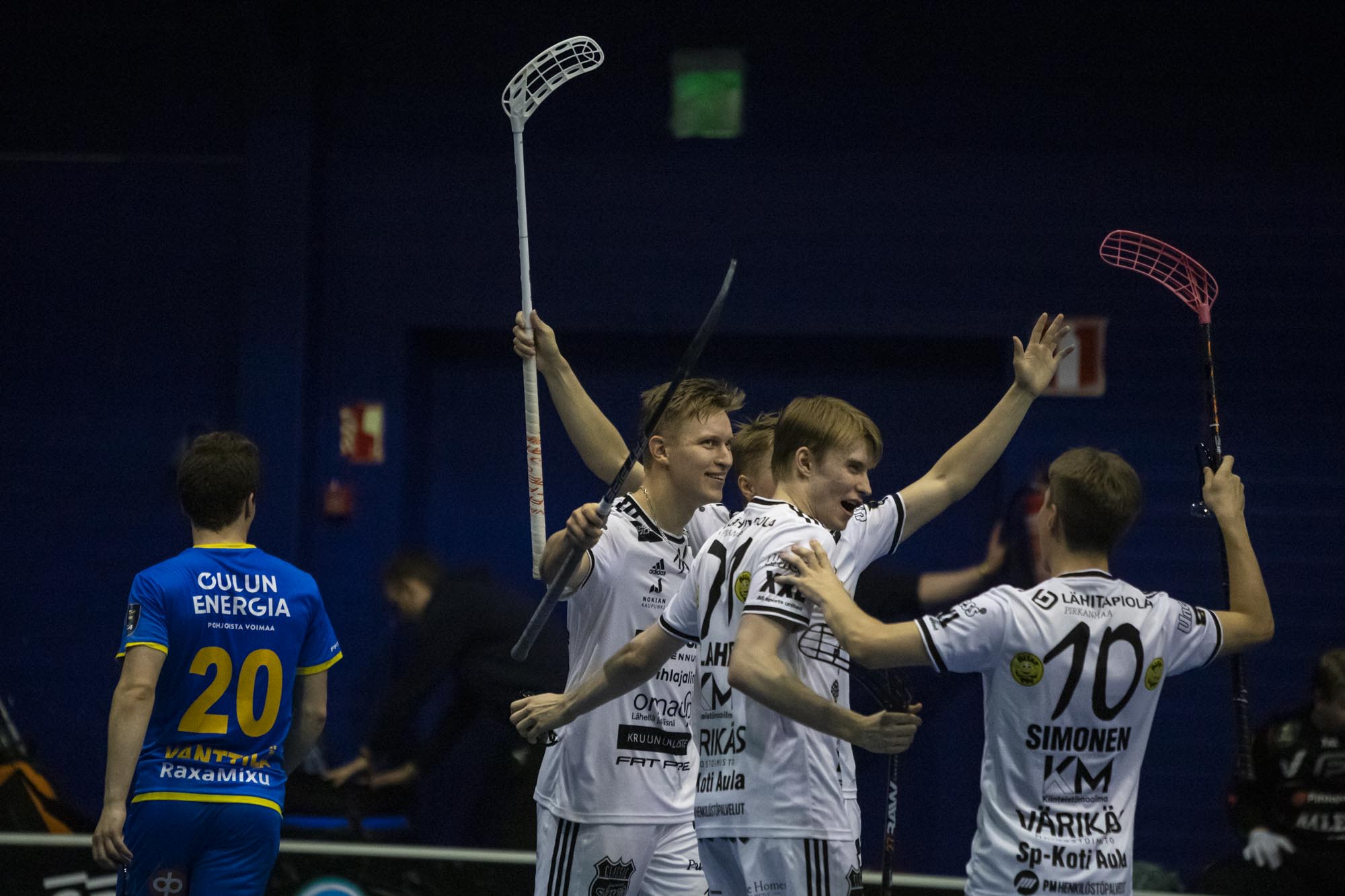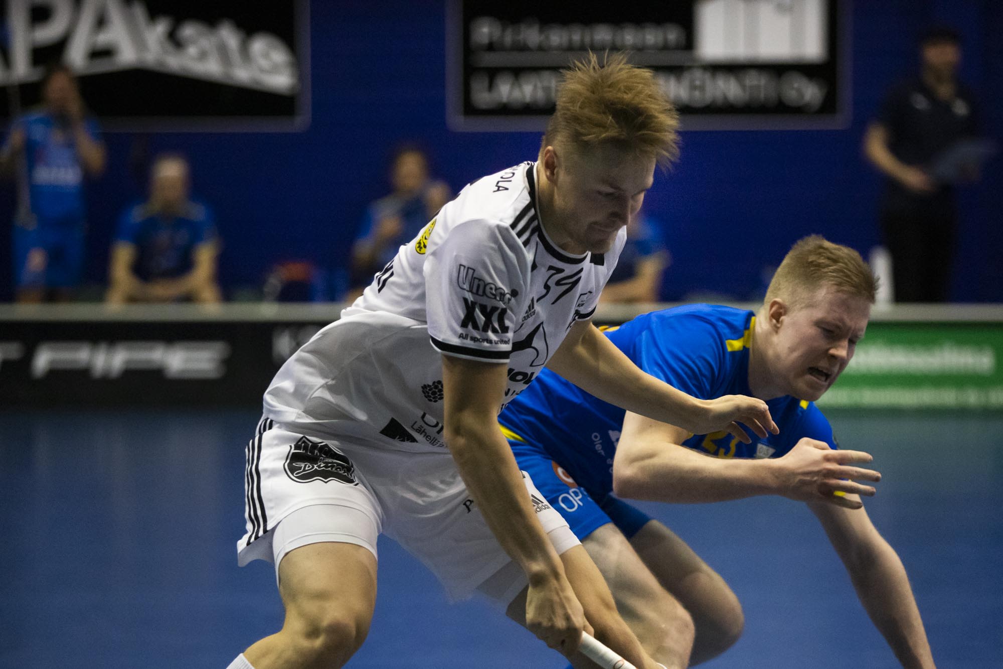 Salibandyn F-liigan kärkisijoilla keikkuva Nokian KrP taisteli rutiinivoiton kotiottelussaan Oulun Luistinseuraa OLS:aa vastaan Raholassa sunnuntaina 9. lokakuuta. Kuvassa Nokian Valtteri Viitakoski ja Oulun Olli Wikstedt.