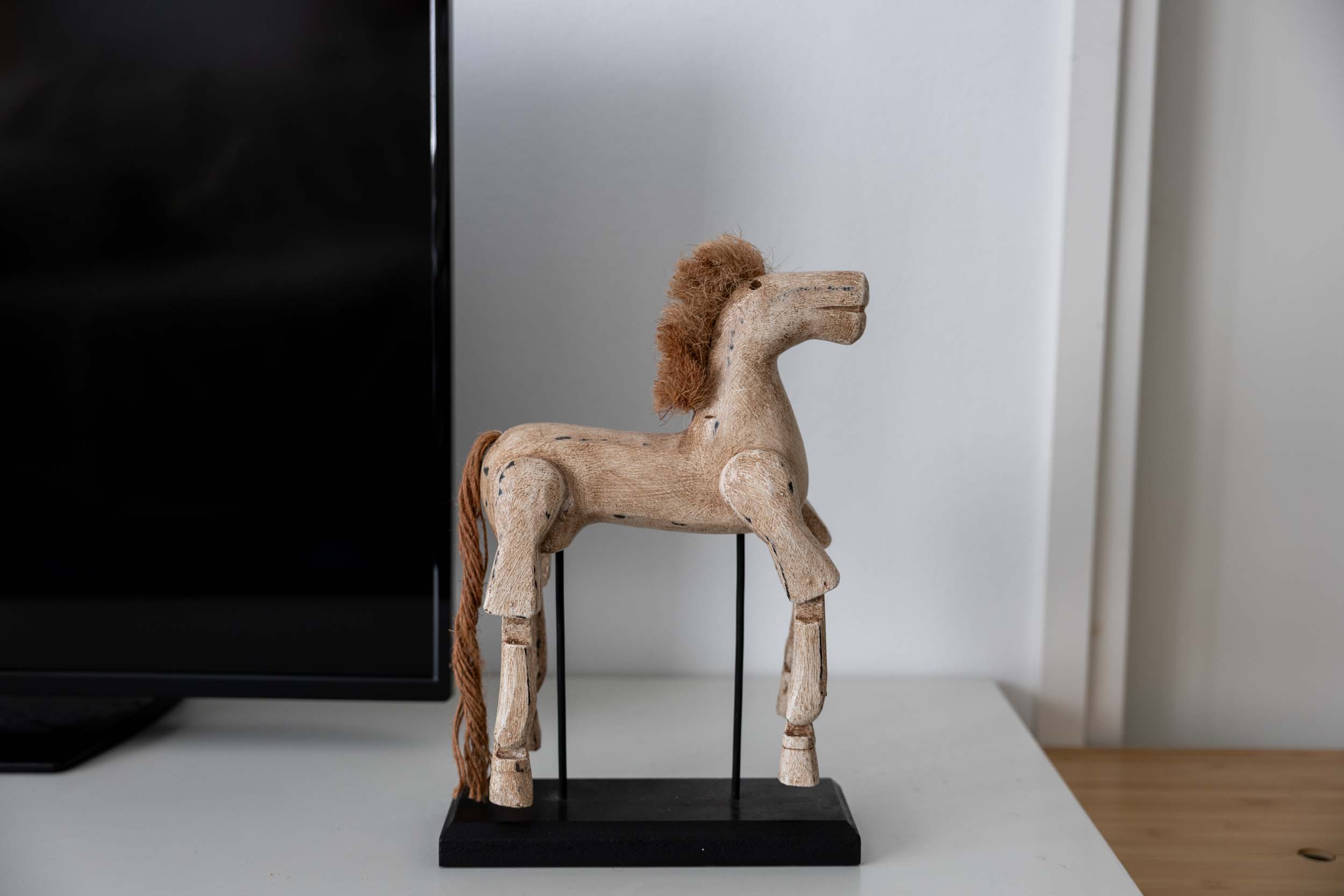 Erika Paulaniemen pienessä asunnossa huomio kiinnittyy vääjäämättä ruokapöydällä seinää vasten nojaavaan suureen maalaukseen ja siinä olevaan vaaleaan suomenhevoseen, jolla on lempeä katse.