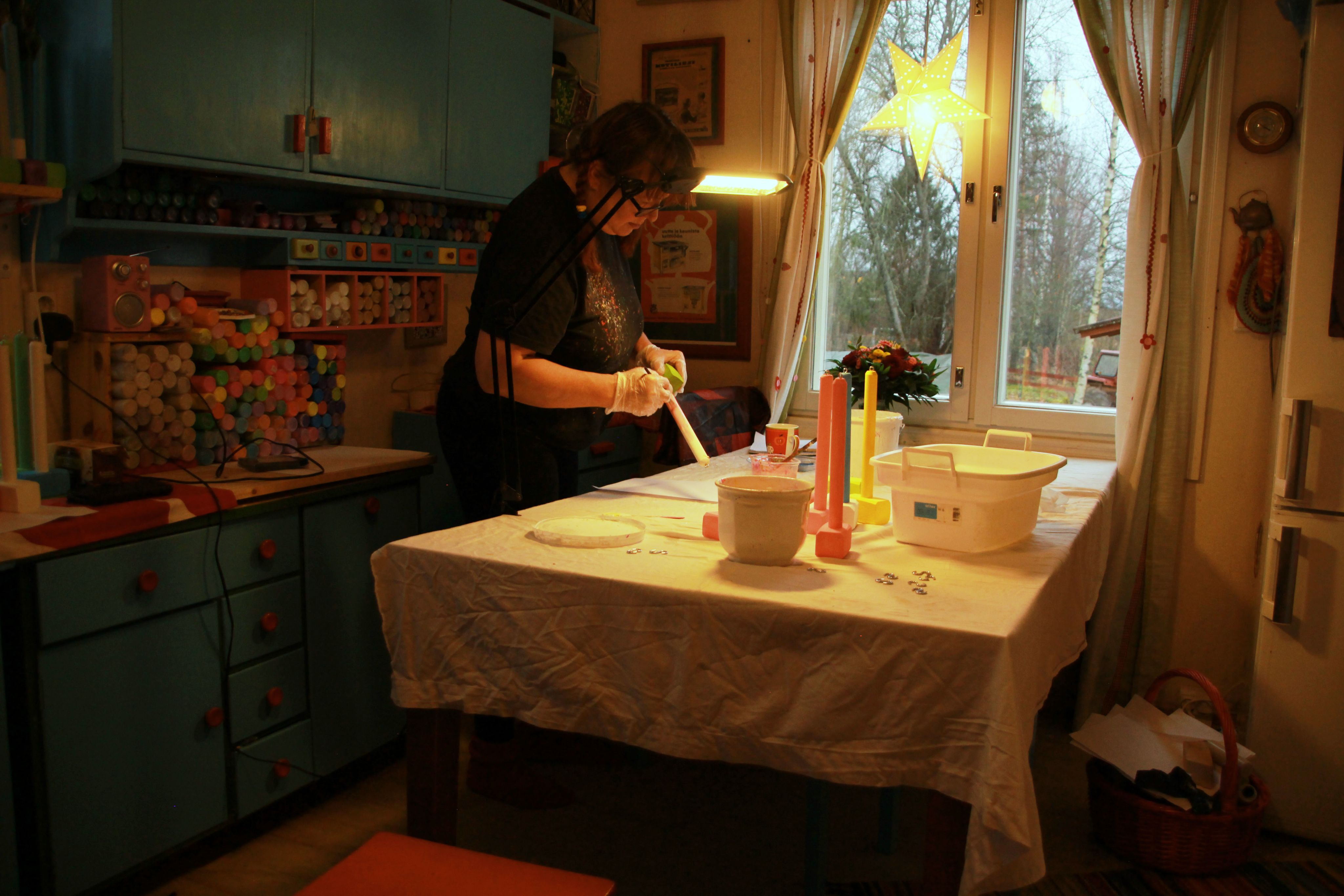 Valmiit nuijat odottavat pahvisissa hedelmälaatikoissa tuvan lattialla. Nuija tuntuu sileältä käteen, värien päällä on kiiltävä ja kimaltava pinnoite.