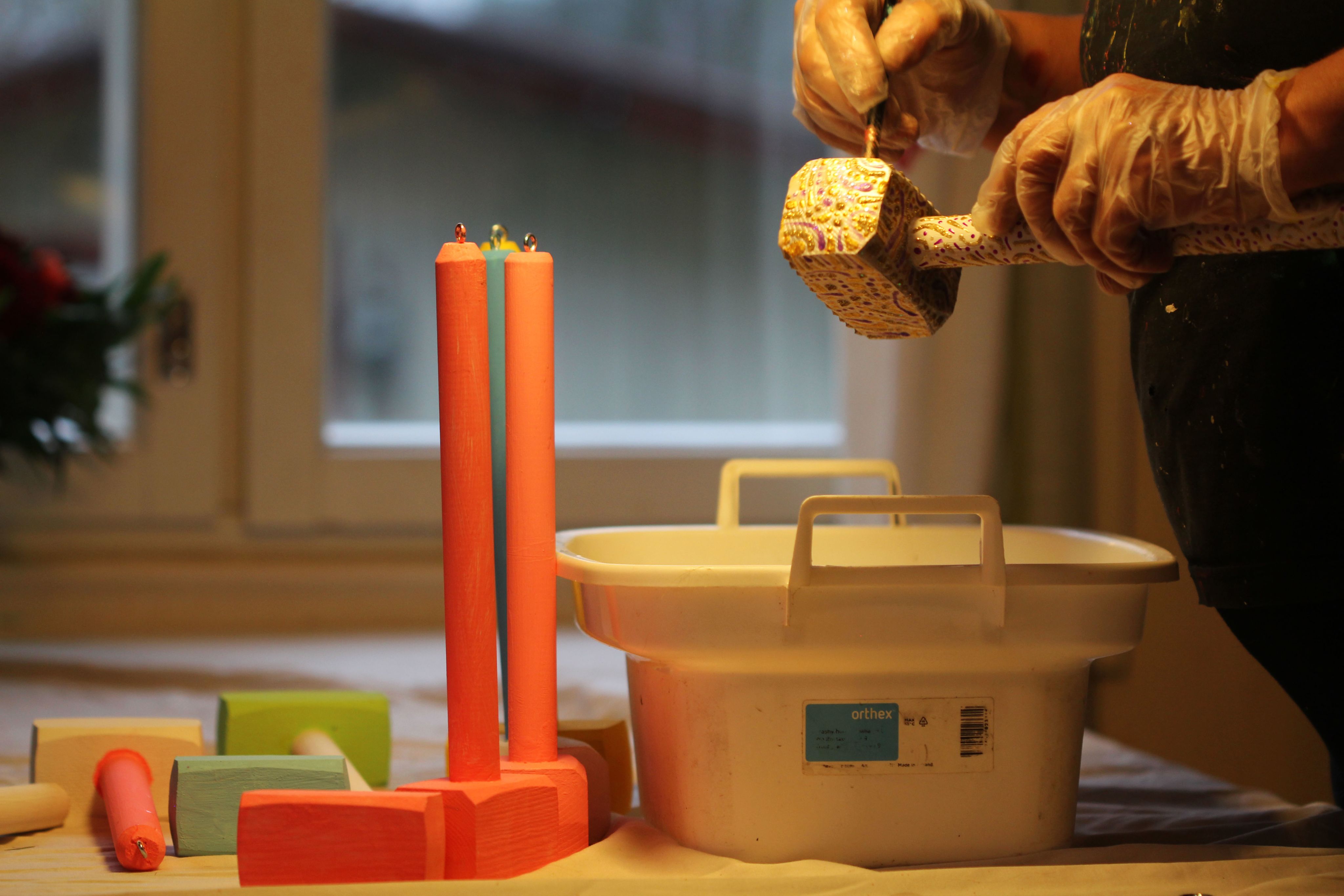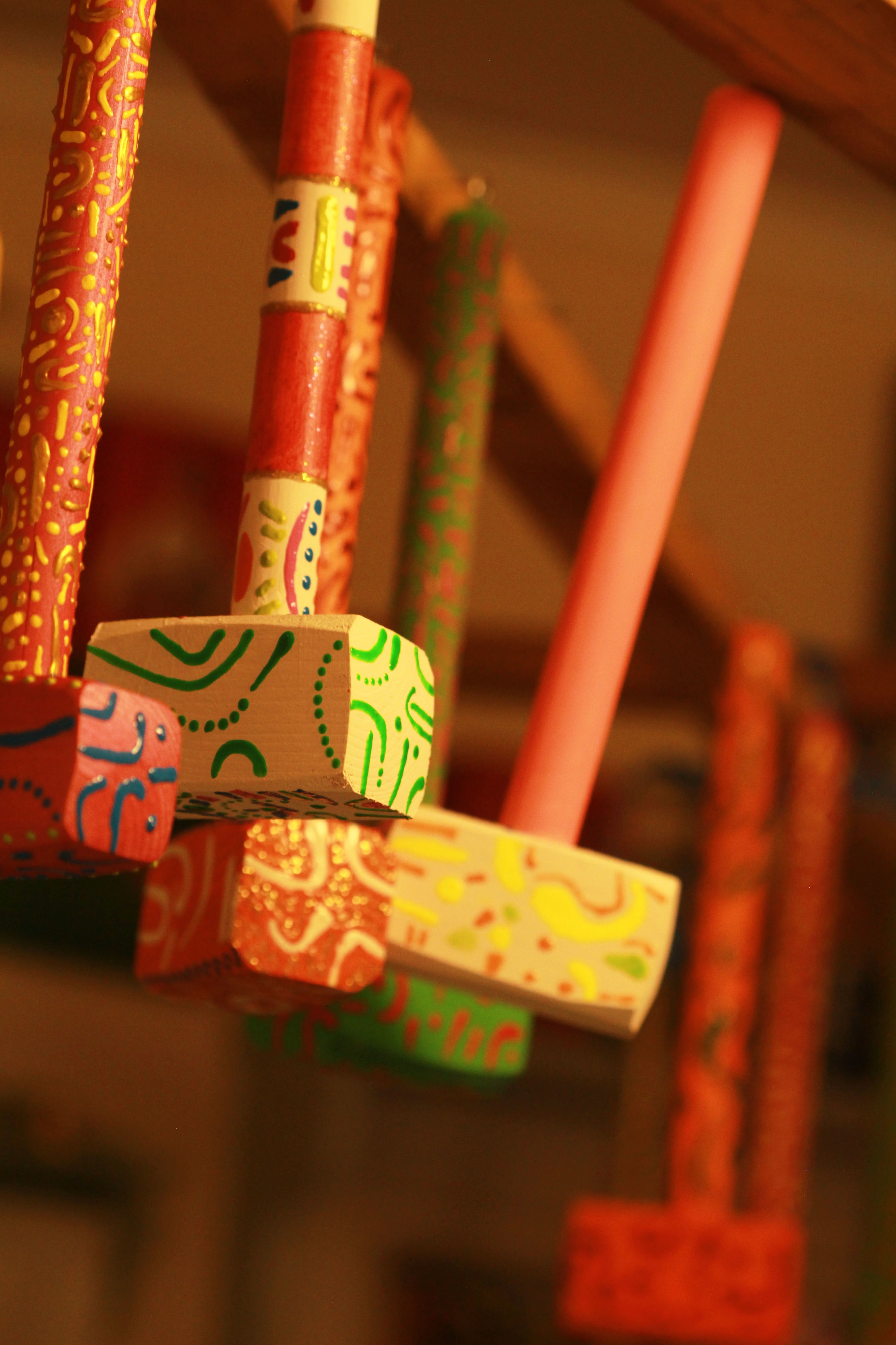 Toinen toistaan värikkäämpiä puunuijia riippuu katosta heleissä riveissä. Nuijien jono seuraa ikkunanviertä ja jatkuu keittiön työtasolle. Seinää peittävät maalipurkit.