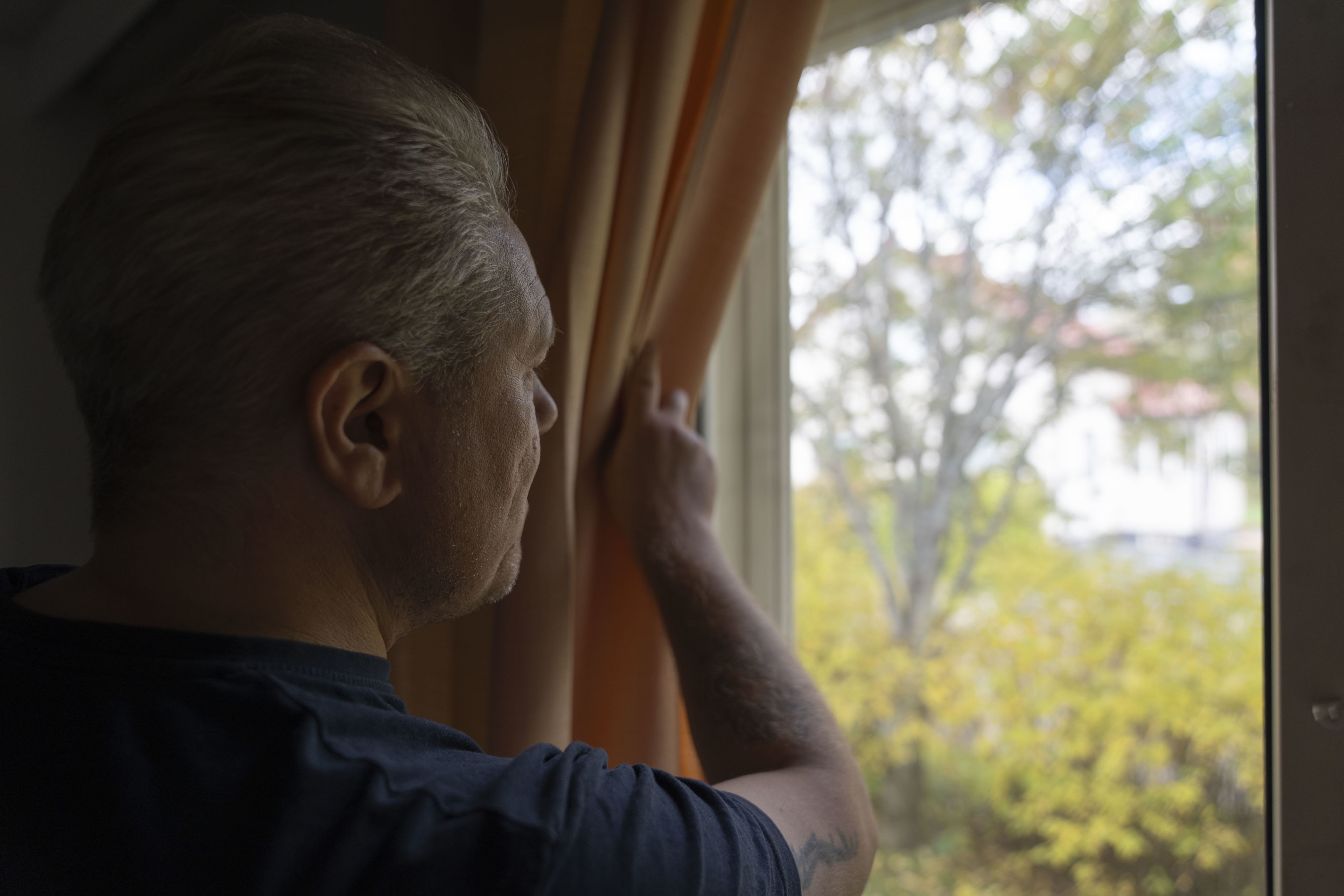 Mikko istuu sohvalle huoneessa, jonka paksut ikkunaverhot estävät päivänvalon pääsyn sisään. Huonekaluja on vähän: sohva, pieni pöytä ja televisiotaso. Aikaisemmin Mikko oli katsonut suoratoistopalvelua, mutta on nyt sammuttanut television. Musta ruutu heijastaa vain kattolampun keltaista valoa.