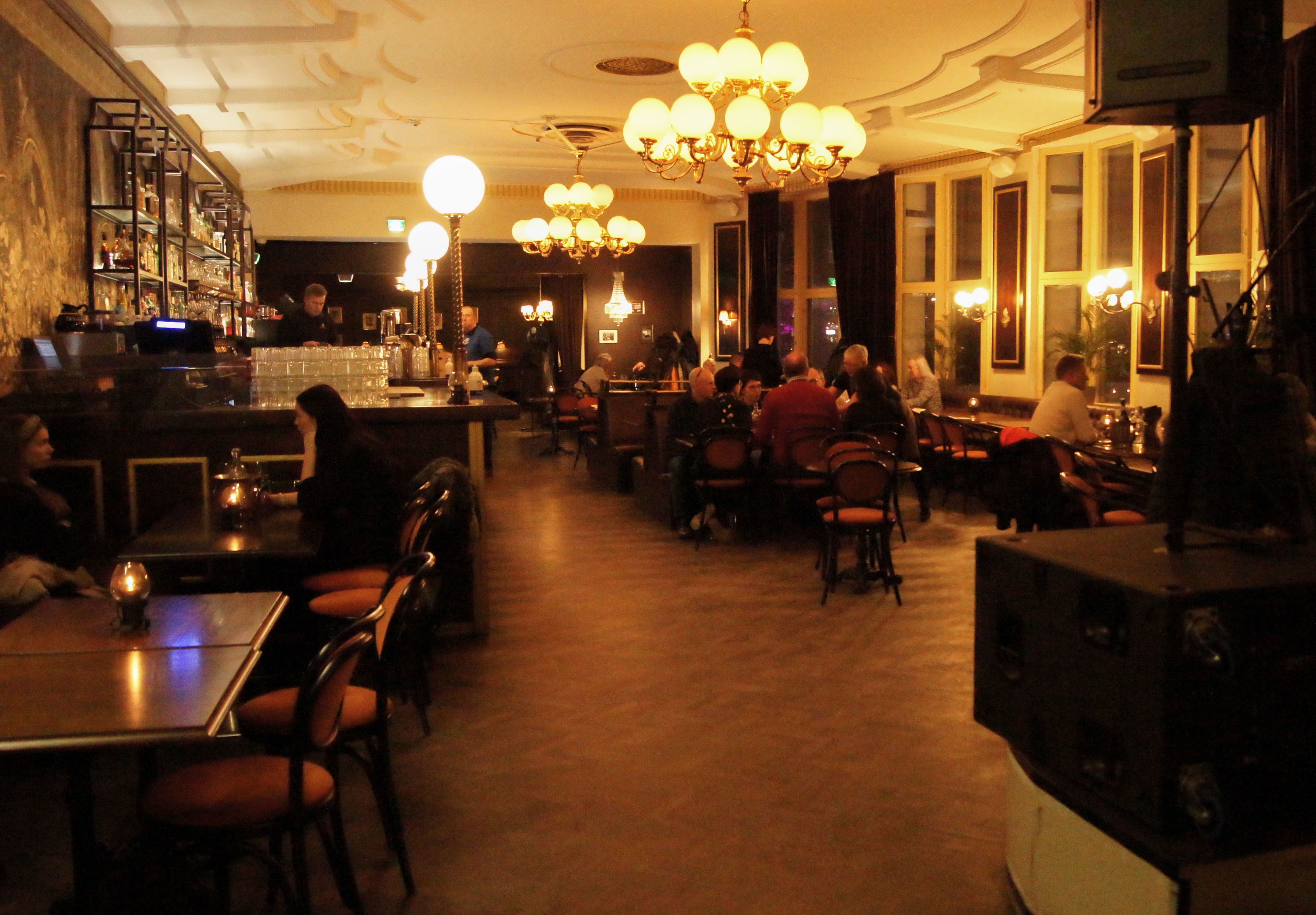 Nostalgisessa ravintola Tillikassa tunnelma on elegantti ja boheemi. Vanhojen kattokruunujen lämmin sävy ja antiikkiset kalusteet koristavat salia. Ihmiset ovat vahvasti läsnä.