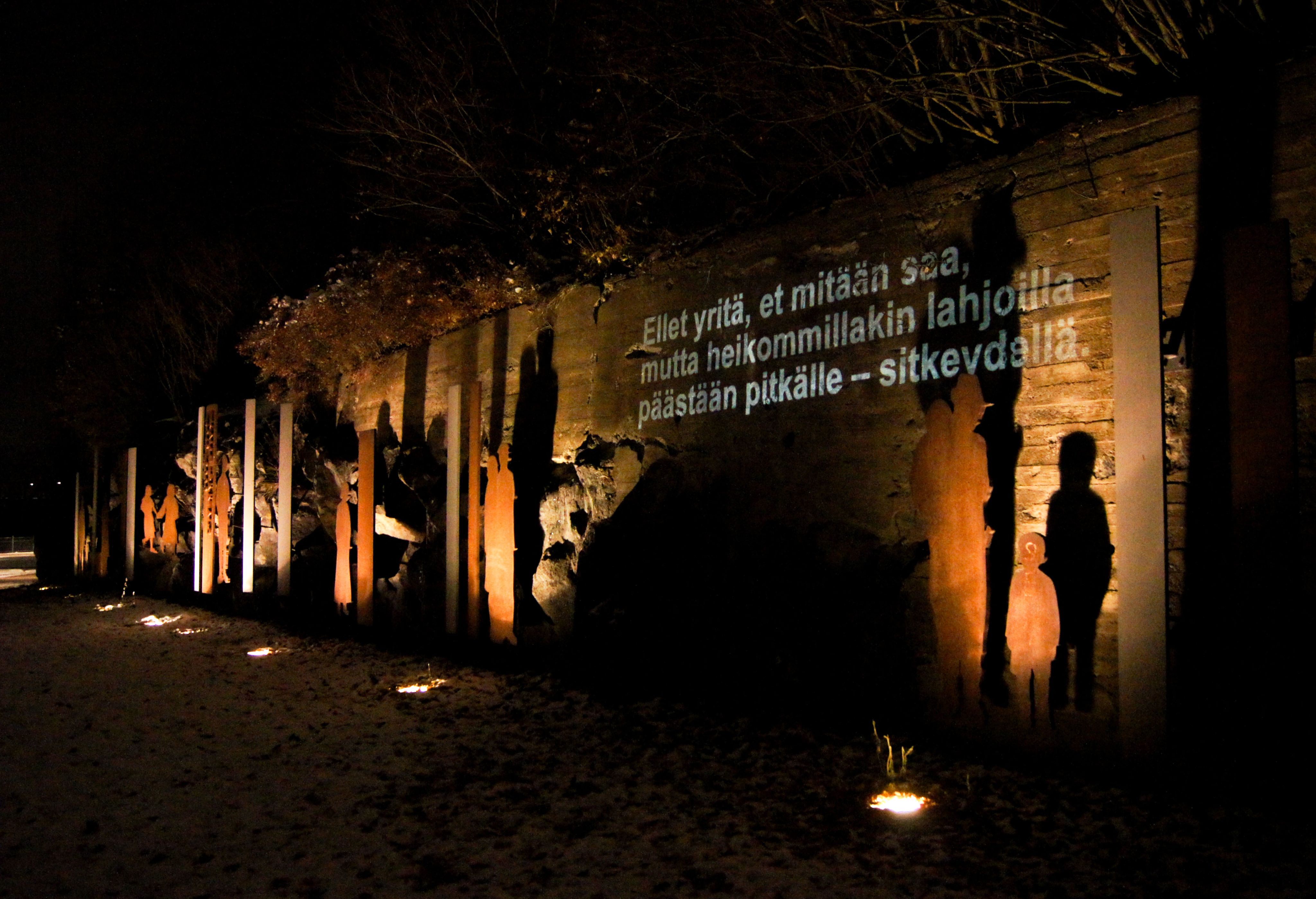 Kalle Päätalon näyttävä muistomerkki sijaitsee Alexandra Siltasen puiston kalliossa, aivan Tammerkosken vieressä.