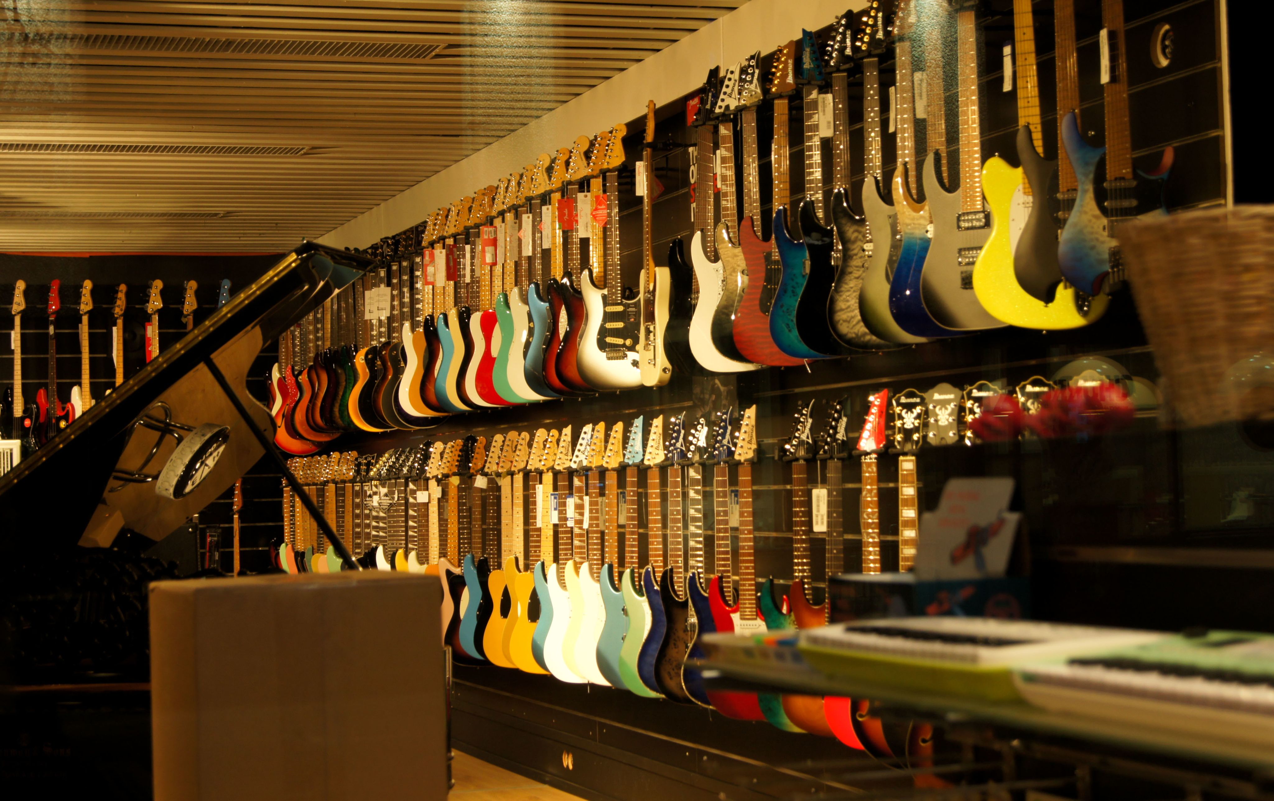 Pimeällä Tampereen musiikki -liikkeen näyteikkunasta avautuva näkymä on kuin kitaristien karkkikaupasta.