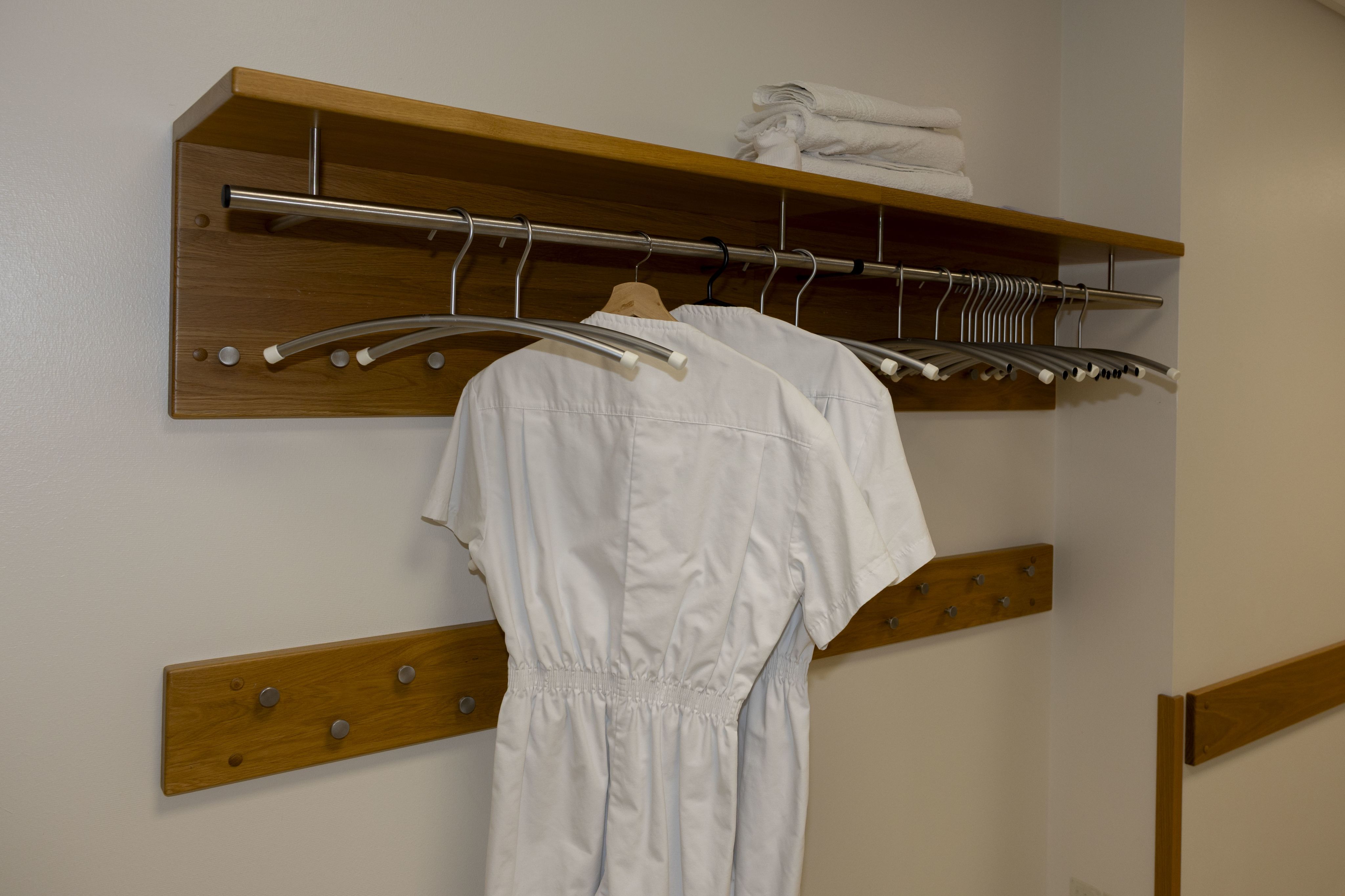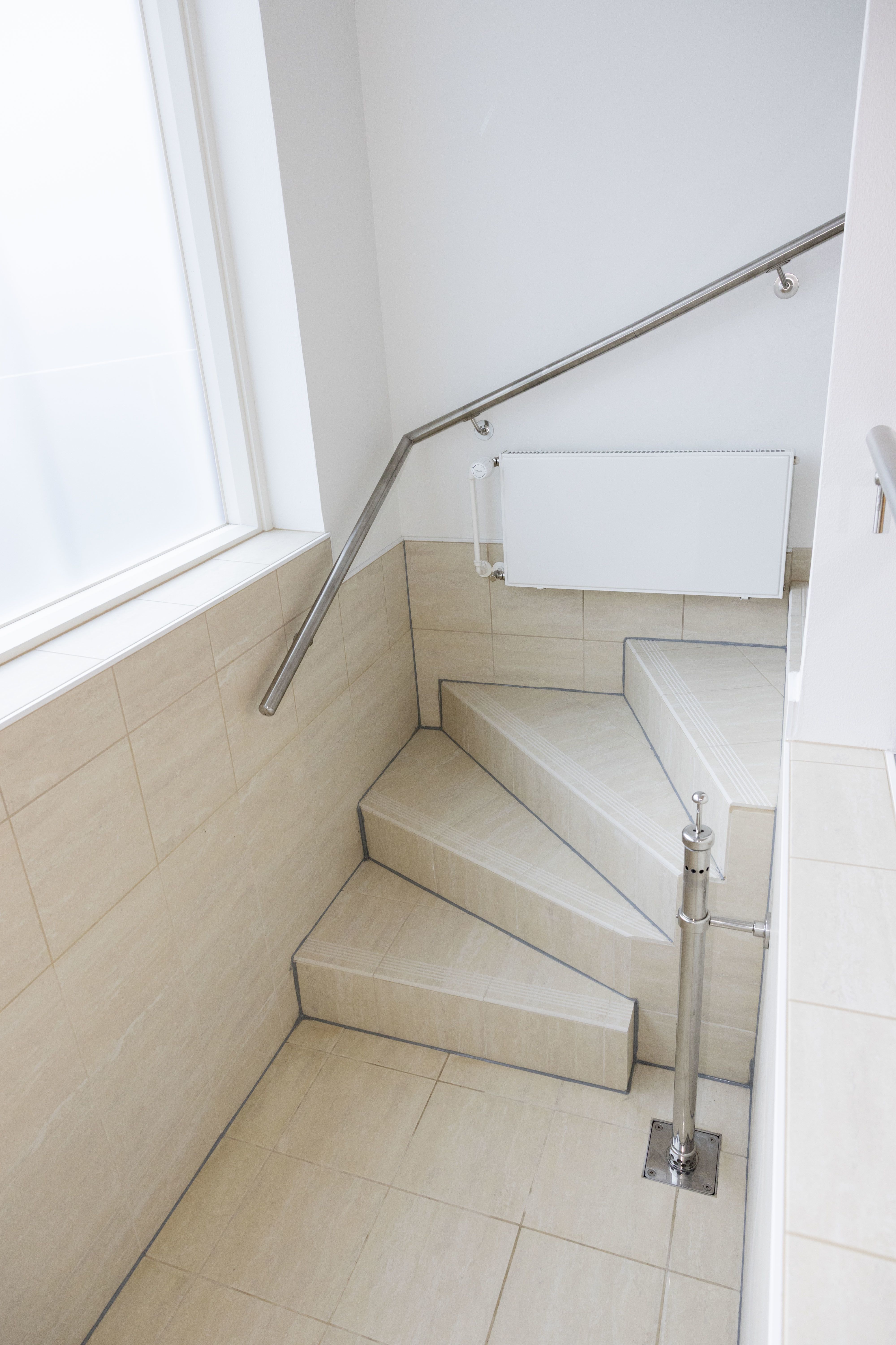 Kappelista poistuessa katseemme kiinnittyvät kastealtaaseen, joka symboloi uskoon astumisen hetkeä. Käytävän toisella puolella roikkuu muutama pyhyyttä symboloiva valkoinen kastehaalari.