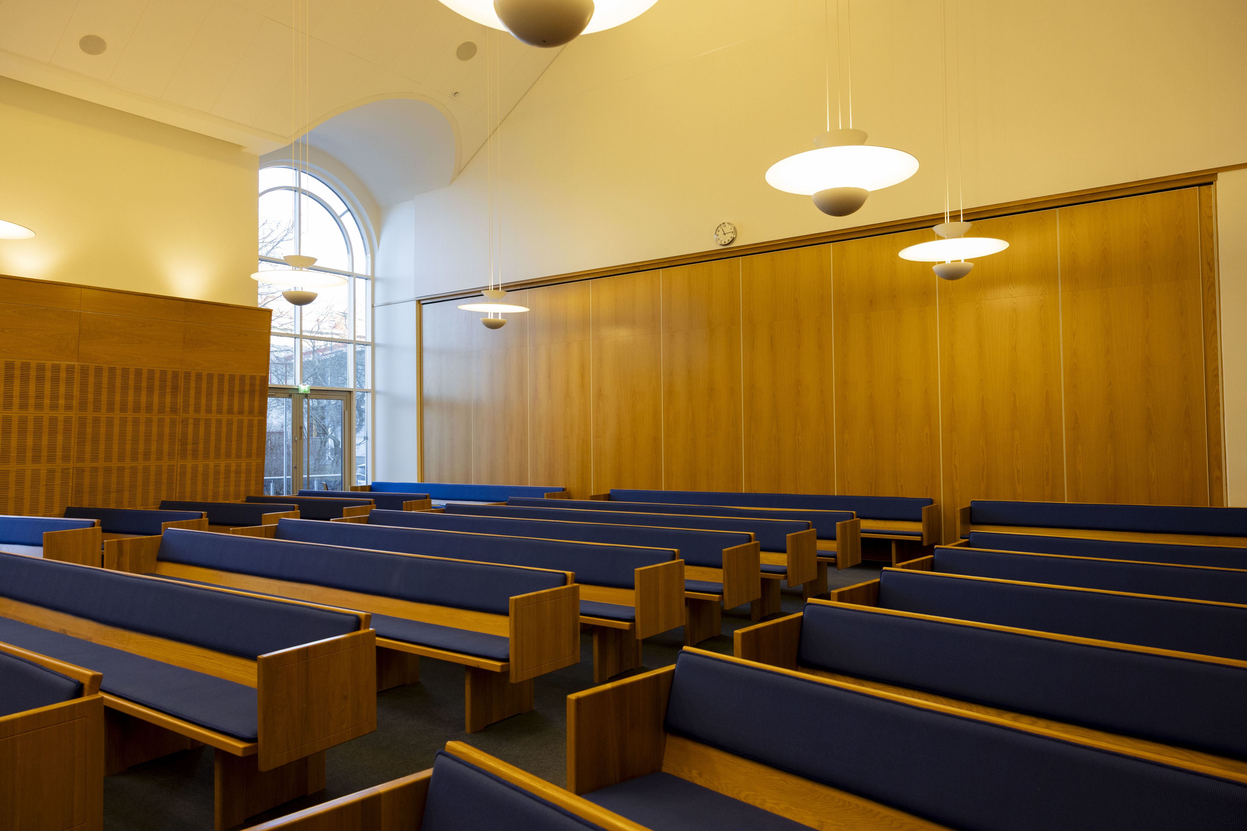 Pelkistetty sisustus, puiset penkit ja tummansiniset istuimet luovat lämpimän tunnelman. Toisin kuin temppeleissä, kappeli on avoin kaikille – myös niille, jotka eivät kuulu kirkkoon.