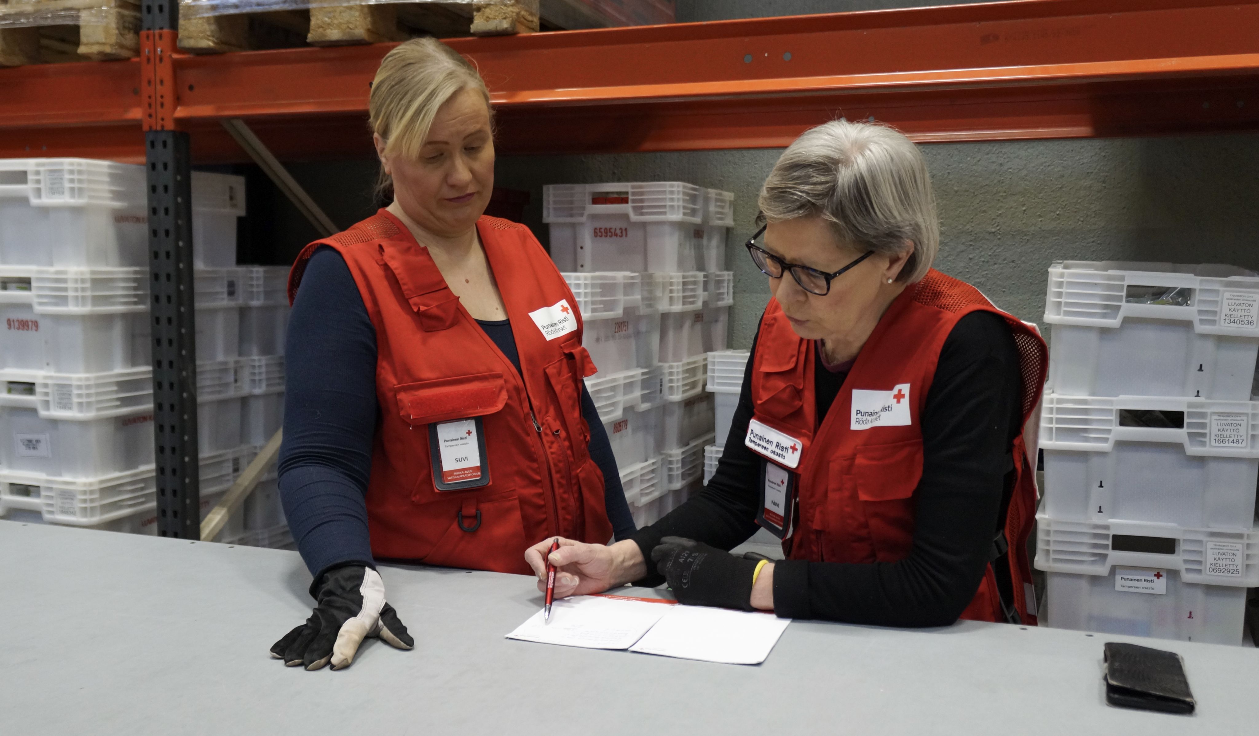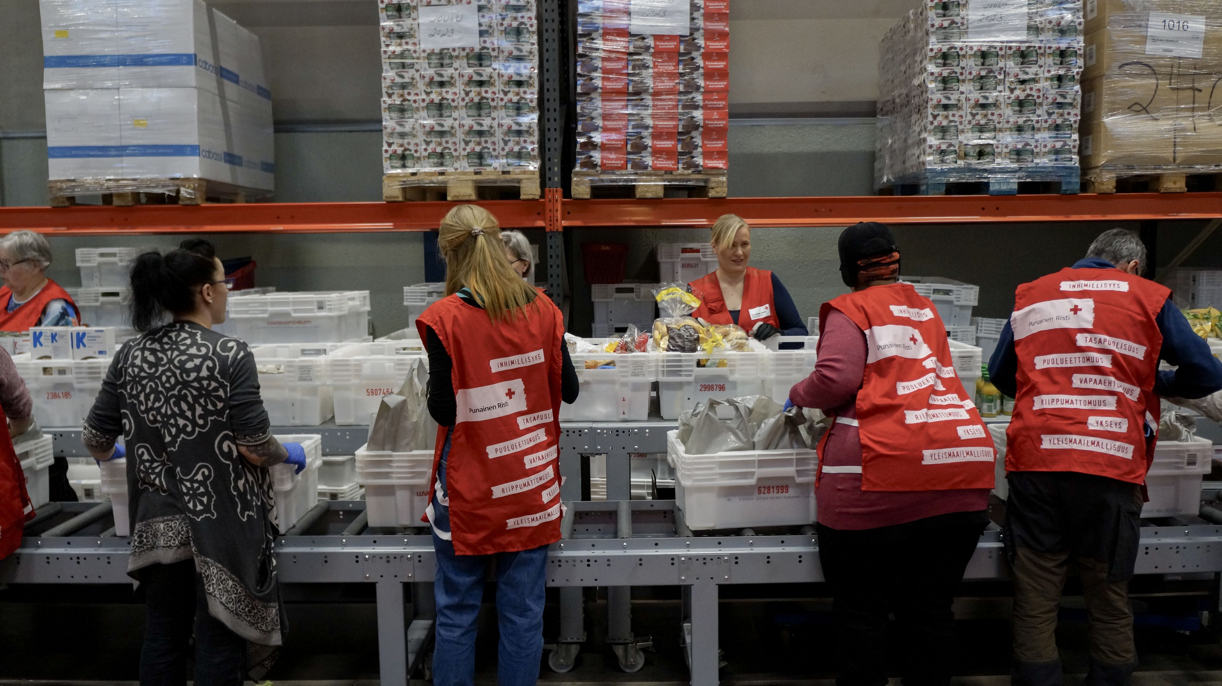 Punaliiviset vapaaehtoiset ovat työn touhussa. Kassien pakkaaminen tapahtuu kahdessa vaiheessa.