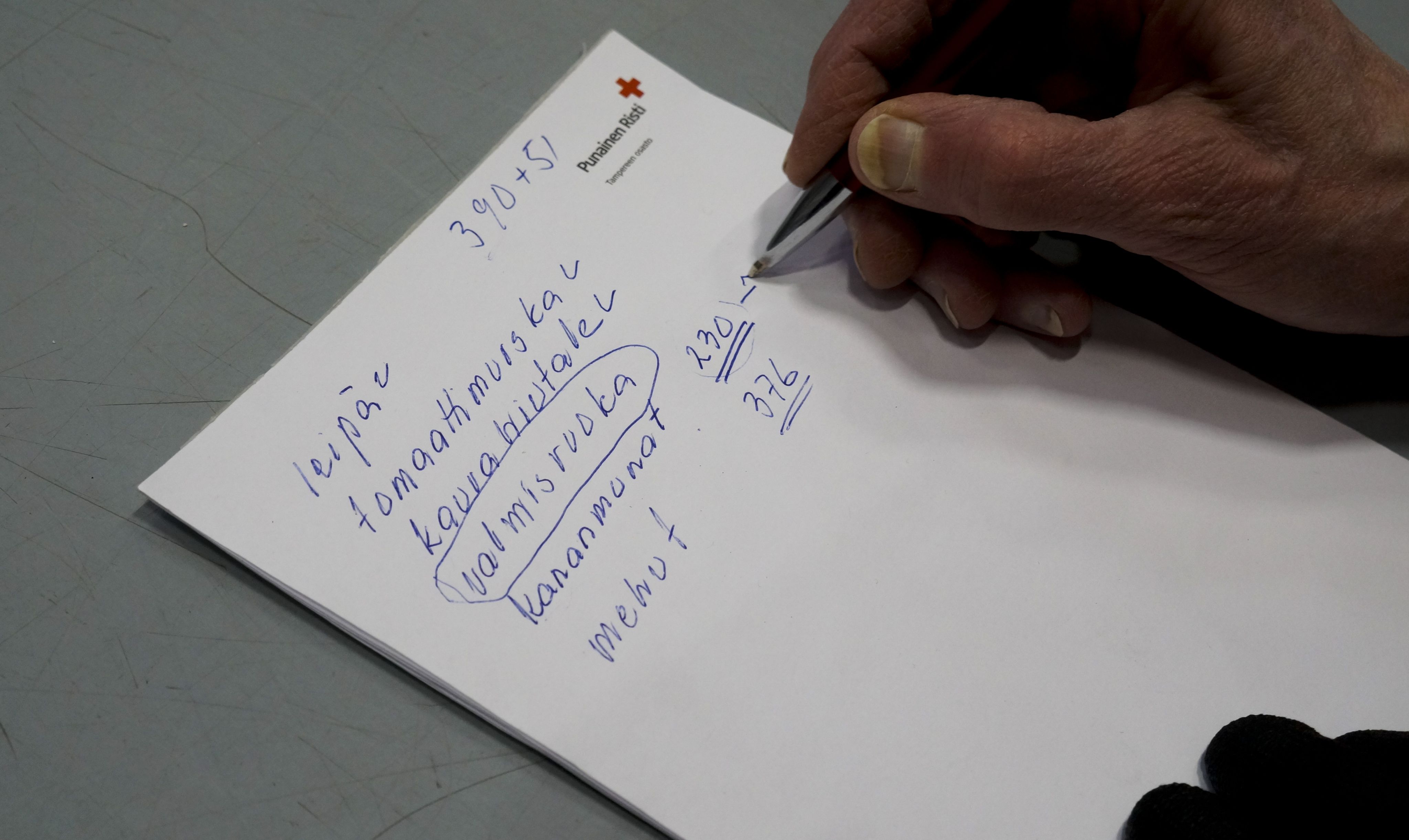 Kassien sisältö ja ruokamäärät tulee laskea tarkasti. Vastuuvapaaehtoinen Päivi Rautainen kertoo, että kassien määrä riippuu siitä, kuinka paljon ruokalahjoituksia on tullut. Tänään kasseja pakataan 390. Kuivaruokaa sisältäviä varakasseja on 51.
