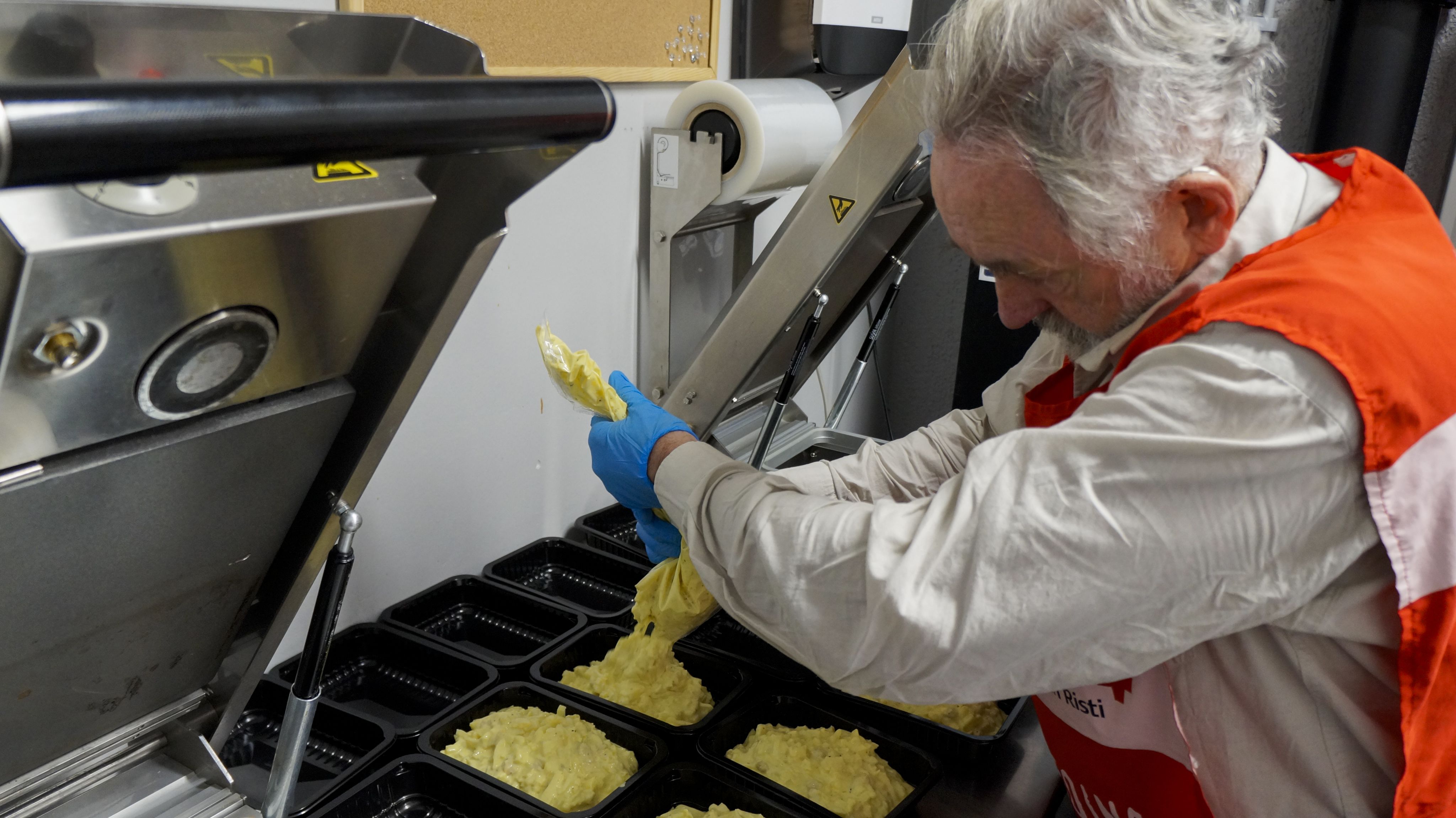 Laitosruokien pakkauspisteellä David Pring säännöstelee ruokia rasioihin ja käyttää vakuumipakkauskonetta. Hän kertoo asuneensa Suomessa yli kymmenen vuotta. Ruoka-avussa hän on käynyt auttamassa reilun vuoden.