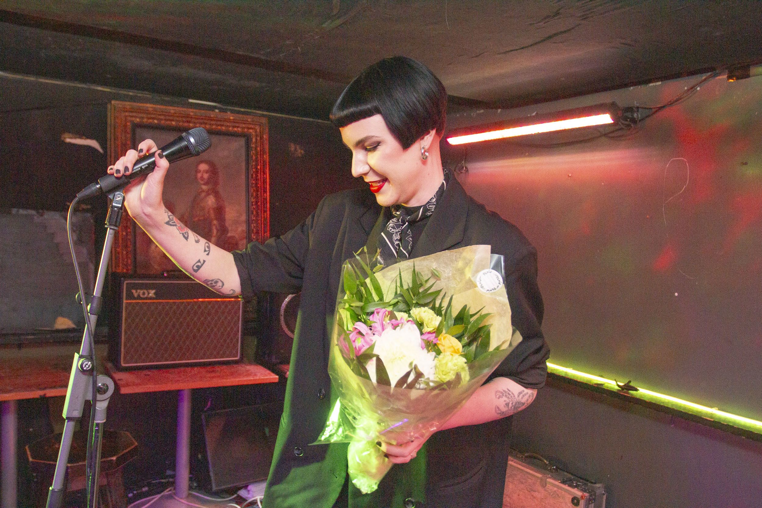 Hän rientää lavalle vastaanottamaan kukkakimpun leveän hymyn kera. Helpotus ja tyytyväisyys ovat aistittavissa. Tunnelma on vapautunut.