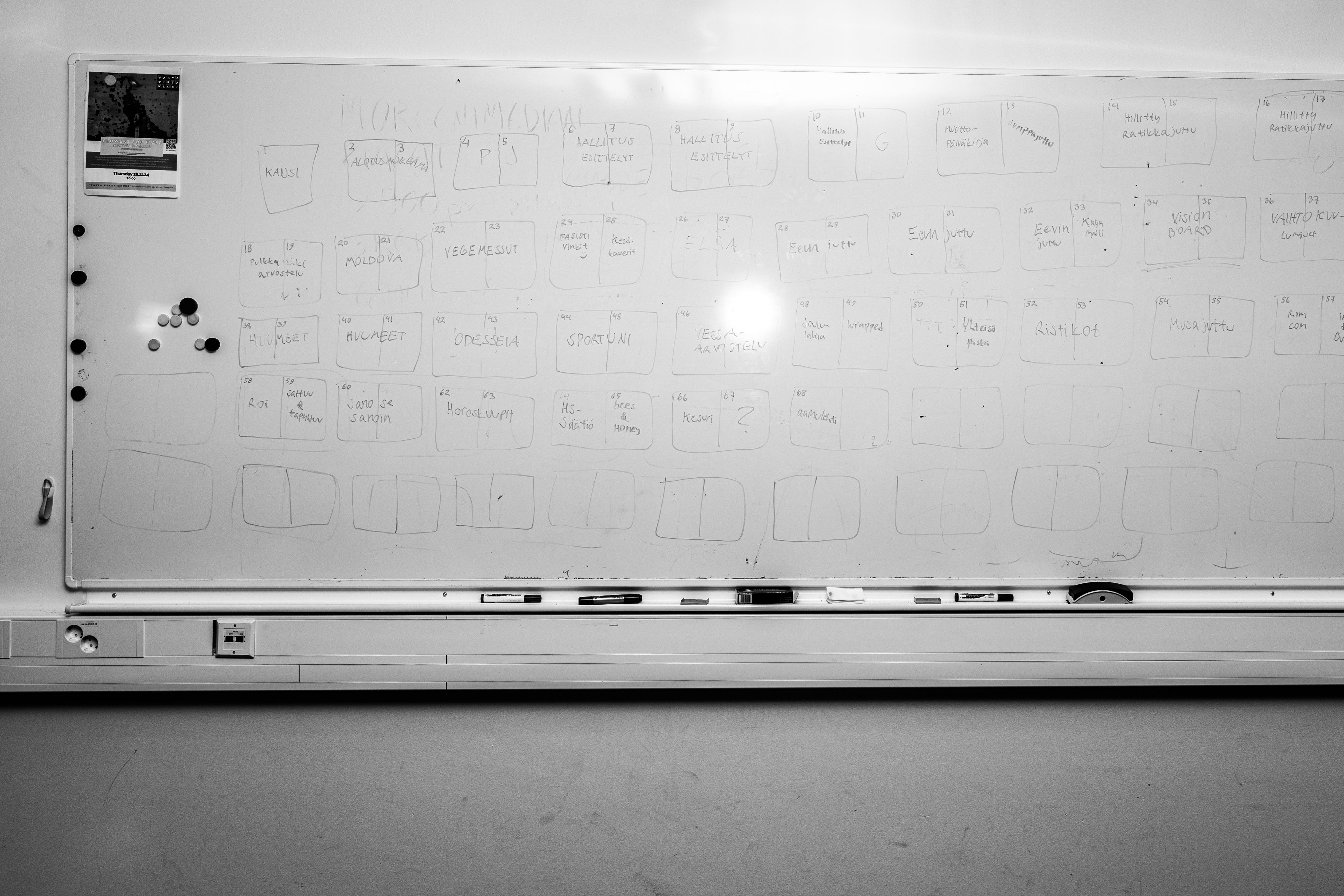 Milla Turtonen hahmottelee lehden rakenteen valkotaululle. Lehdestä tulee lopulta 68-sivuinen. “Onneksi piirsin tarpeeksi monta suorakulmiota.”