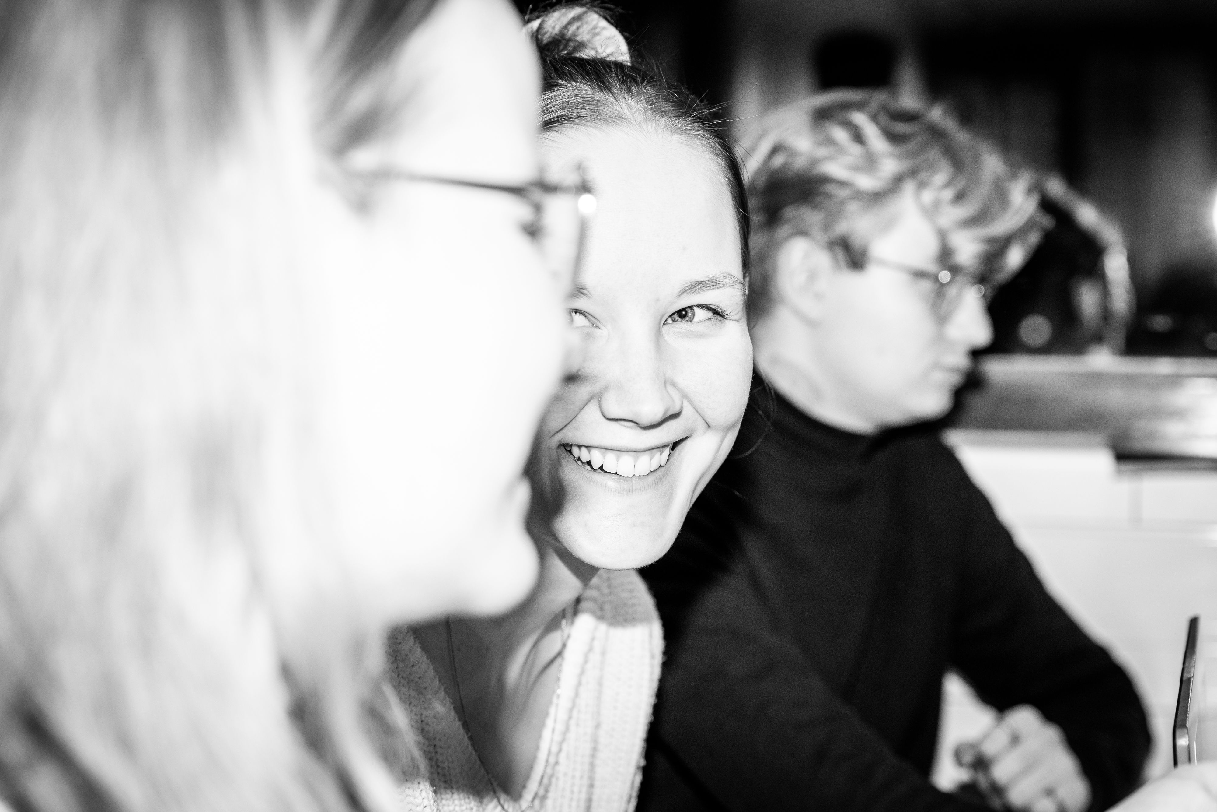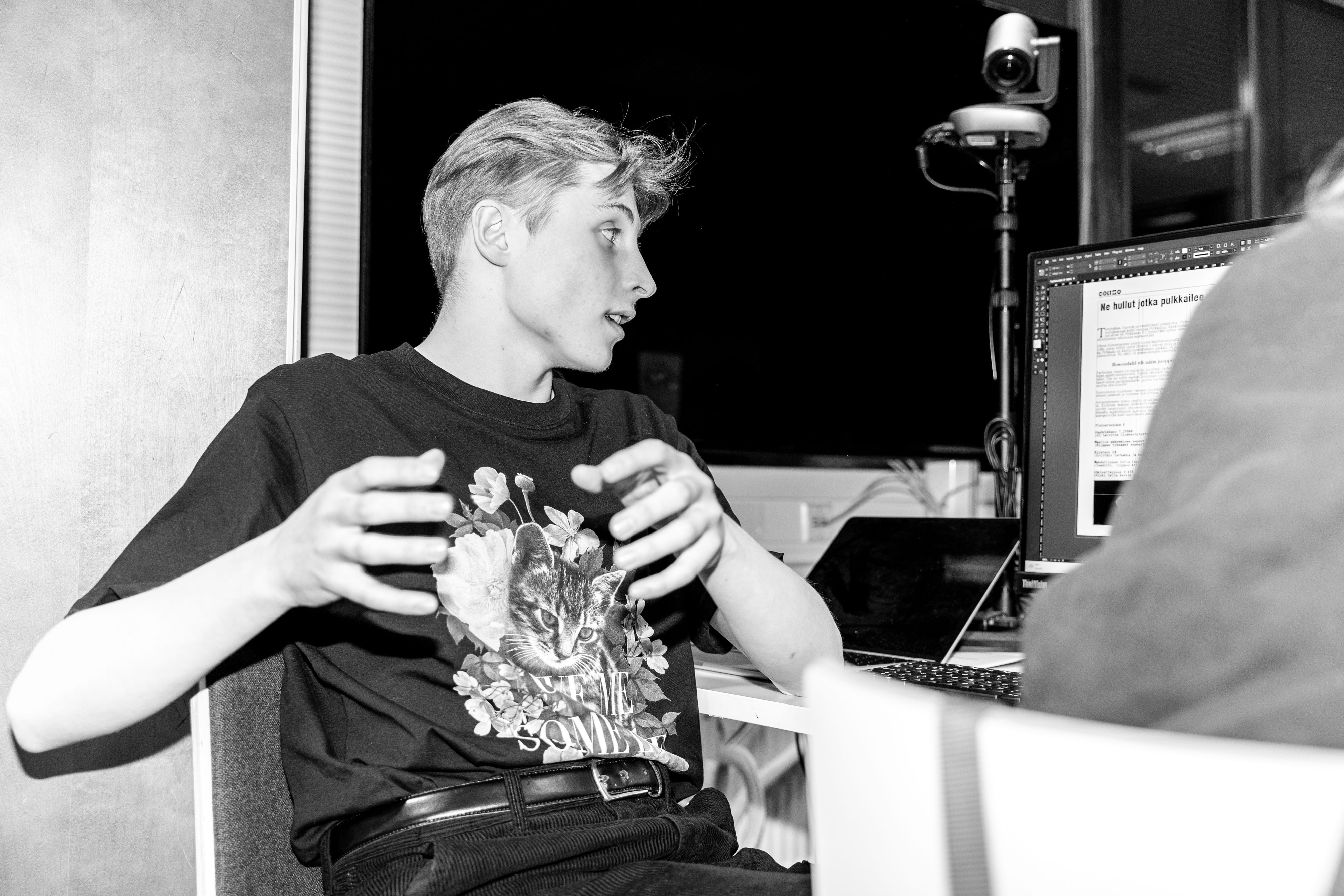 Eevi Grönlund, Venla Niinilampi ja Timi Saukkoriipi juttelevat tulevista sitseistä ennen taittamiseen ryhtymistä. Niinilampi ja Saukkoriipi kirjoittavat toissavuotisen “Kaoottisen bussiliitteen” jatko-osaksi “Hillityn ratikkaliitteen”. “Visuaalista ilmettä pitää vielä hinkata”, toteaa Saukkoriipi.