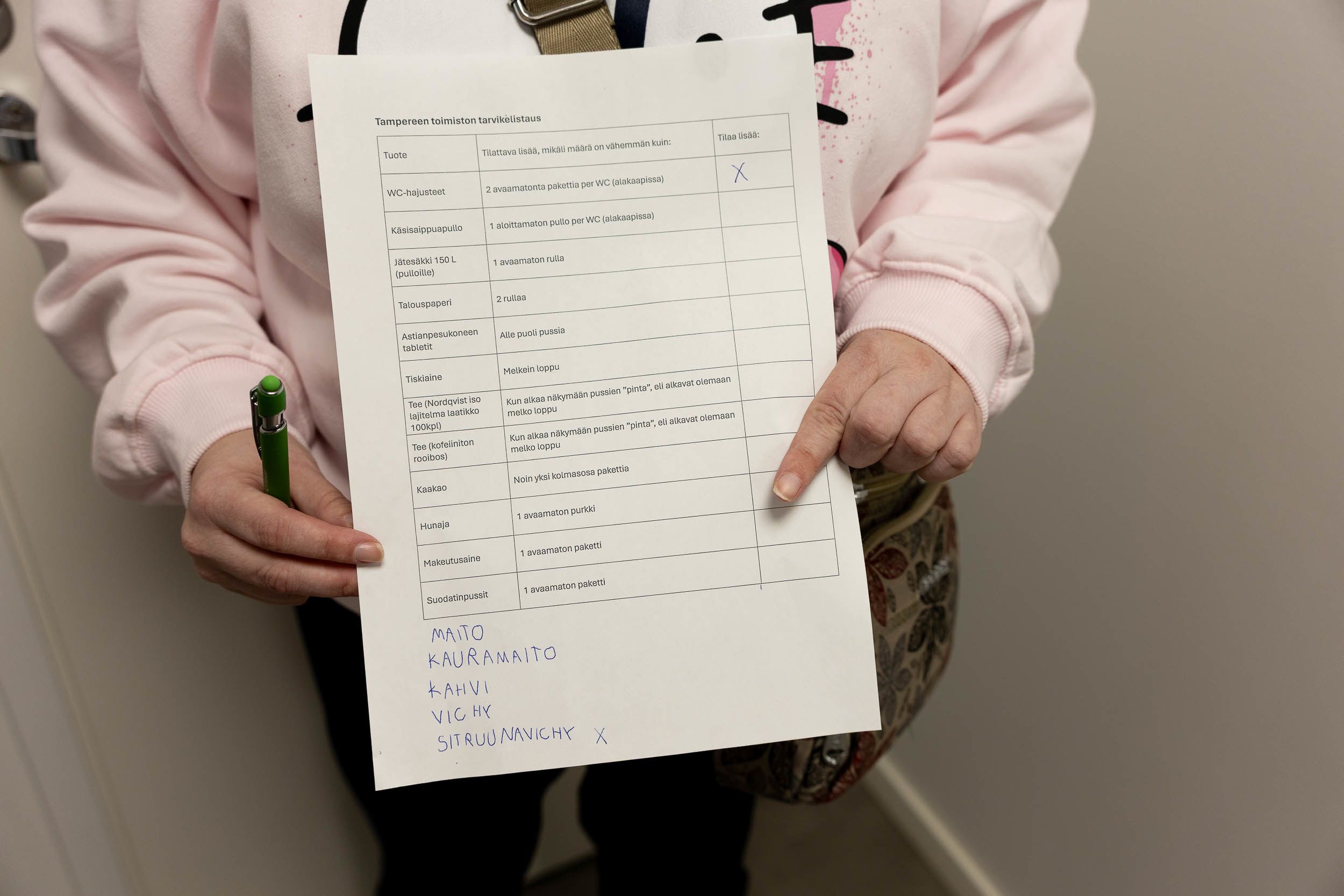 Paulaniemi tekee työpaikalla inventaariota, jotta tavaroita osataan tilata tarvittaessa lisää.