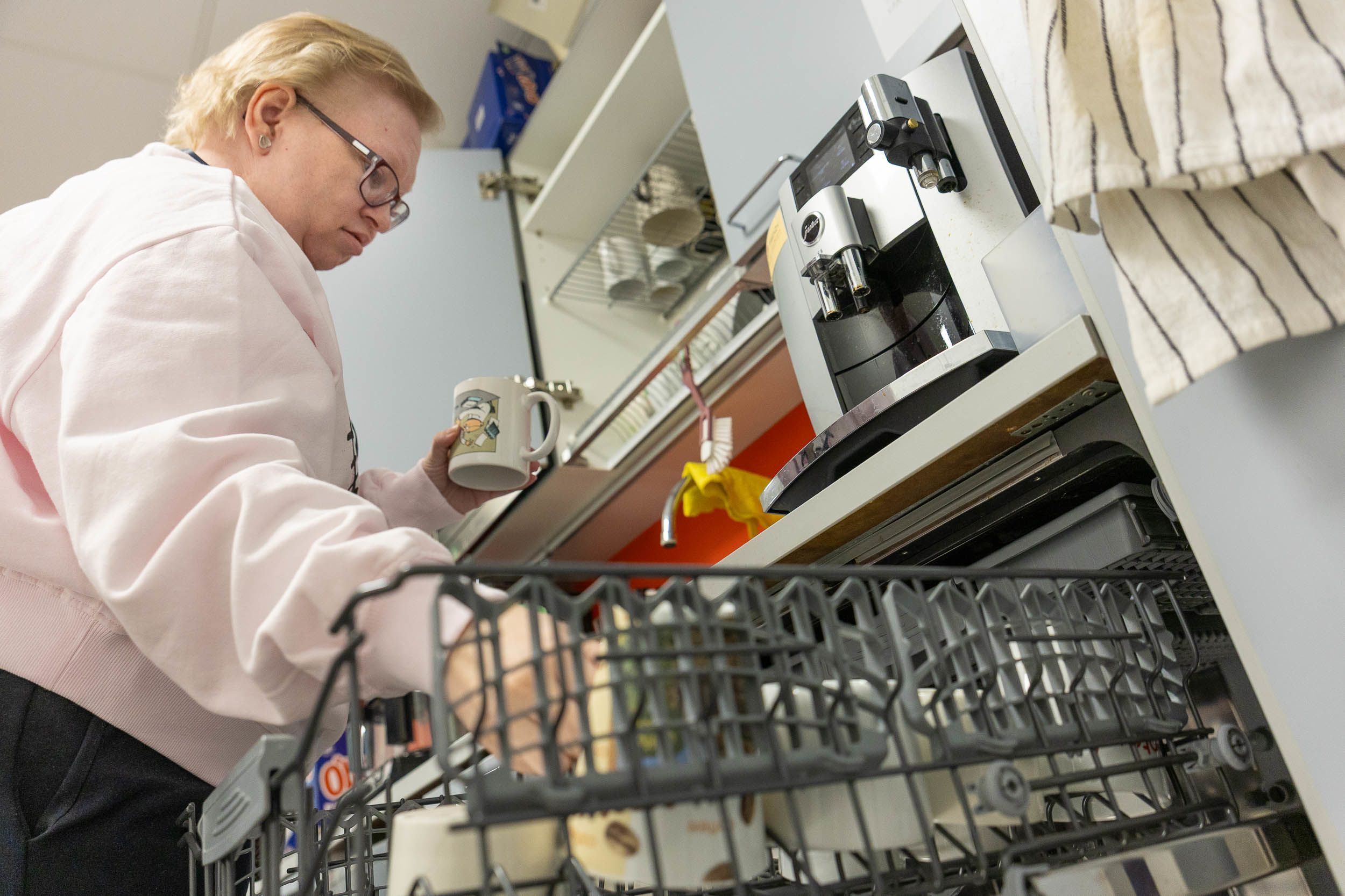 – Tämä on johtajan kuppi, Maiju Paulaniemi sanoo ja virnistää, kun hän kurottaa nostamaan Herra usein oikeassa -kupin kuivauskaapin hyllylle. Mukit kilahtelevat hiljaa toisiaan vasten, kun puhtaat tiskit löytävät pikkuhiljaa omille paikoilleen.