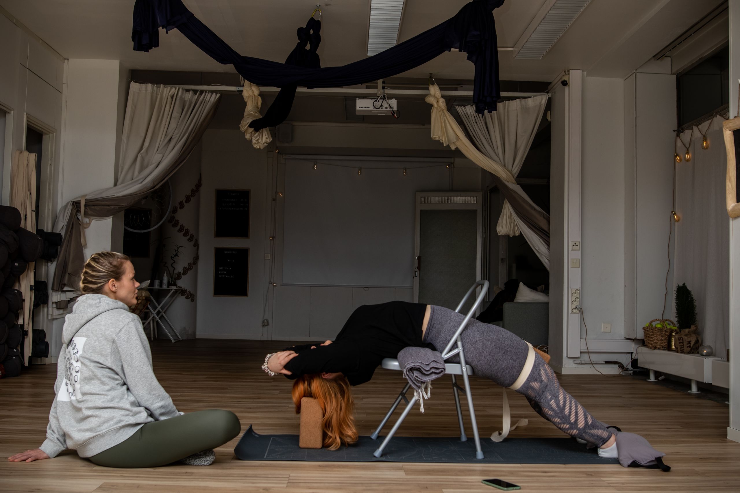 Avaamme tuolit ja nousemme istumaan niiden reunalle. Alkava tunti on katonah-joogaa, jossa käytetään paljon apuvälineitä. Nojaamme taaksepäin, ristimme selkänojan takana kädet ja alamme tehdä pienen pientä heijausliikettä ristityillä käsillä. Tämä pieni liike, jota ohikulkija tuskin edes huomaisi, tuntuu sitäkin enemmän.