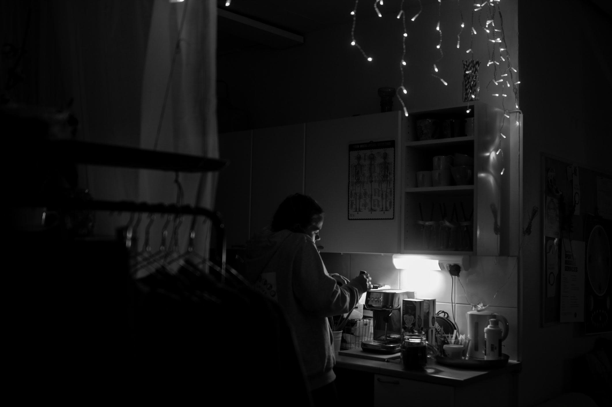 Tunnin päätteeksi on loppurentoutus. Sali on hämärä, ja makaamme paikallaan hiljaa. Pääni alla on tiilen näköinen joogablokki. Kääntelen päätäni hitaasti puolelta toiselle ja tunnen, miten kallonpohjalihakset rentoutuvat. Muu keho tuntuu raskaalta ja täysin rentoutuneelta. Hengitämme sisään ja ulos. Katosta roikkuu pieni diskopallo, joka heijastaa salin jouluvalojen lämmintä kajastusta. Salin ulkopuolella odottava Kallio on säkkipimeä.