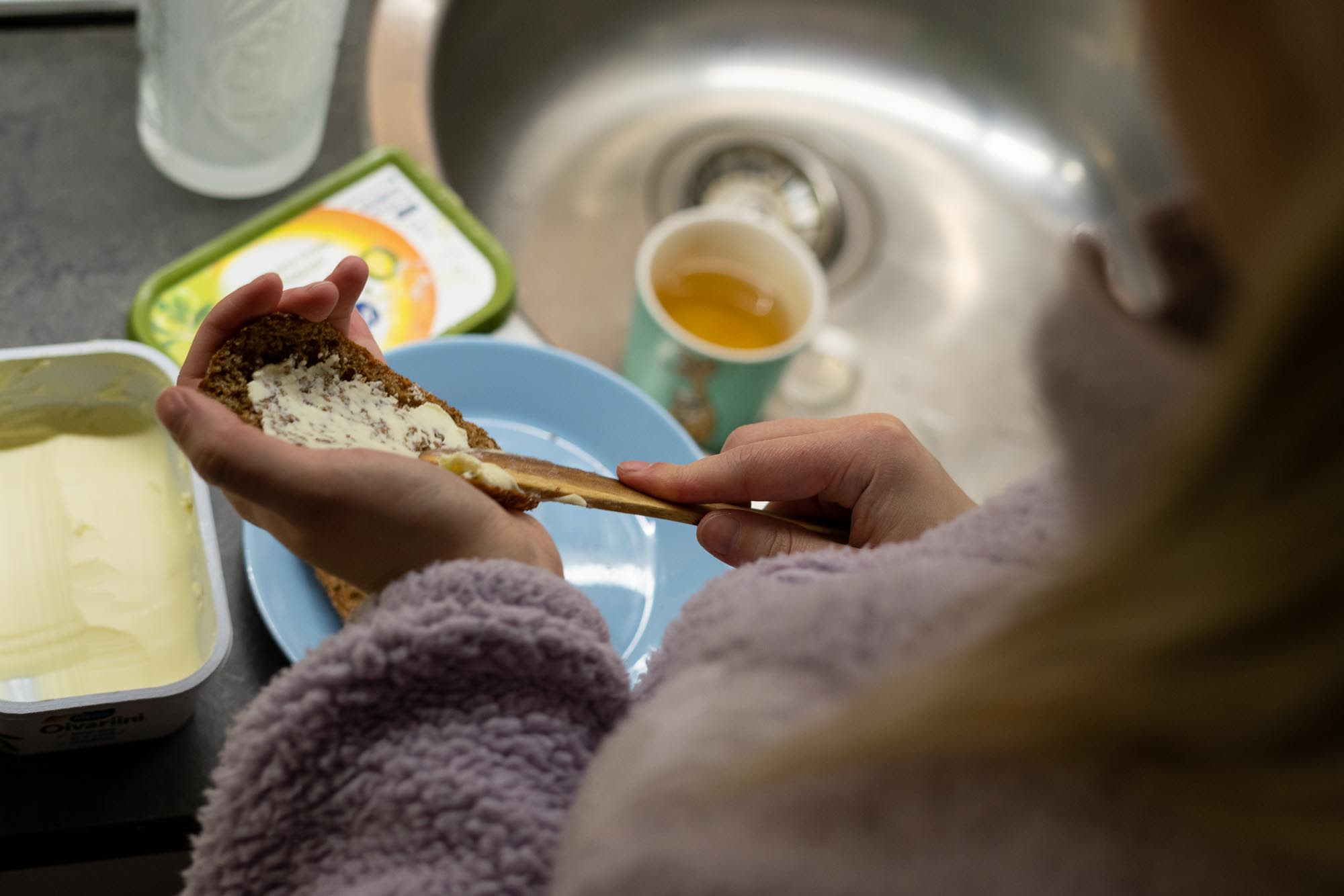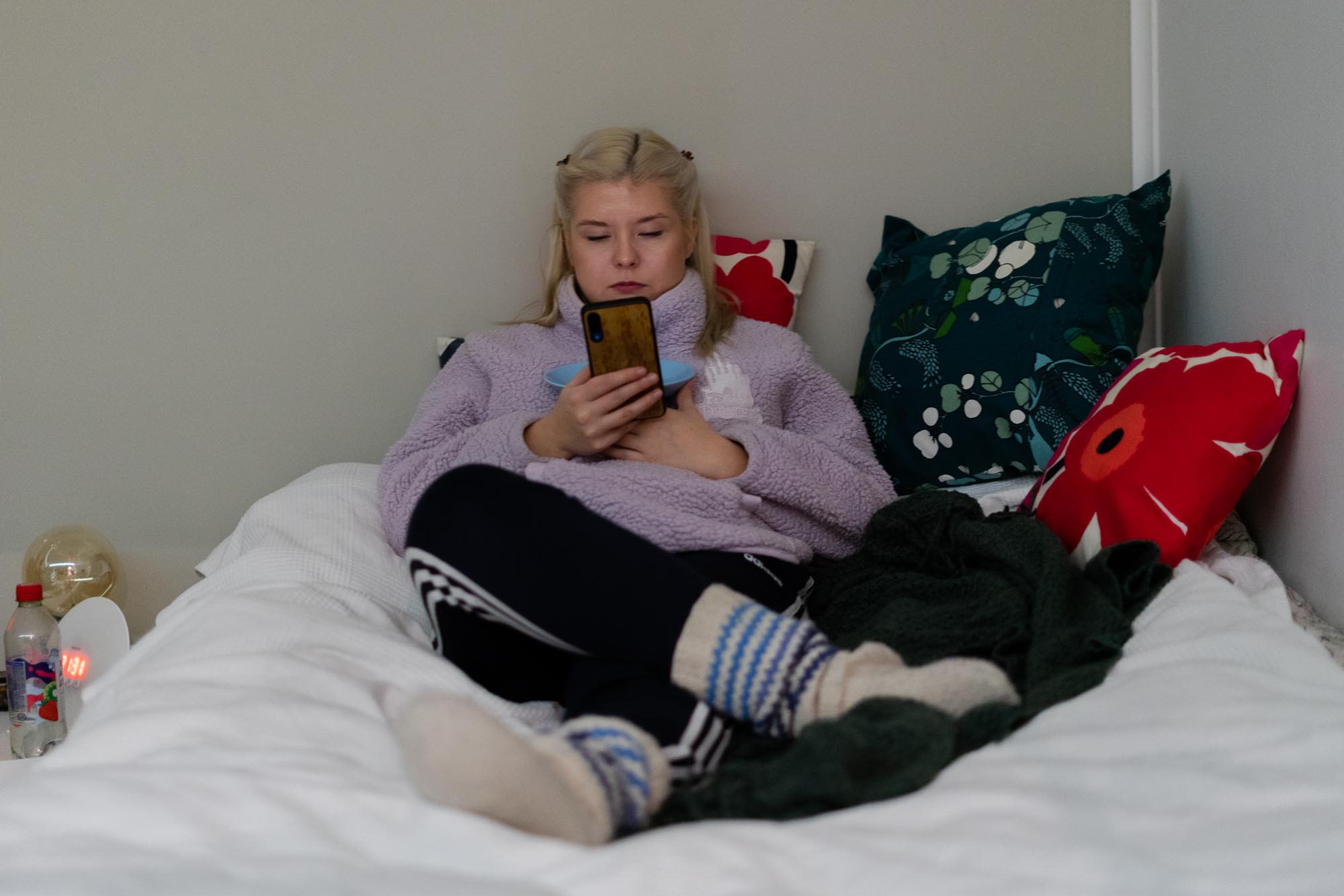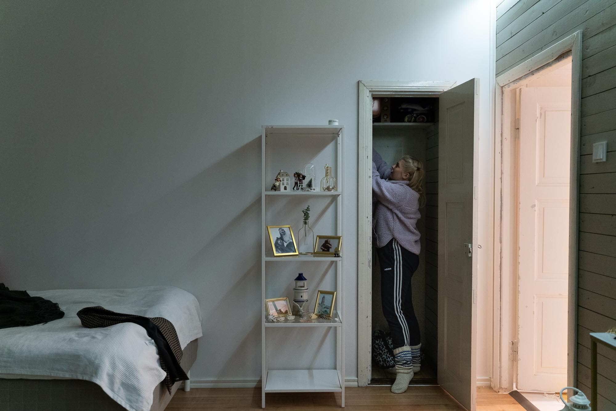 Kotiin tultuaan Sofia vaihtaa ylleen kotivaatteet ja laittaa jalkaan villasukat. Lenkki jää tänään välistä, vaikka se oli vielä aikaisemmin mielessä. Nyt ei jaksa.