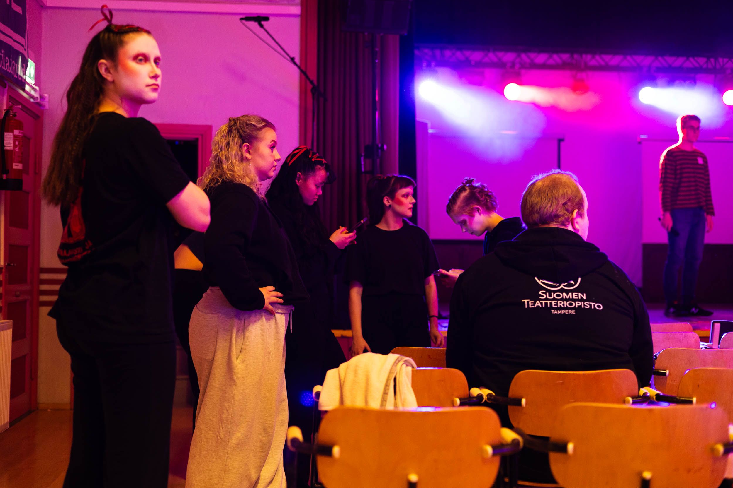 Esiintyjät odottavat harjoitusvuoroaan lavan vieressä.