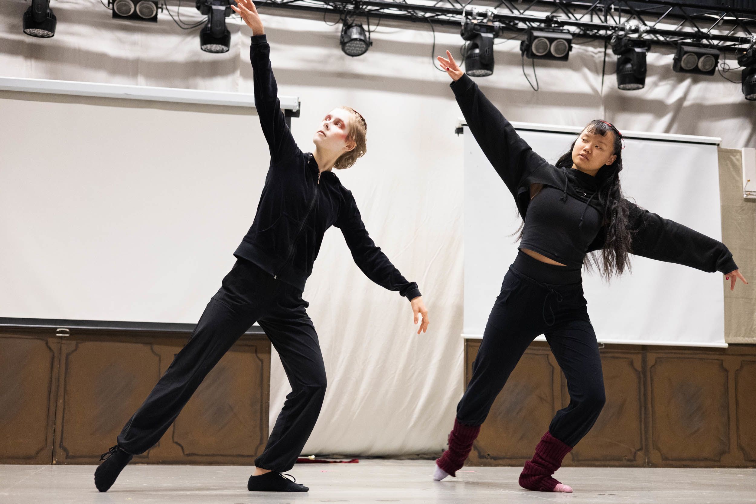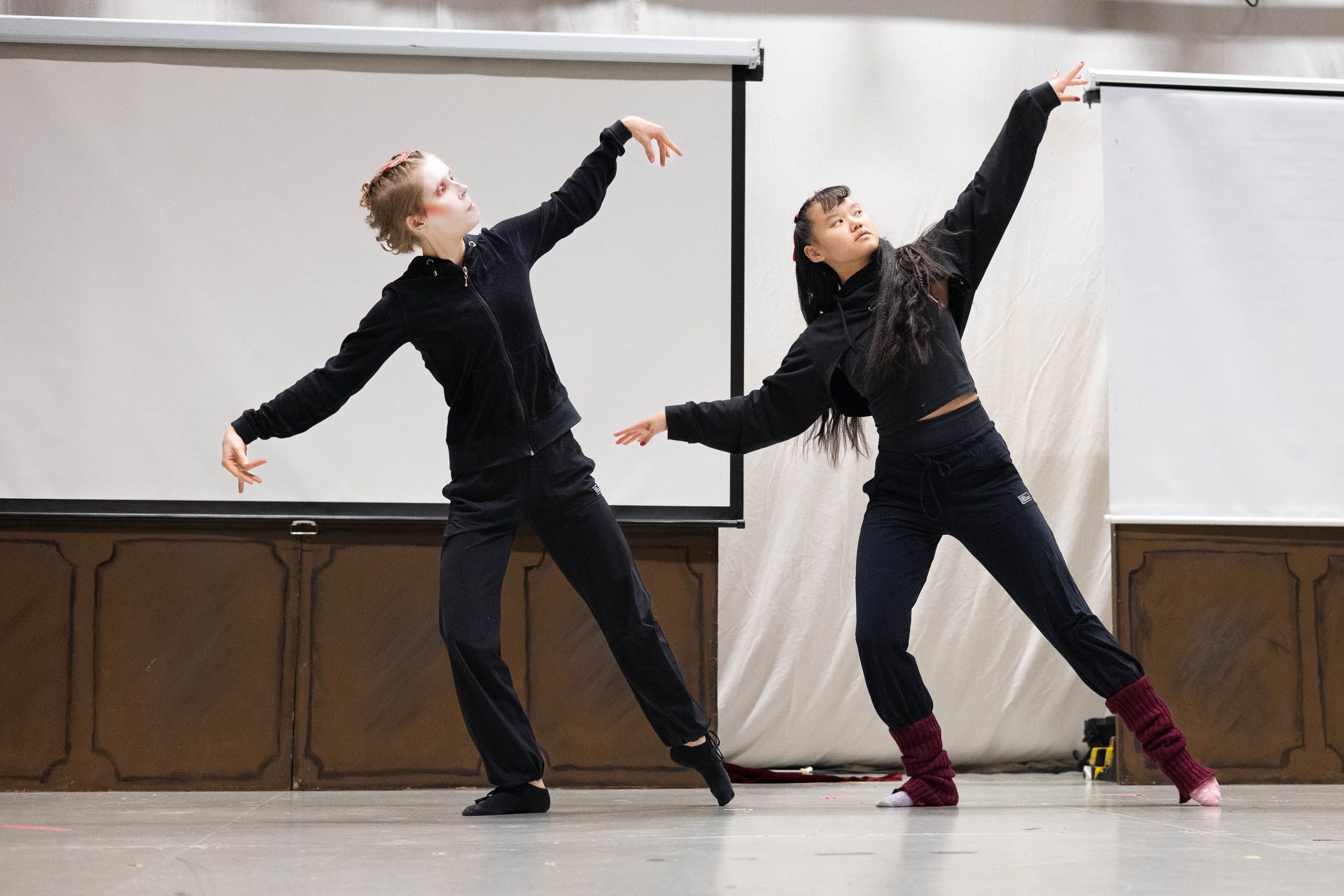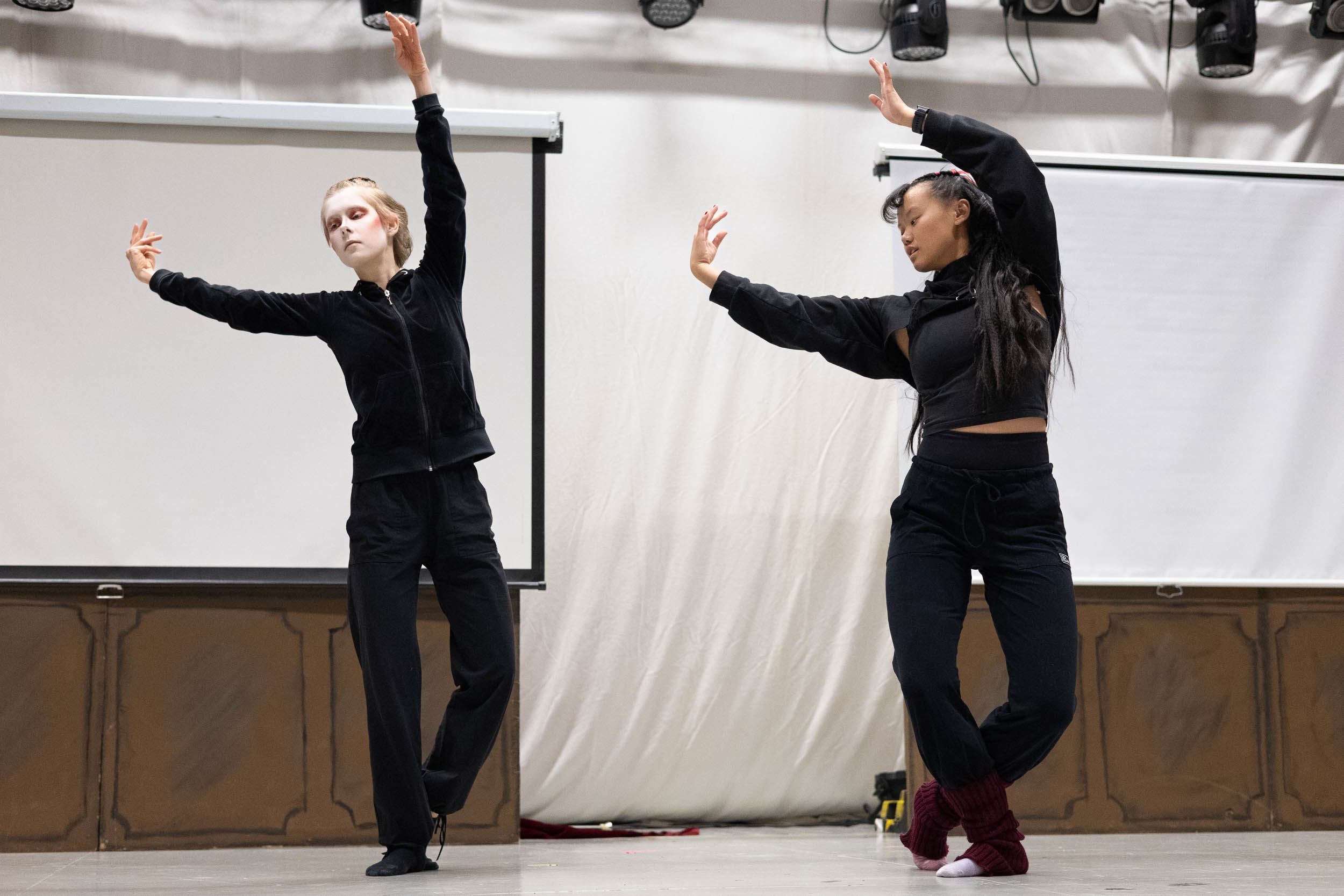 Tanssijat kokoontuvat näyttämösaliin lämmittelemään ennen esityksen kappaleiden läpimenoa. He venyttelevät ja kertaavat tanssiliikkeitä.