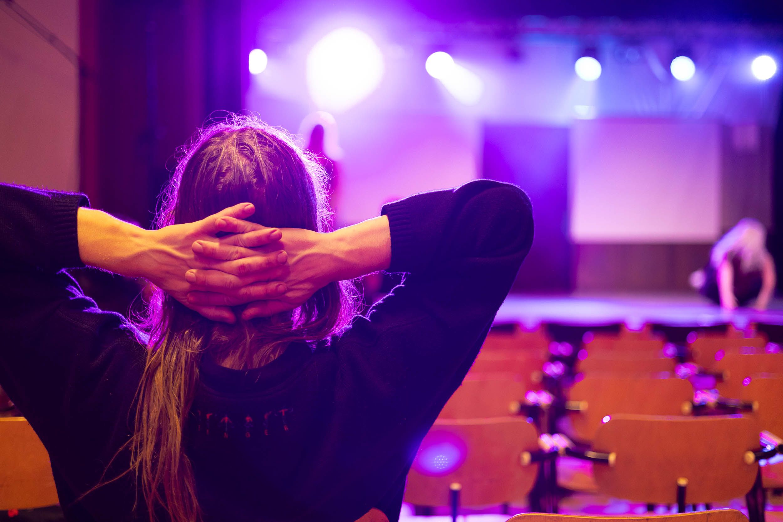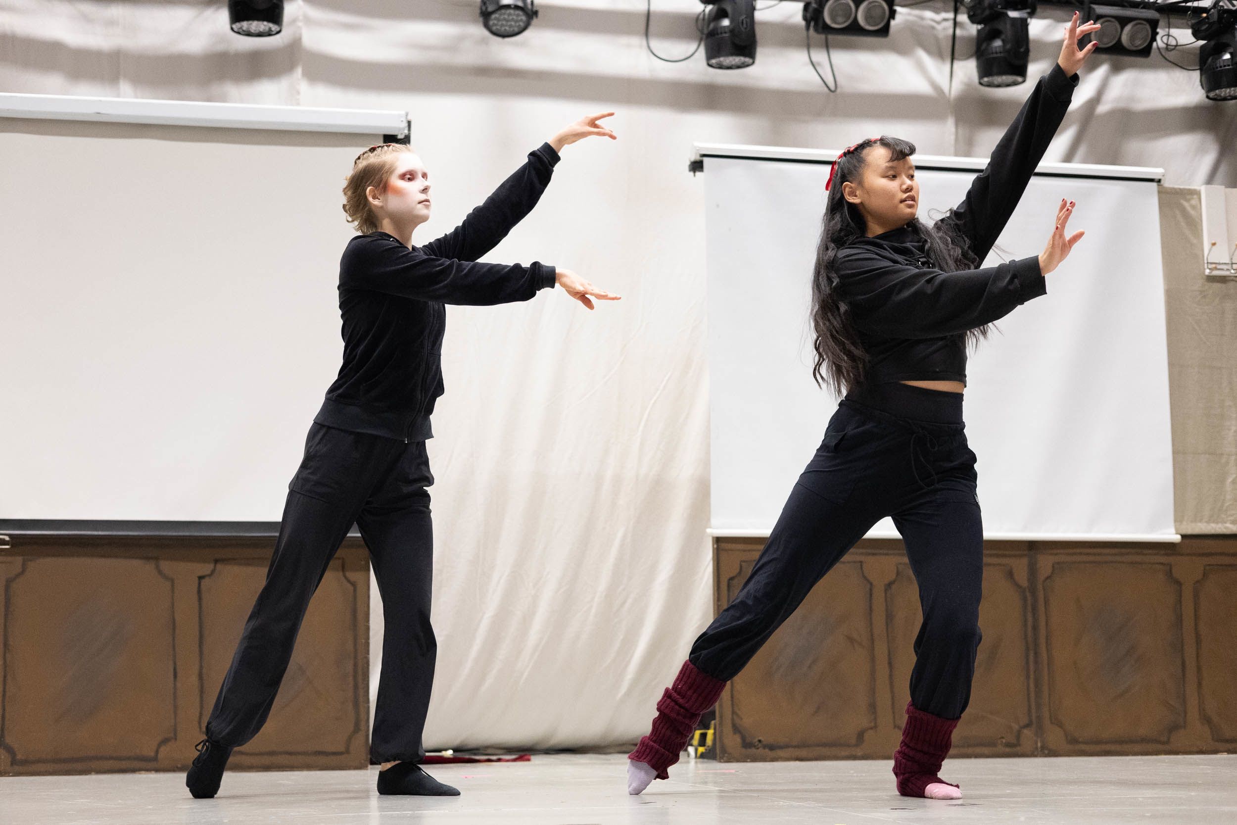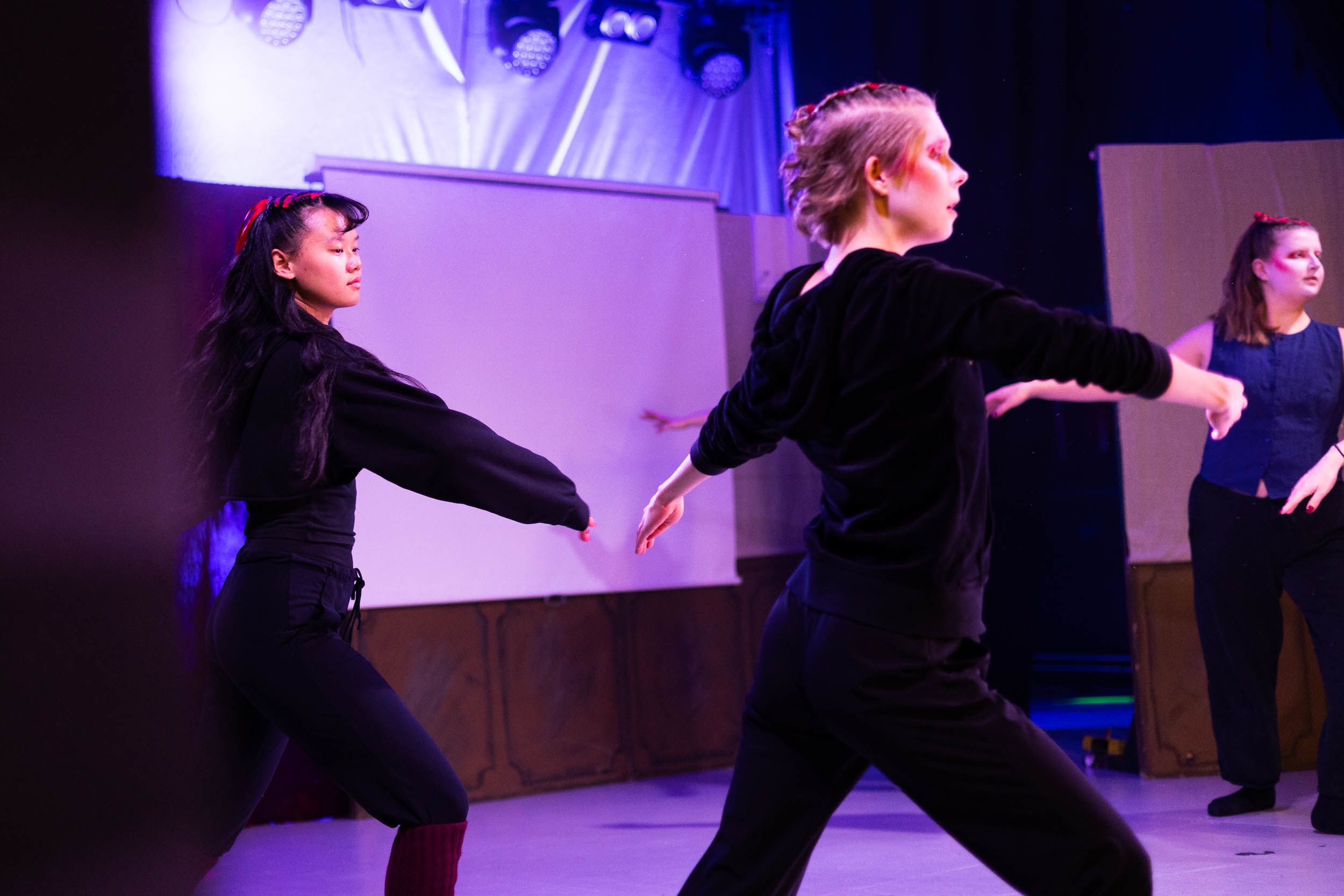 Tanssijat kokoontuvat näyttämösaliin lämmittelemään ennen esityksen kappaleiden läpimenoa. He venyttelevät ja kertaavat tanssiliikkeitä.