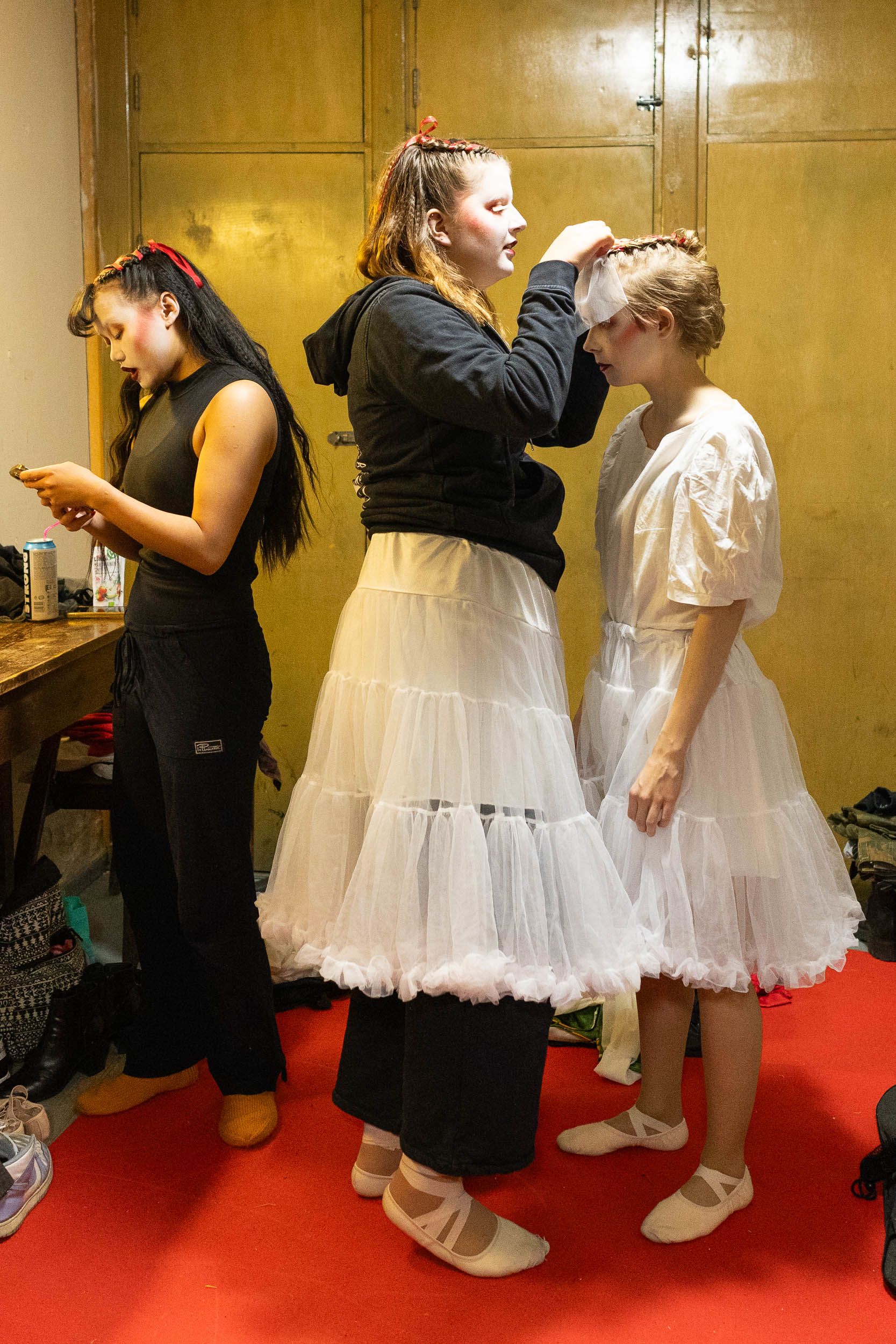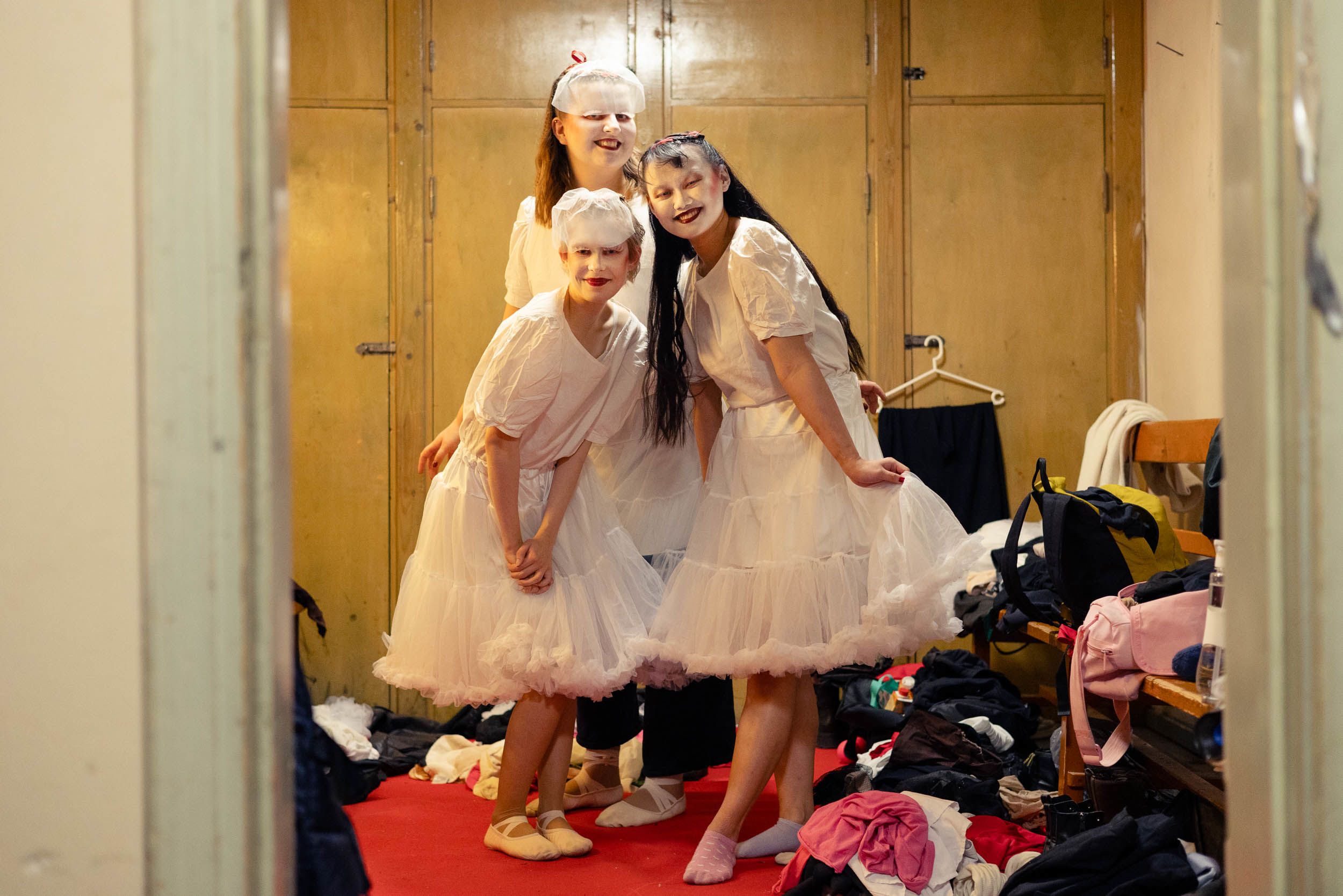 Aalto juoksee tanssijoiden pukuhuoneeseen etsimään esiintymisvaatteitaan. Maskeeraus venyi, ja vielä pitäisi laittaa valkoiset tekoripset silmiin ja lämmitellä.