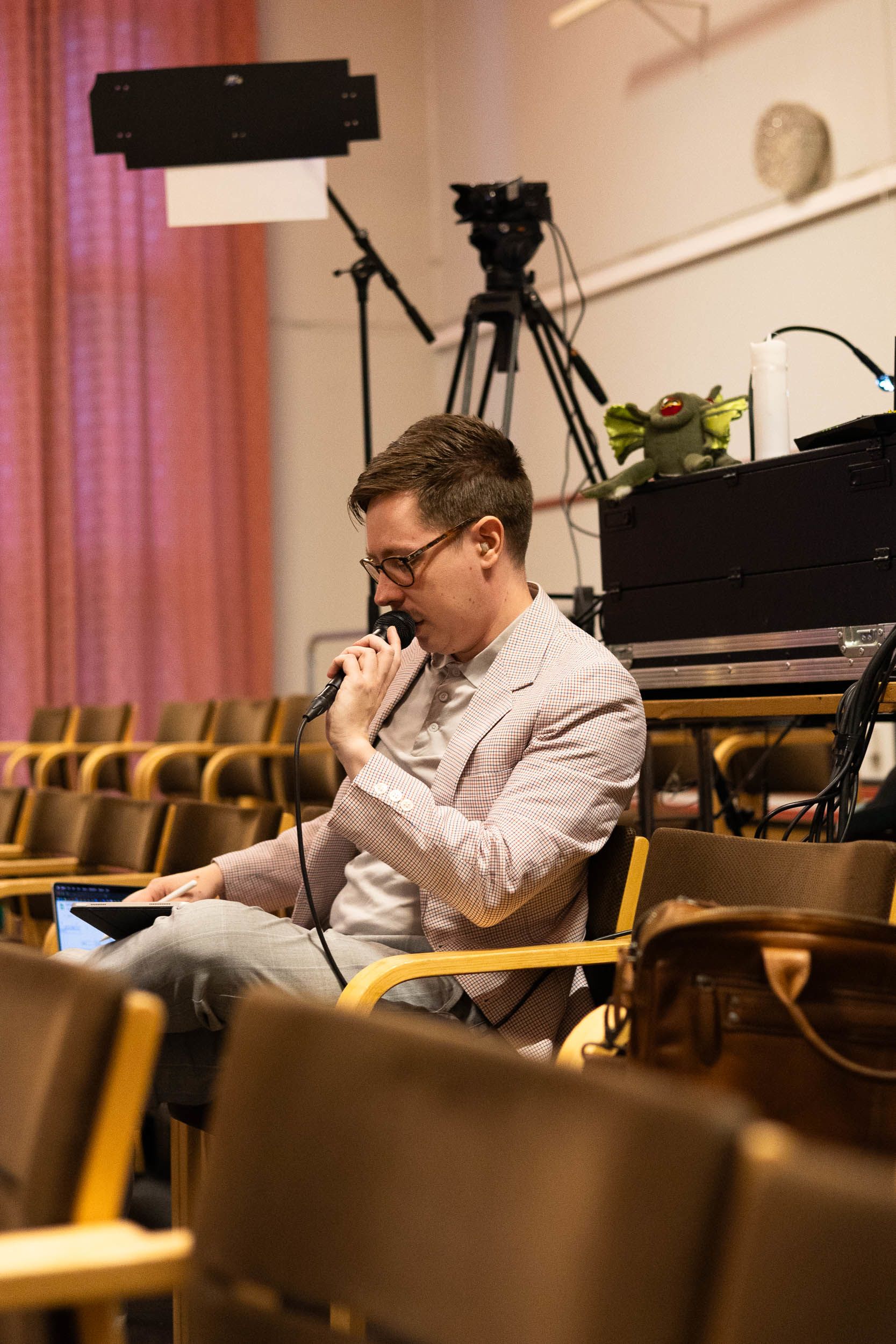 Tuottaja Roope Suojanen antaa ohjeita yleisöstä esiintyjille.