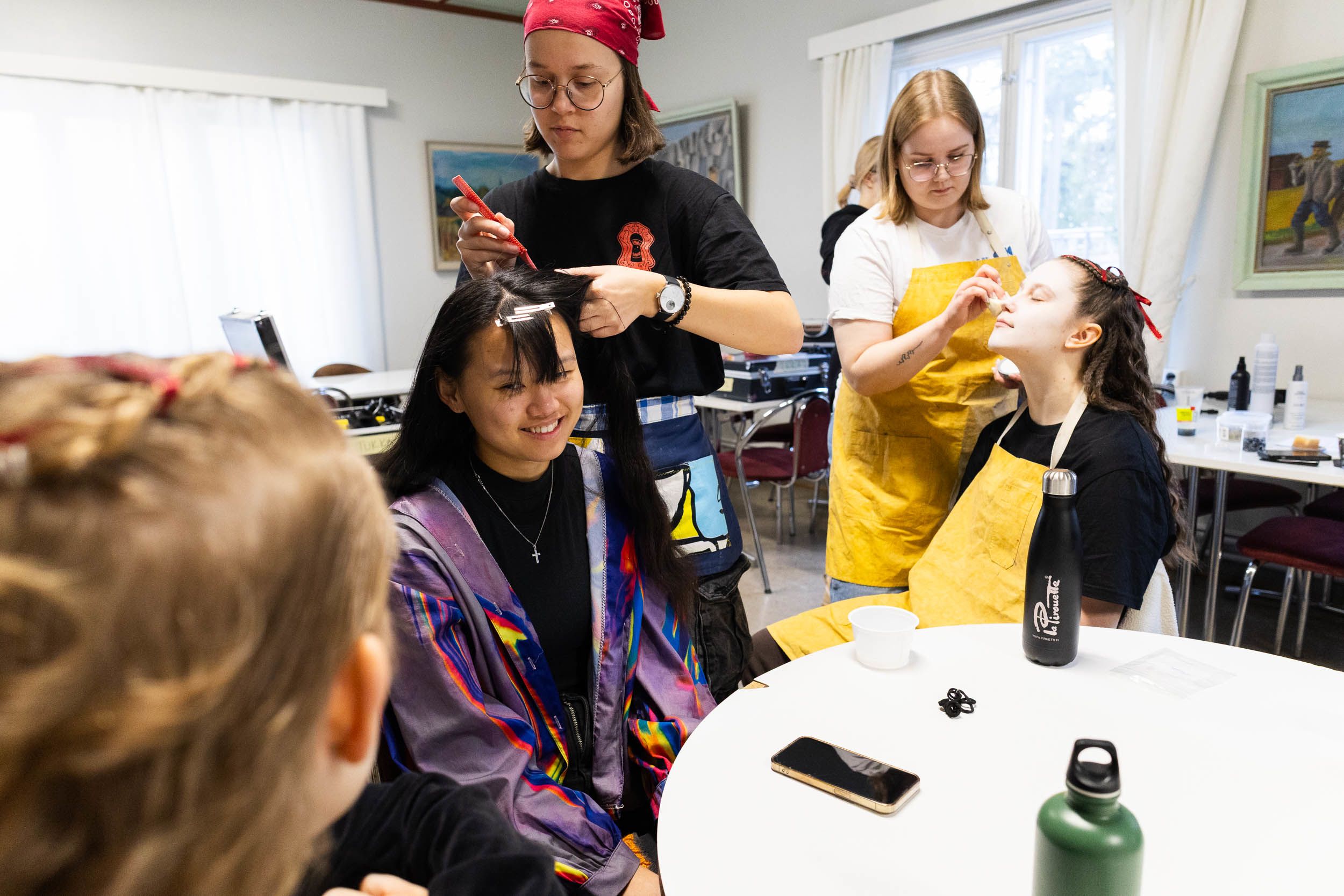 Ella Eskelinen aloittaa Adelia Aallon kampauksen tekemistä. Oikealla Annika Aro maskeeraa tanssija Sanna Väkipartaa.