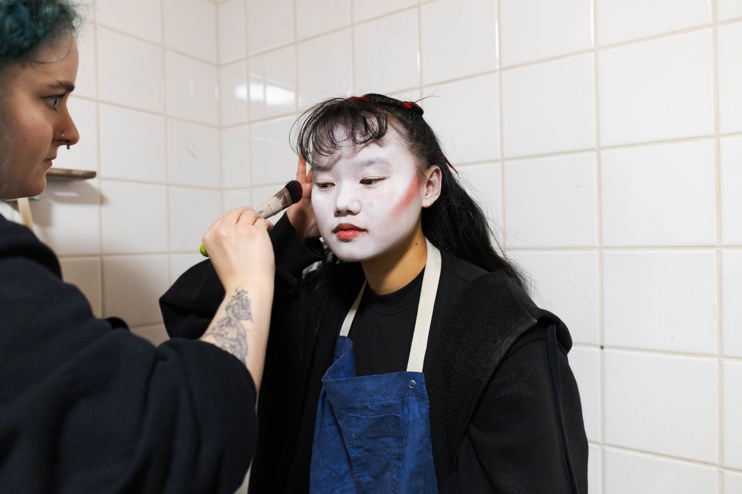 Maskeeraus joudutaan tilanpuutteen vuoksi tekemään takatilojen suihkussa. Maskeeraaja Johanna Mustonen tekee Aallon pohjameikkiä.