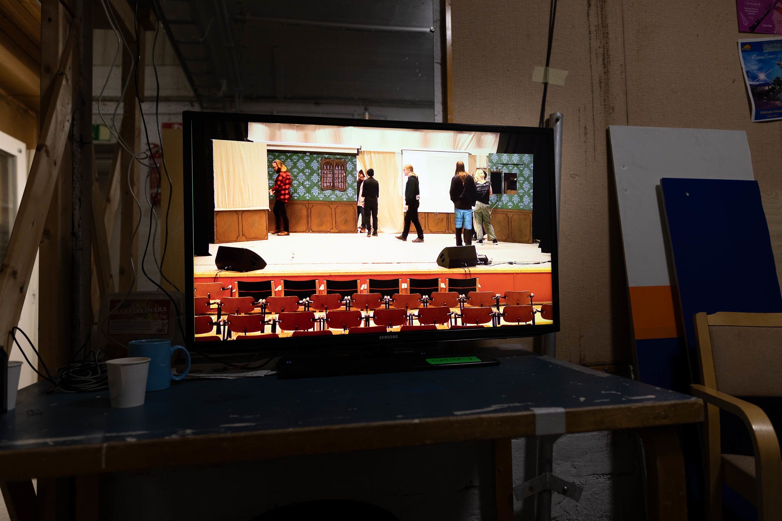 Takahuoneen näyttö laitetaan päälle hetken ennen esitystä. Siitä esiintyjät näkevät lavan tapahtumat.
