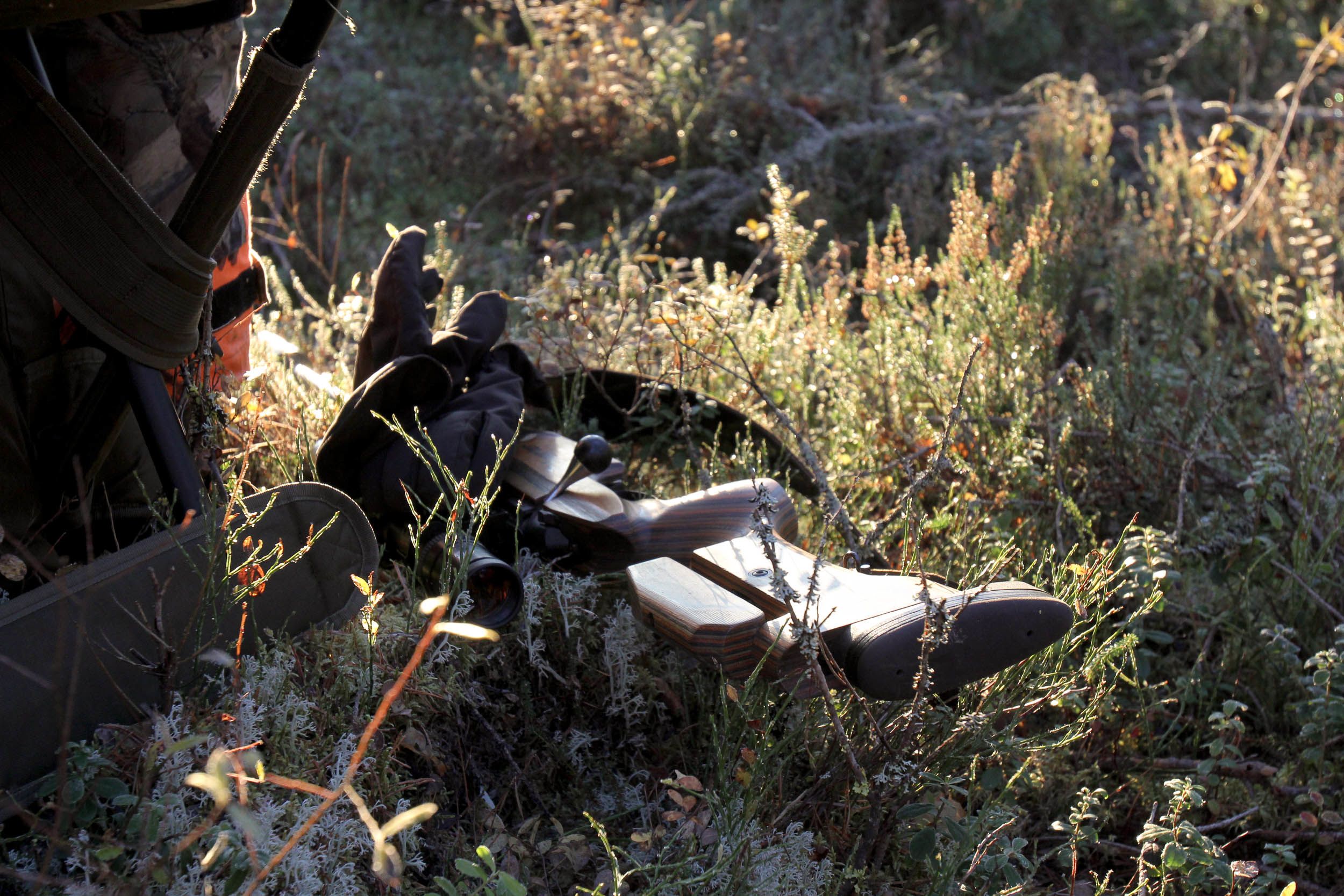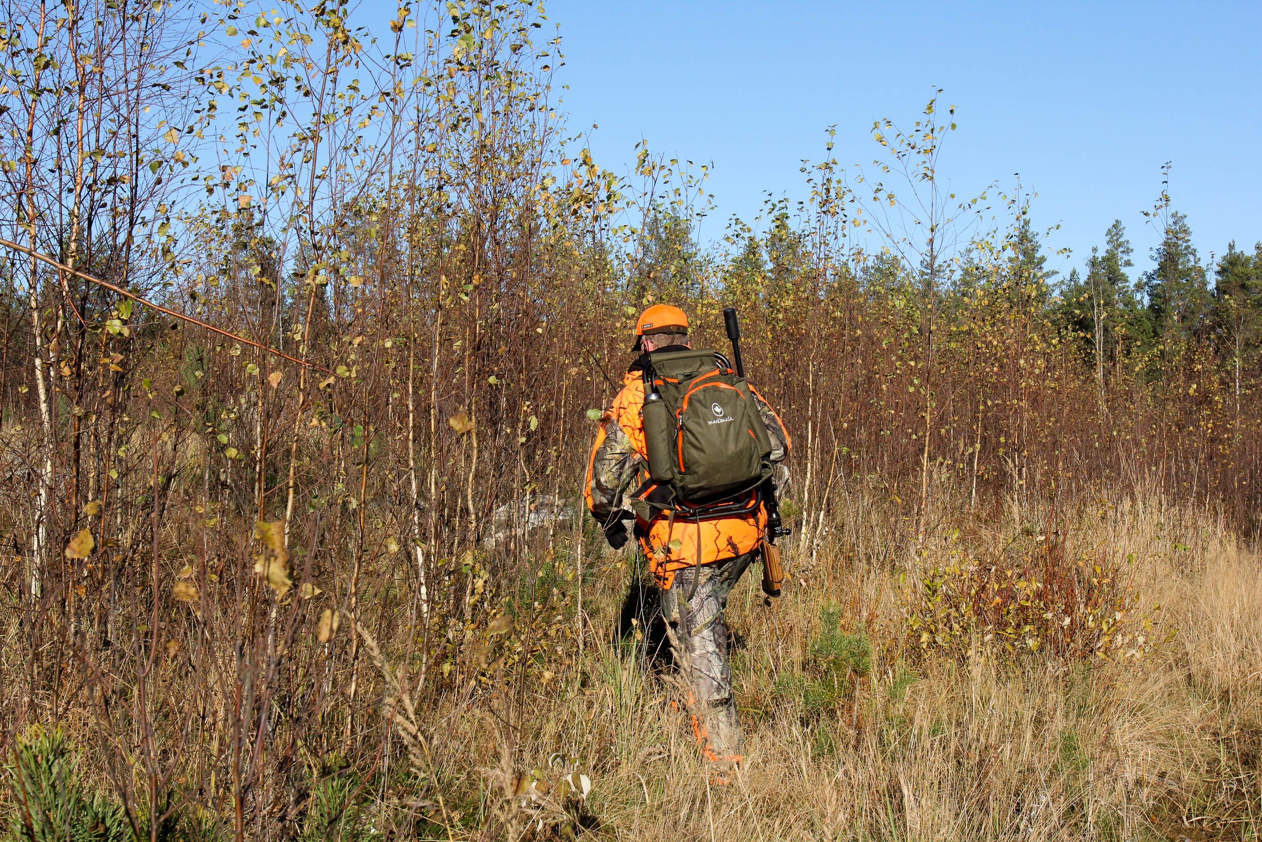 – Mukana tuolla pussissa, vastaan. Turvallisuussyistä metsästysvaatteiden näkyvästä pinnasta kaksi kolmasosaa tulee olla oranssia huomioväriä.