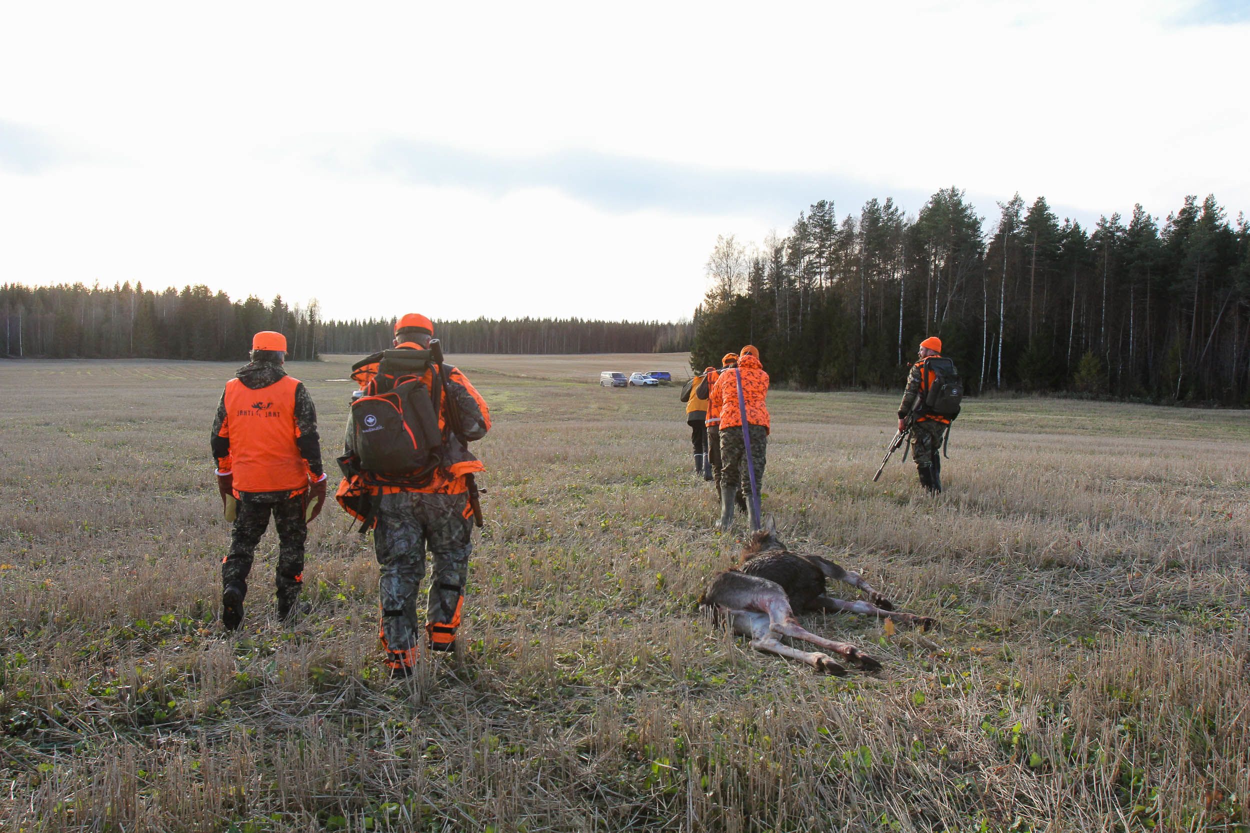 Saavumme majalle juuri ajallaan. Astumme ovesta sisään, ja tupa on täynnä oransseihin vaatteisiin sonnustautuneita miehiä. Ympärillä kuuluu puheensorinaa ja naurun röhähdyksiä. Hirvenmetsästyksellä on maaseudulla merkittävä yhteisöllinen vaikutus. Seinillä näkyy eläinten taljoja ja takassa rätisee tuli.