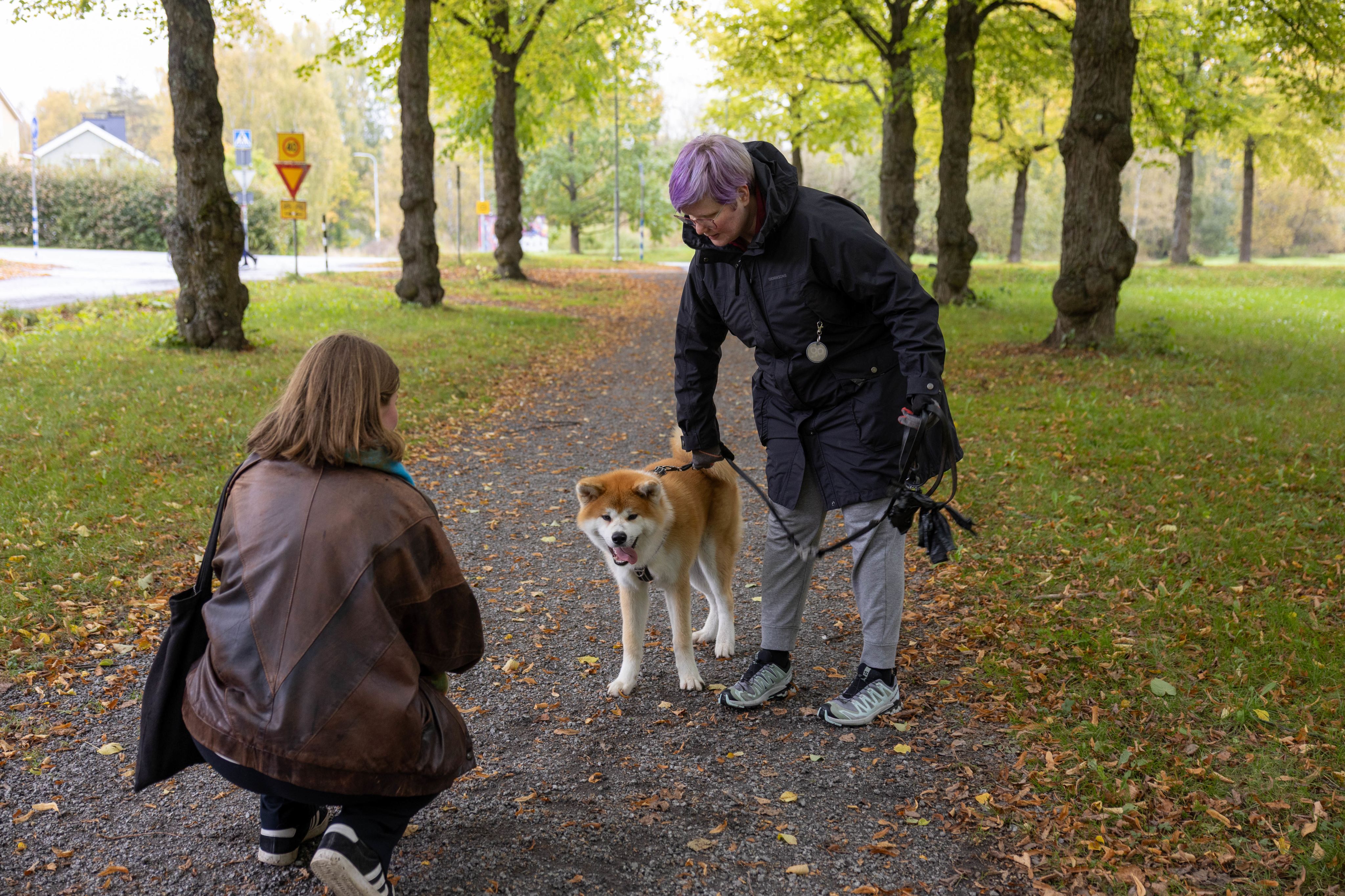 Puistosta löydämme puolivuotiasta akitapentuaan ulkoiluttavan Mari Mesirannan. Yllätykseksemme myös hän suostuu päästämään meidät kotiinsa.