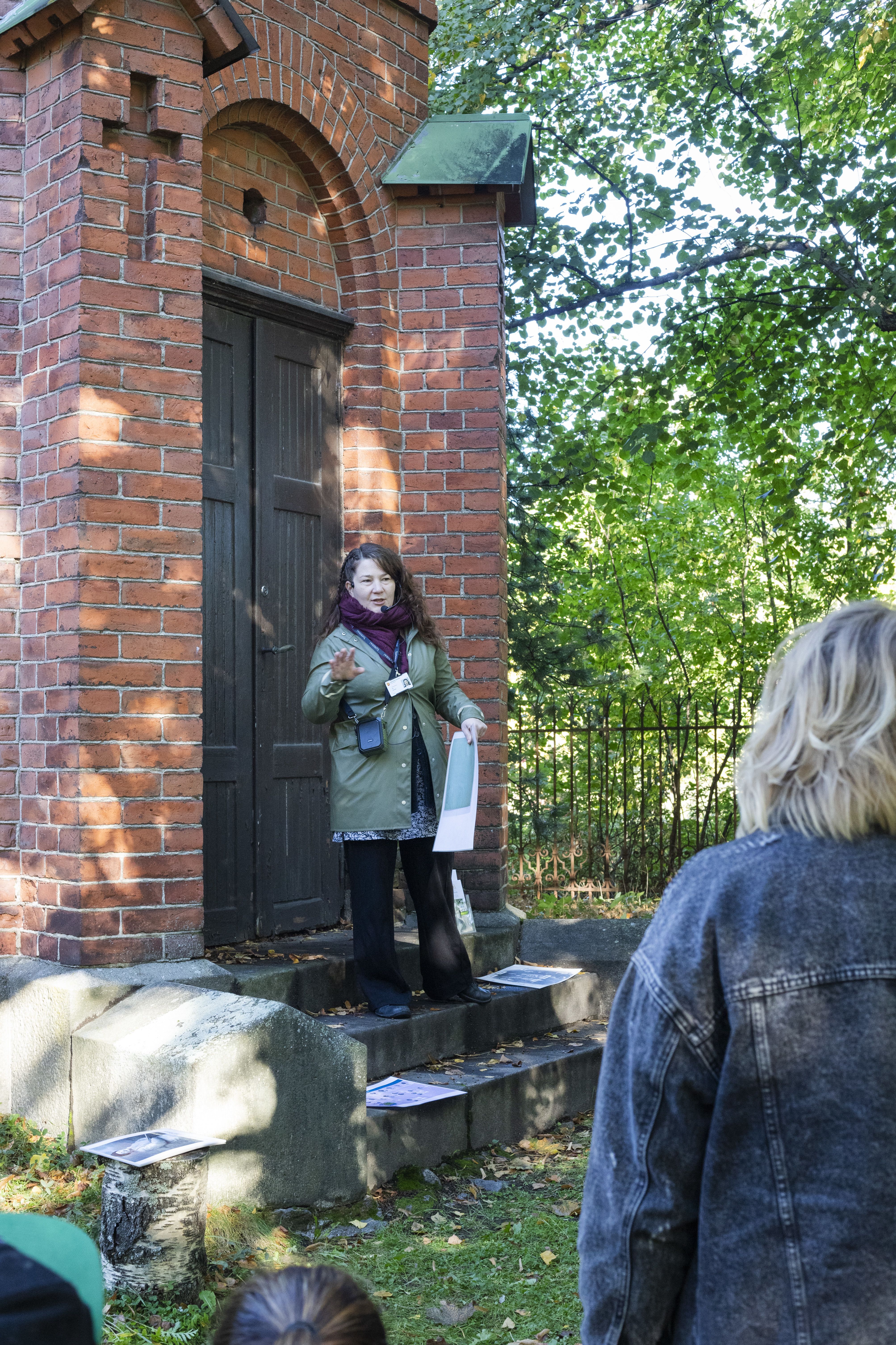 Ensimmäinen kierros on loppumaisillaan, ja uudet kävijät kurkistelevat hautuumaalle kiinnostuneina. Vaikka Tampereen päivä saattaa houkutella enimmäkseen paikallisia, on ulkopaikkakuntalaisiakin saapunut kuulemaan von Nottbeckeista.