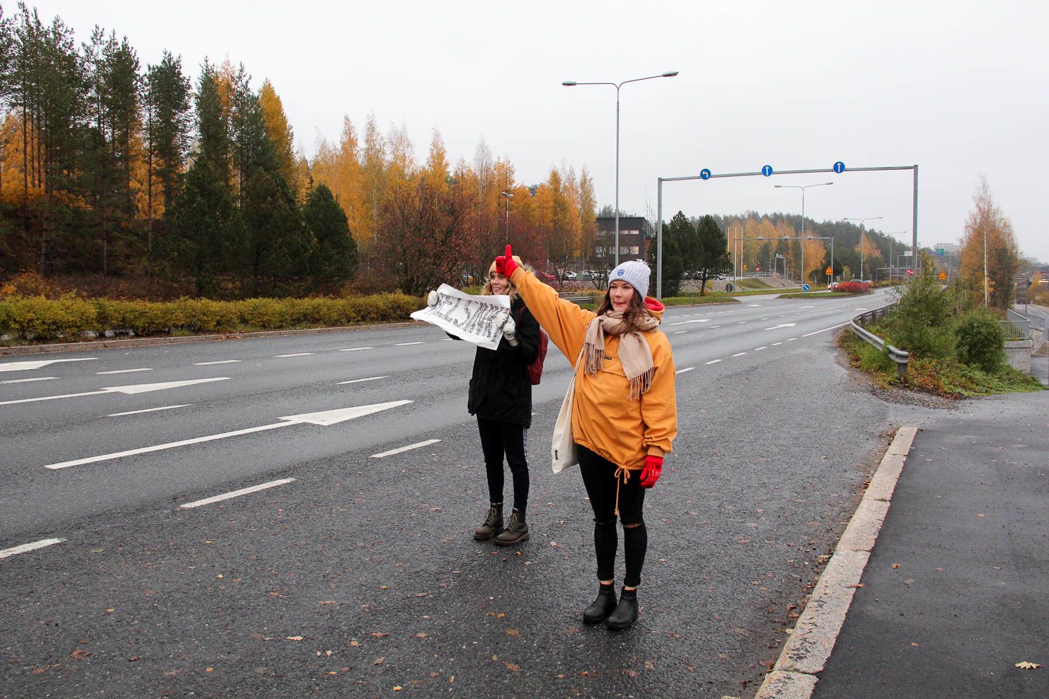 Kun kyltti on valmis ja rulla takaisin laukussa, voidaan lähteä metsästämään parasta mahdollista liftauspaikkaa. Rinkisen ja Halosen mukaan keskustasta kukaan ottaa harvoin kyytiin, minkä vuoksi kannattaa siirtyä kauemmaksi ison tien varrelle.