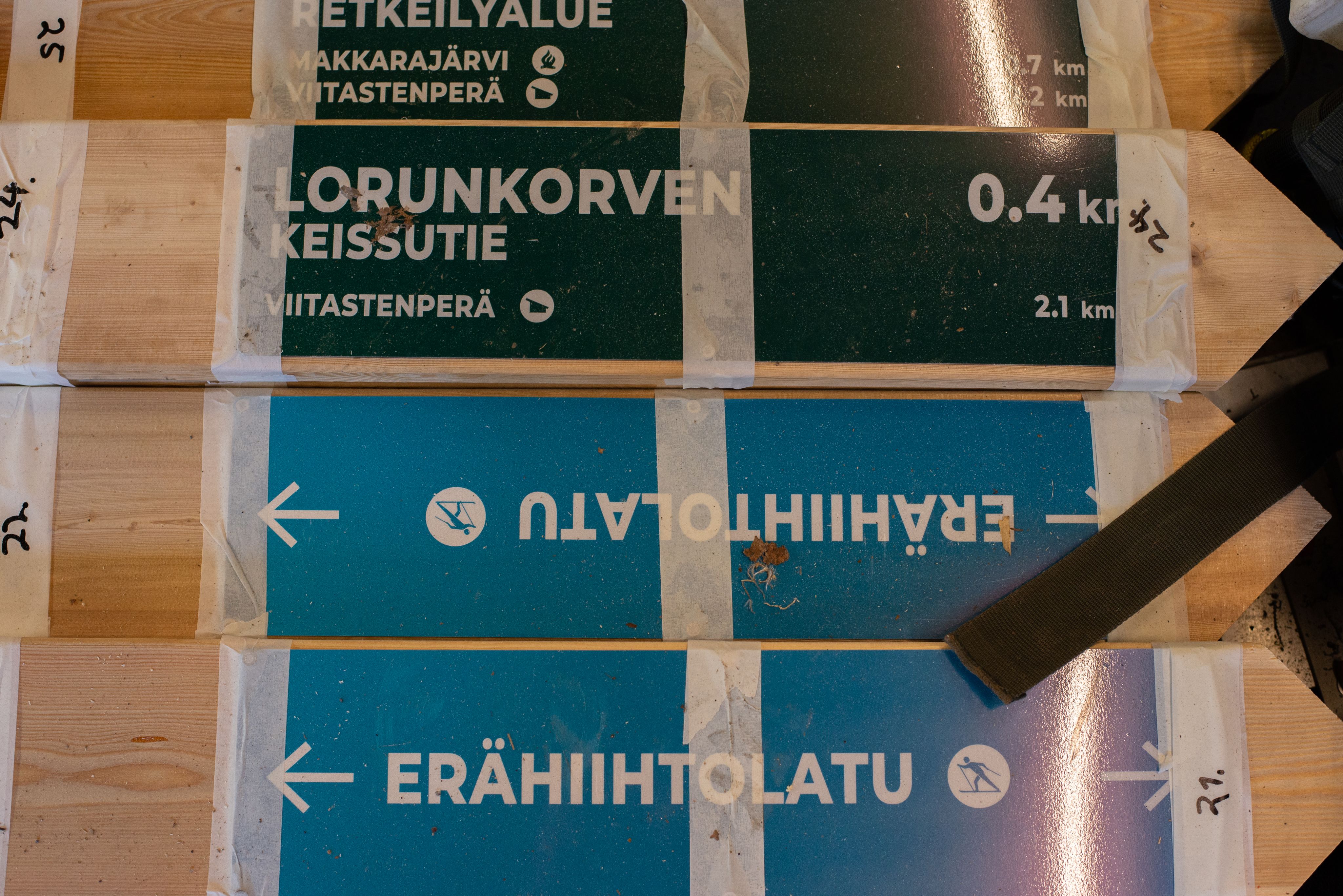 Retkeilyreittien ja latujen viitat odottavat asennustaan Ekokumppanien hallilla Tampereella.