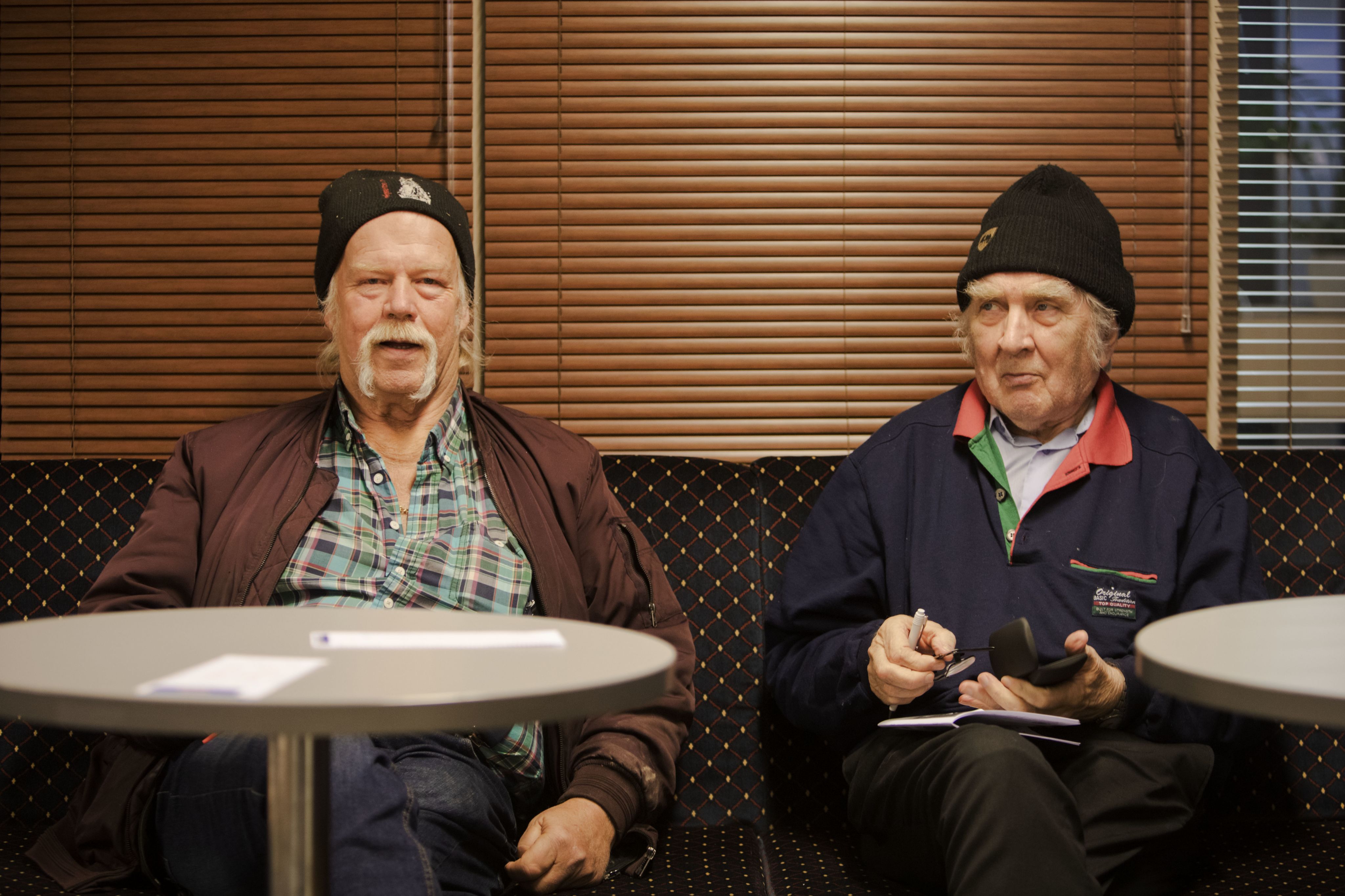 Paroni-nimellä esittäytyvä Martti Lehtonen (vas.) käy ystävänsä Eino Rintalan kanssa raveissa joka viikko. Lehtonen tutustui ensimmäistä kertaa lajiin vuonna 1963 ja on itsekin omistanut hevosia. Hän kertoo jättäneensä Teivon ravit välistä vain kaksi kertaa.