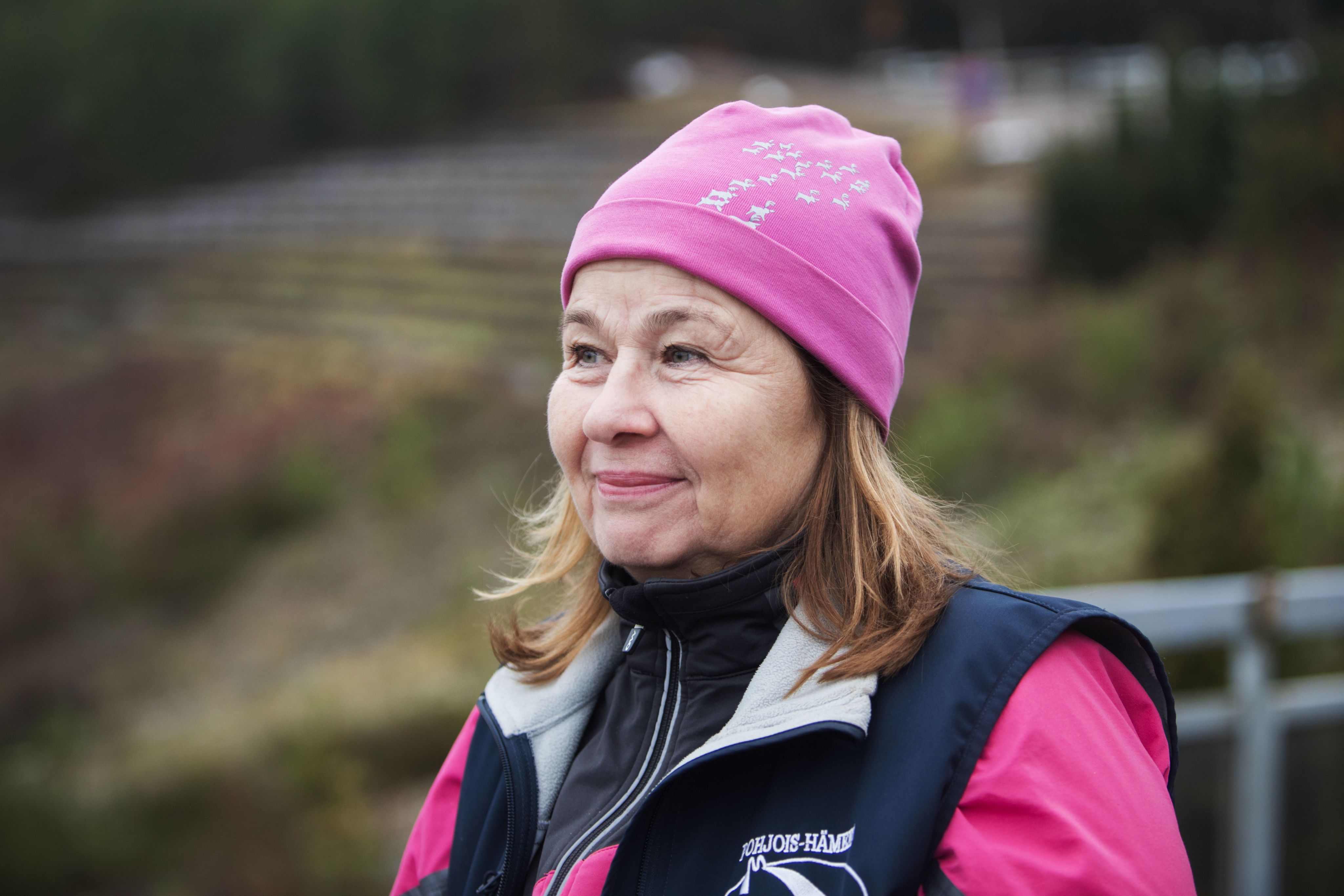 Marjo Sarkanen kannustaa tuttunsa hevosta kisassa. Hän on seurannut raveja lapsesta saakka ja on nykyisin mukana Pohjois-Hämeen Ravinaisten yhdistystoiminnassa. Sen myötä hän tekee raveissa monenlaisia talkootöitä.