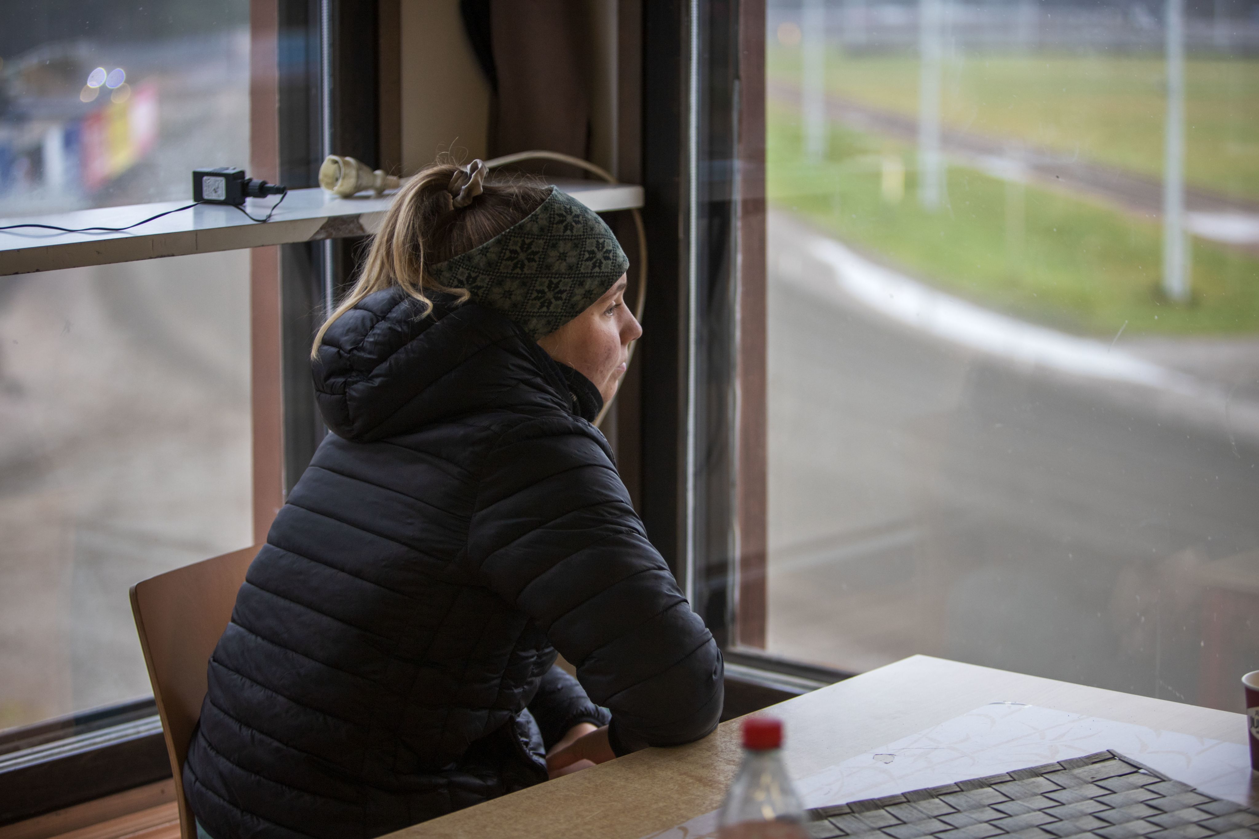 Reeta Heino puolestaan seuraa kisaa kahvion ikkunasta.