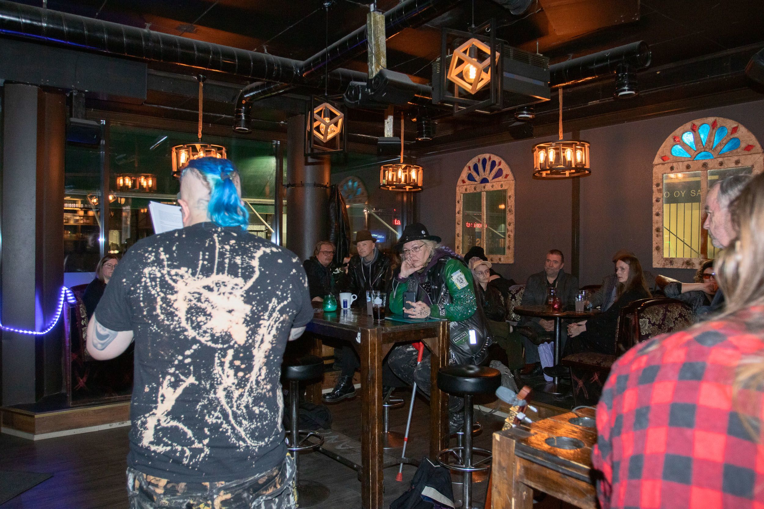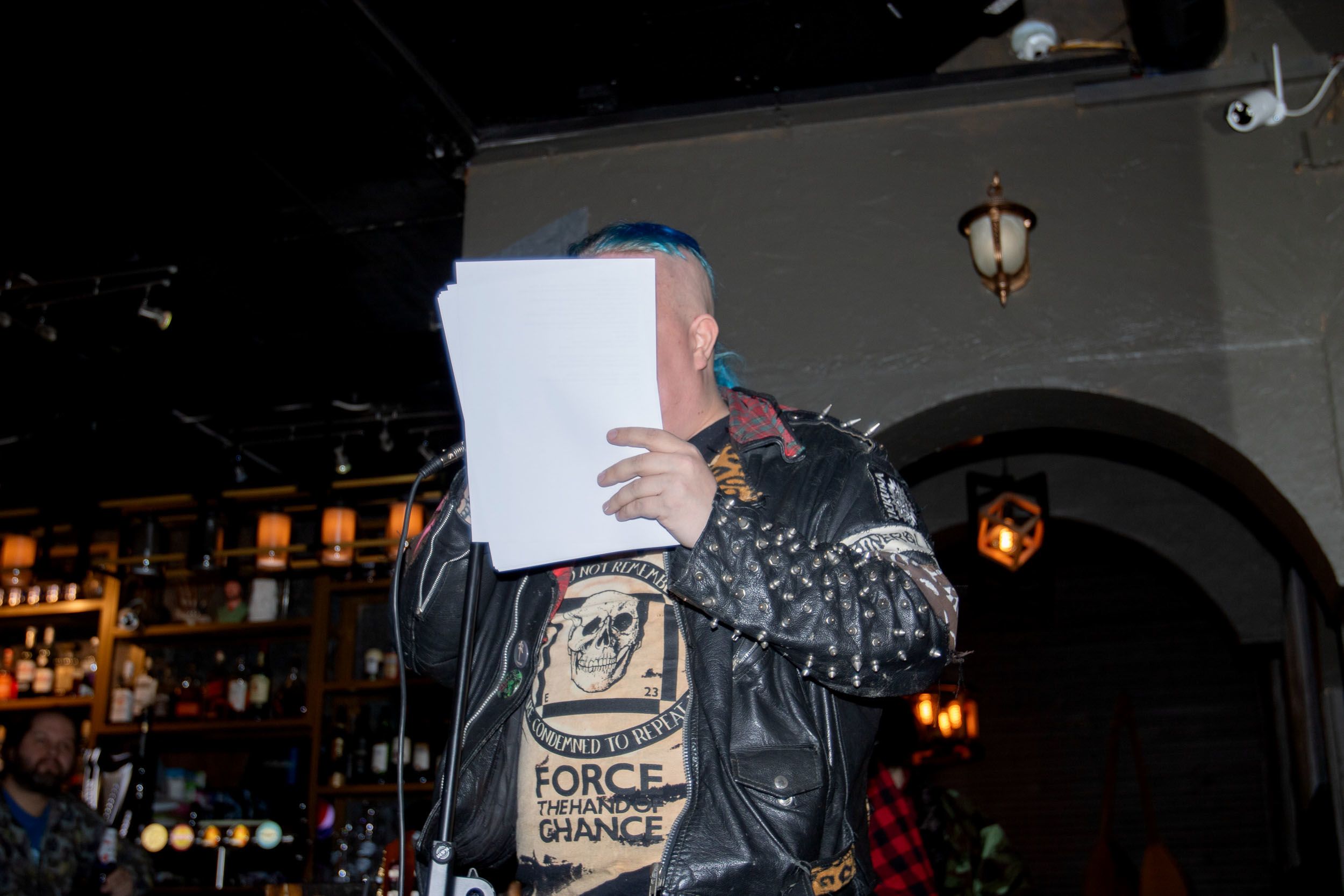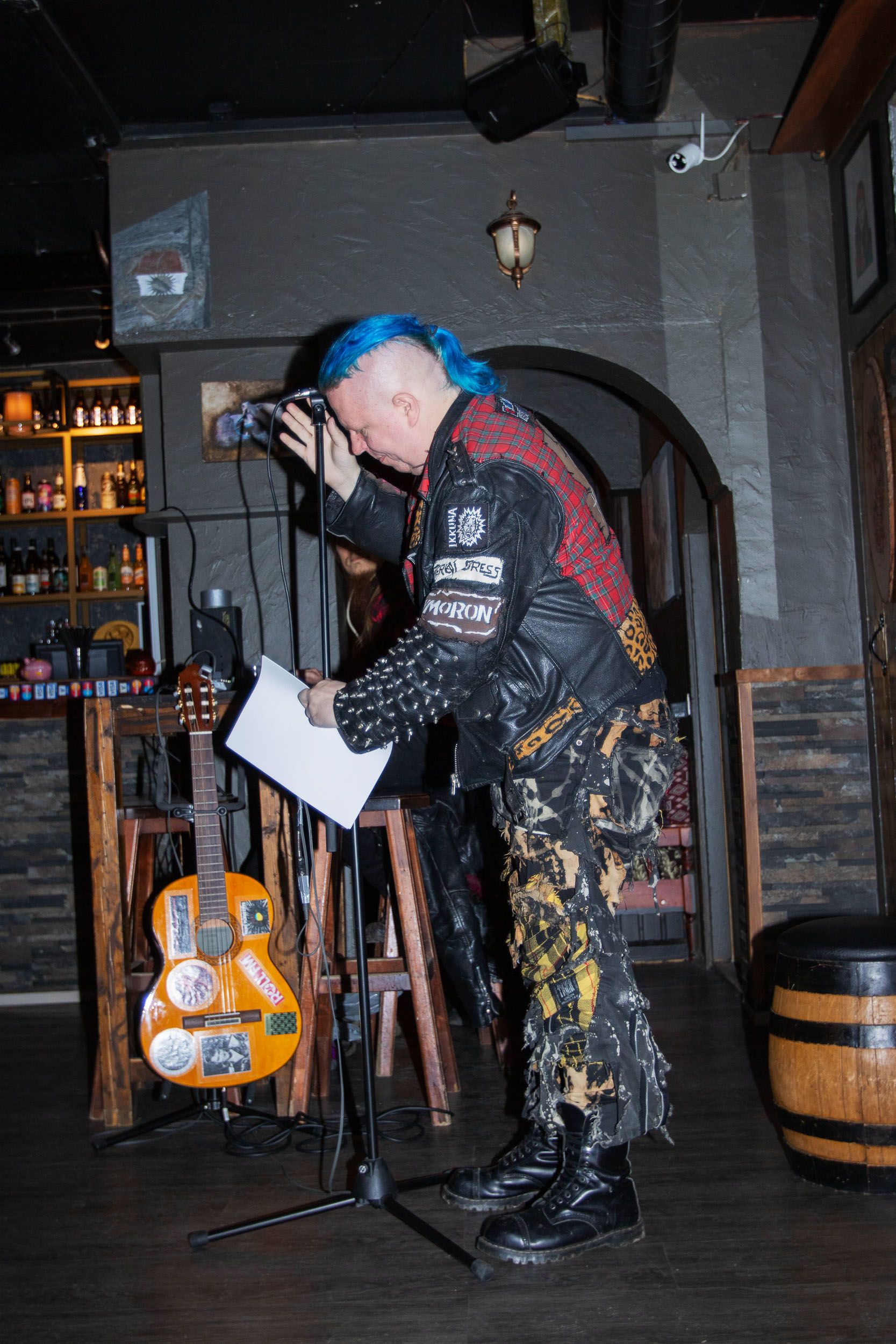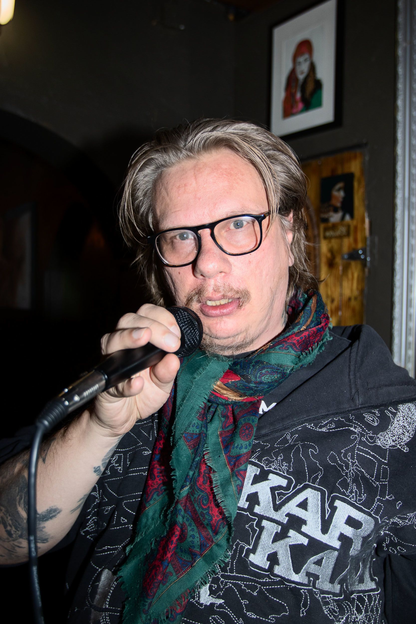 Porilainen Sami Syysmetsä on saapunut Virvatuliklubille esittämään sekä runoja että Kiljumekanismi-yhtyeensä sanoituksia.