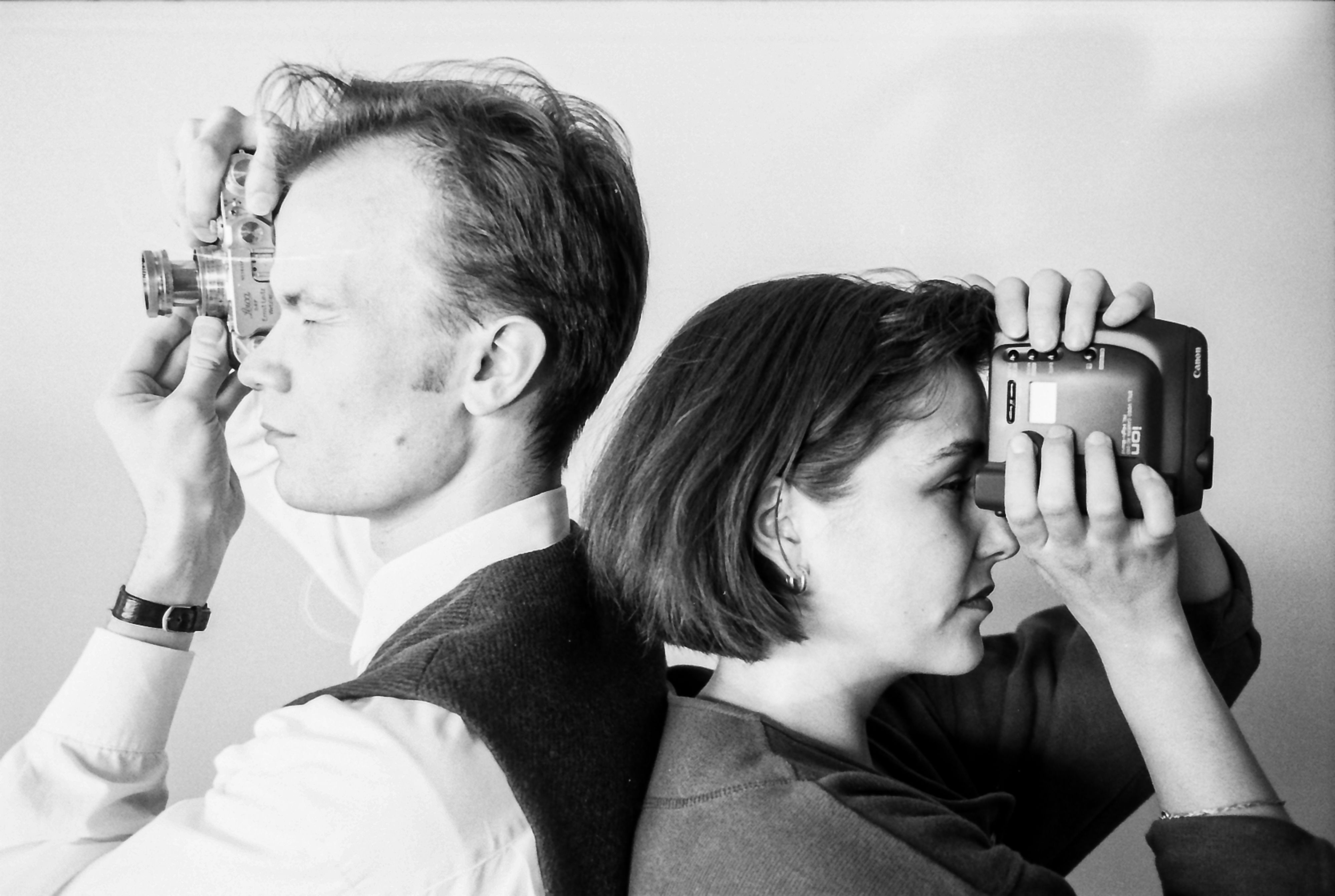 Valokuvauskurssilaiset Kirsi Jansa ja Kimmo Kiimalainen testaamassa Canonin varhaista digikameraa ja 1940-luvun klassista Leicaa.