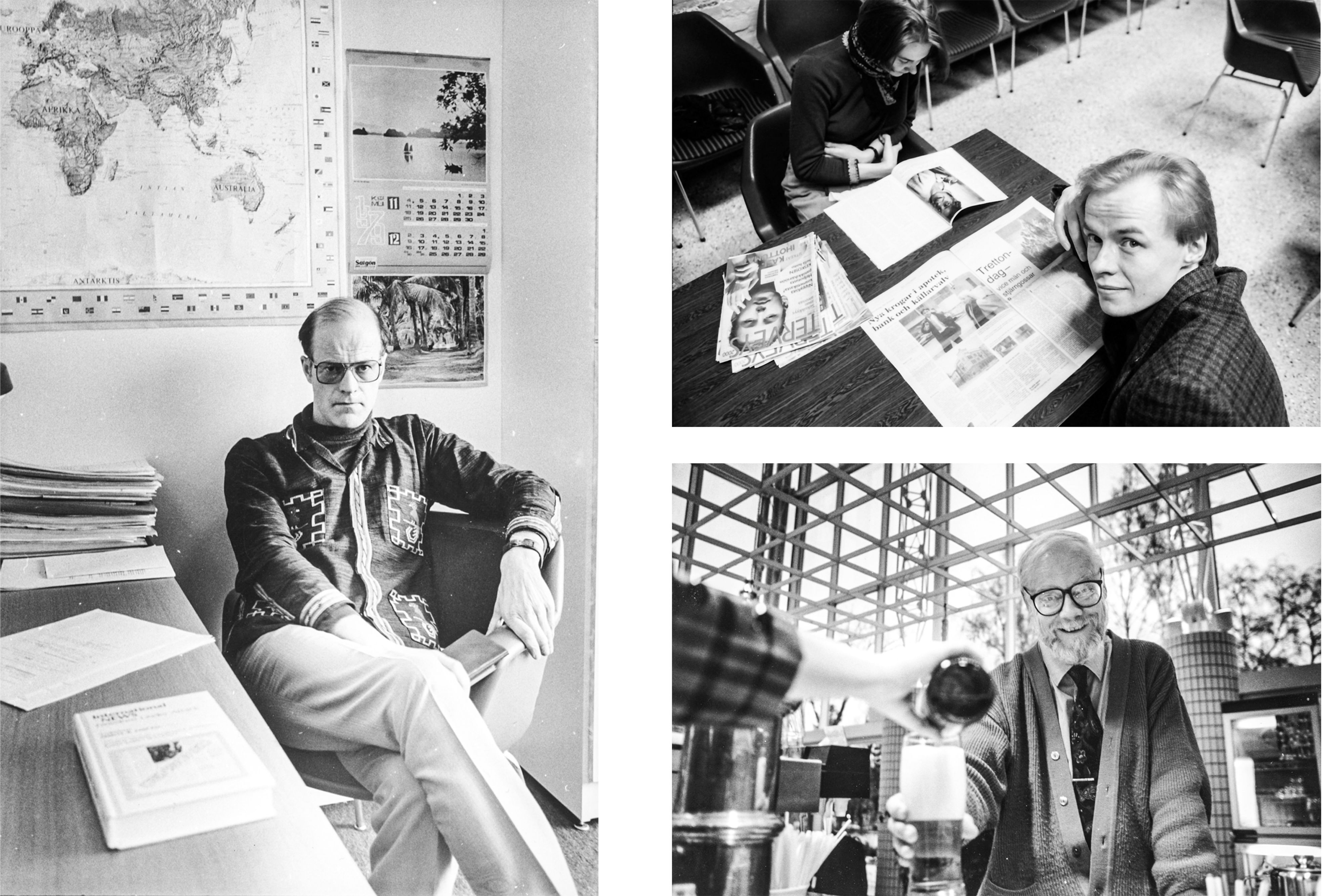 Kuvissa kolme professoria entisen kuvajournalismin professorin Hannu Vanhasen arkistosta. Vasemmalla Kaarle Nordenstreng työhuoneessaan C-siivessä 1977, tuolloinen väitöskirjatutkija Risto Kunelius työn ääressä vuonna 1993 ja Pertti Hemánus oluella Tampere-talolla 1993.