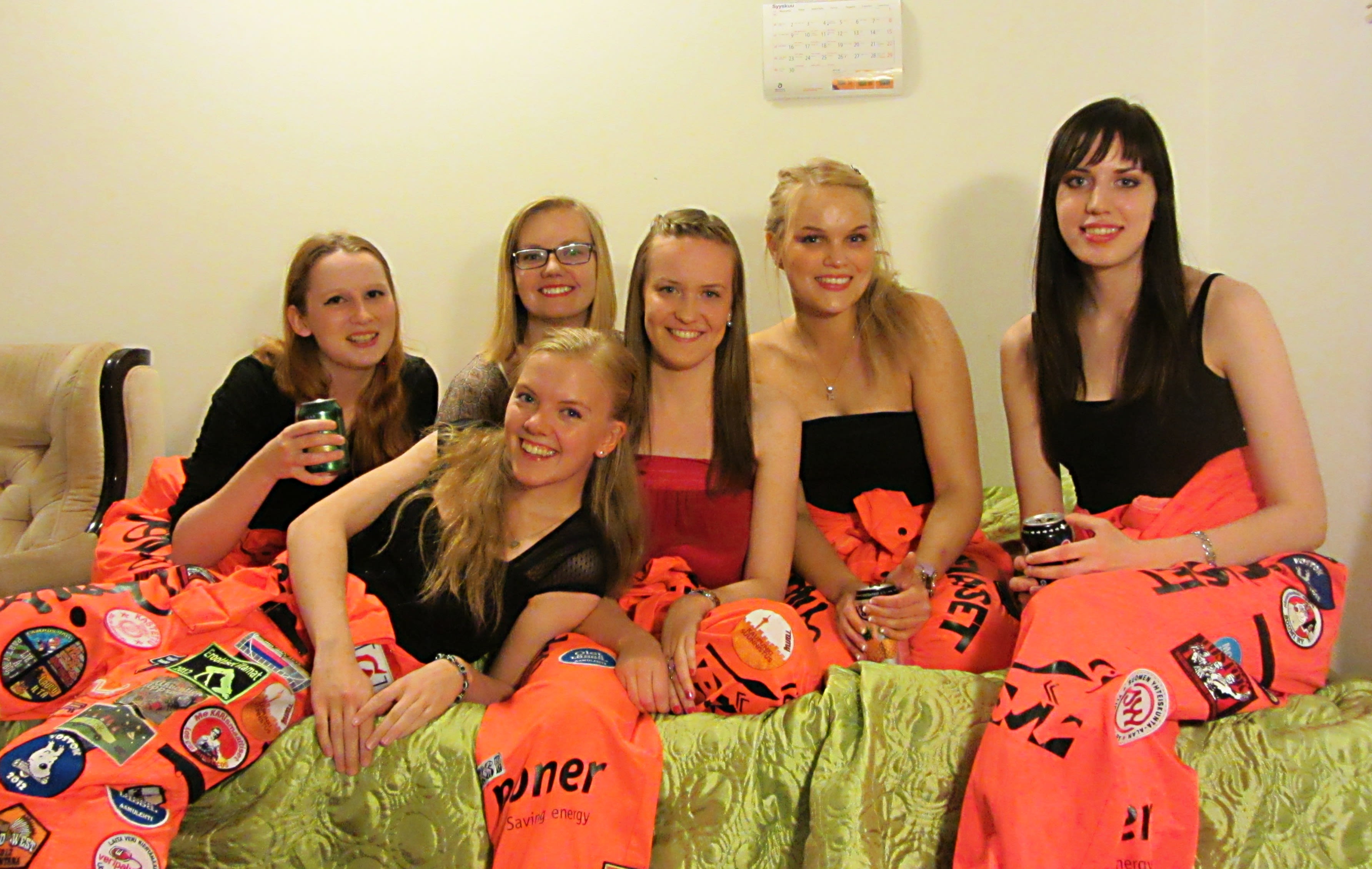Vuosikurssin 2012 vostokit illanvietossa haalareineen vuonna 2013. Vasemmalta Sofia Tiira, Krista Kierikka (edessä), Laura Ikävalko, Niina Kellinsalmi, Senni Luttinen ja Marianne Korhonen.